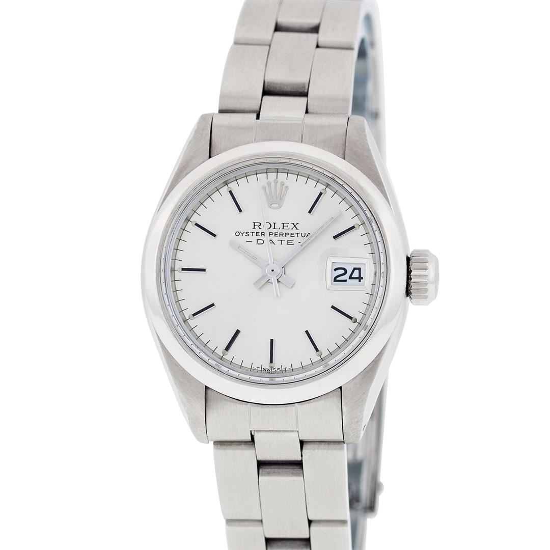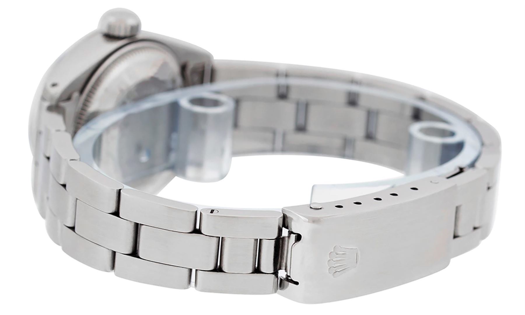 One Ladies Stainless Steel Rolex Datejust Polished Bright with Satin Finish, Serviced & Electronically Tested, Stainless Steel Case: 26mm, Stainless Steel Crown, Bezel: Stainless Steel Smooth Bezel. Custom Crystal: New Acrylic Cyclops Lens. Custom Hands: New Luminescent Hands. Movement: Automatic Winding Movement.. Dial: Silver Index Dial. Date Window: 3 O'clock Position Date Display, Model: Datejust. Condition: G-6 Extra Fine. Bracelet: Stainless Steel Oyster Band. Bright Polish & Satin Finish. 6.0 Inch Length, Adjustable. Standard Clasp, With Rolex Logo. This Watch Has Been Serviced Time Tested And Is In Excellent Condition It Is Free Of All Scratches And Dents.