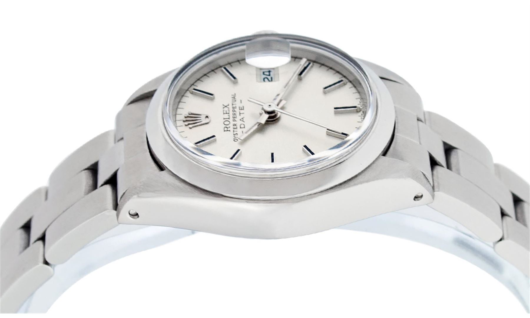 One Ladies Stainless Steel Rolex Datejust Polished Bright with Satin Finish, Serviced & Electronically Tested, Stainless Steel Case: 26mm, Stainless Steel Crown, Bezel: Stainless Steel Smooth Bezel. Custom Crystal: New Acrylic Cyclops Lens. Custom Hands: New Luminescent Hands. Movement: Automatic Winding Movement Caliber 2030. Dial: Silver Index Dial. Date Window: 3 O'Clock Position Date Display, Model: Datejust. Condition: G-6 Extra Fine. Bracelet: Stainless Steel Oyster Band. Bright Polish & Satin Finish. 6.0 Inch Length, Adjustable. Standard Clasp, With Rolex Logo. This Watch Has Been Serviced Time Tested And Is In Excellent Condition It Is Free Of All Scratches And Dents.