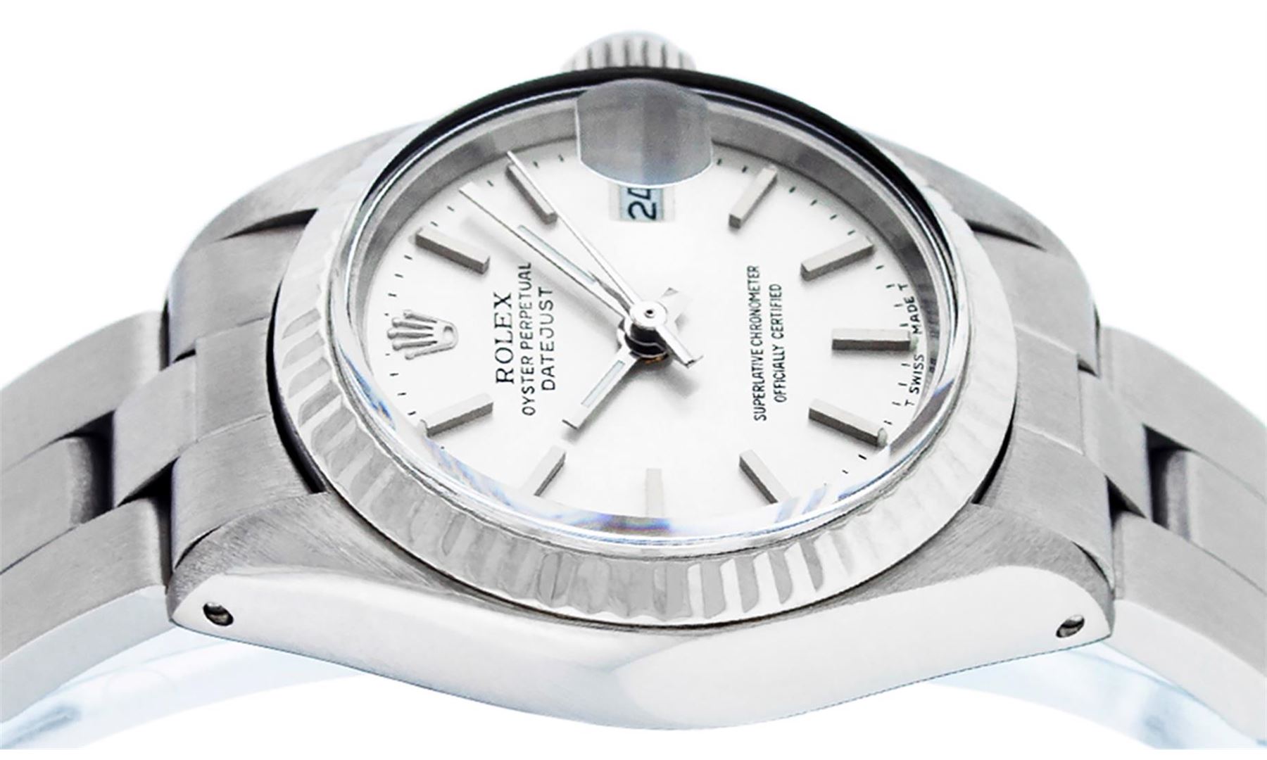 One Ladies Stainless Steel Rolex Datejust Polished Bright with Satin Finish, Serviced & Electronically Tested, Stainless Steel Case: 26mm, Stainless Steel Crown, Bezel: 14K White Gold Fluted Bezel. Custom Crystal: New Acrylic Cyclops Lens. Custom Hands: New Luminescent Hands. Movement: Automatic Winding Movement. Dial: Silver Index Dial. Date Window: 3 O'clock Position Date Display, Model: Datejust. Condition: G-6 Extra Fine. Bracelet: Stainless Steel Oyster Band. Bright Polish & Satin Finish. 6.0 Inch Length, Adjustable. Standard Clasp, With Rolex Logo. This Watch Has Been Serviced Time Tested And Is In Excellent Condition It Is Free Of All Scratches And Dents.