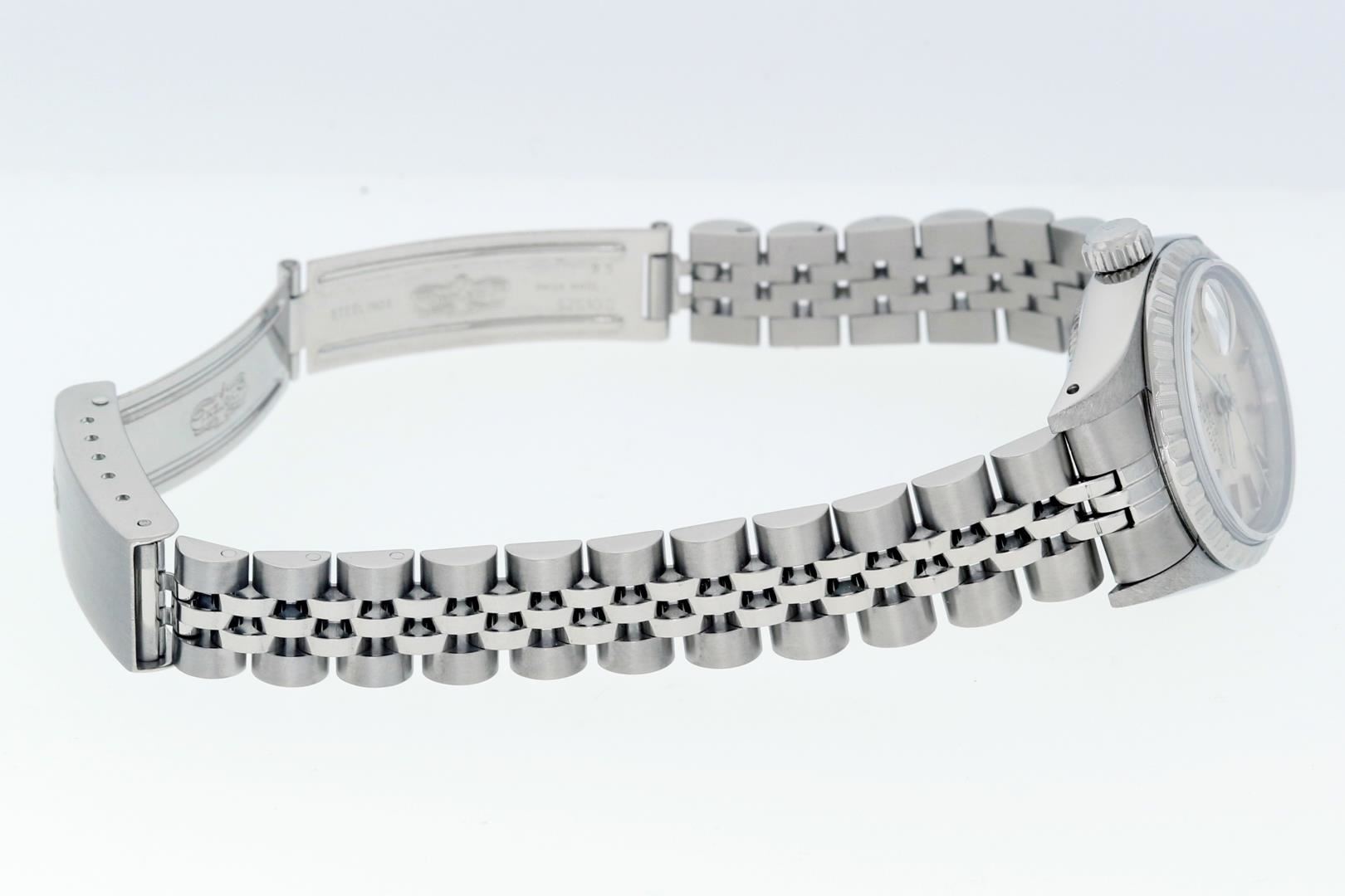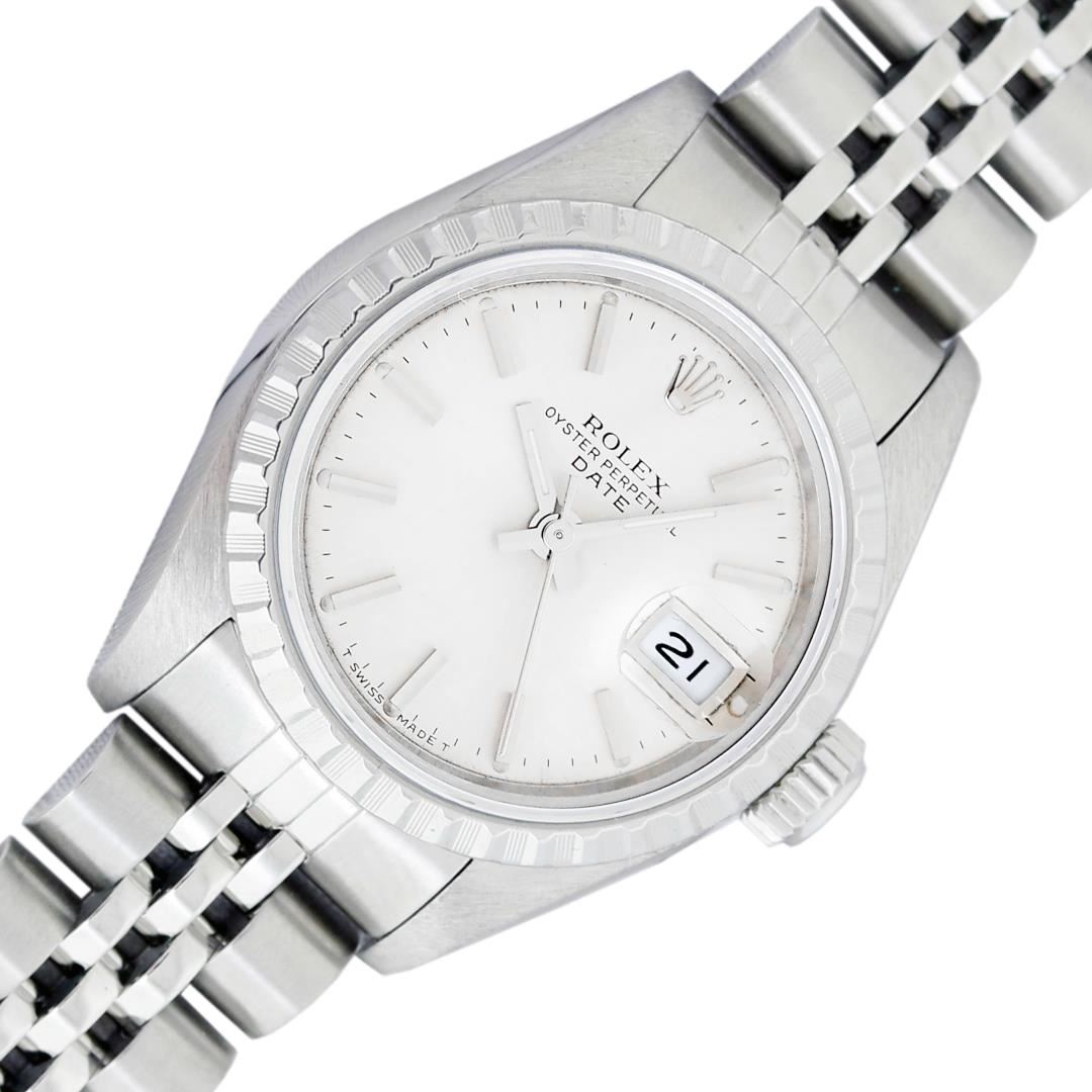 One Ladies Pre Owned Stainless Steel Rolex Date Polished Bright with Satin Finish Serviced & Electronically Tested, Rolex Stainless Steel Case: 26mm, Rolex Stainless Steel Crown, Rolex Bezel: Stainless Steel Engine Turn Bezel. Custom Crystal: New Sapphire With Date Window. Custom Hands: New Luminescent Hands. Rolex Movement: Automatic Winding Movement. Rolex Dial: Silver Index Dial With Dash Track And Lumi Dots. Date Window: 3 O'Clock Position Date Display, Model: Datejust. Condition: G-6 Extra Fine. Rolex Bracelet: Stainless Steel Jubilee Band With Rolex Crown On Buckle. Bright Polish & Satin Finish. Band Length: 6.0 Inch Length, Adjustable. Standard Clasp, With Rolex Logo. This Watch Has Been Serviced Time Tested And Is In Excellent Condition It Is Free Of All Scratches And Dents.
