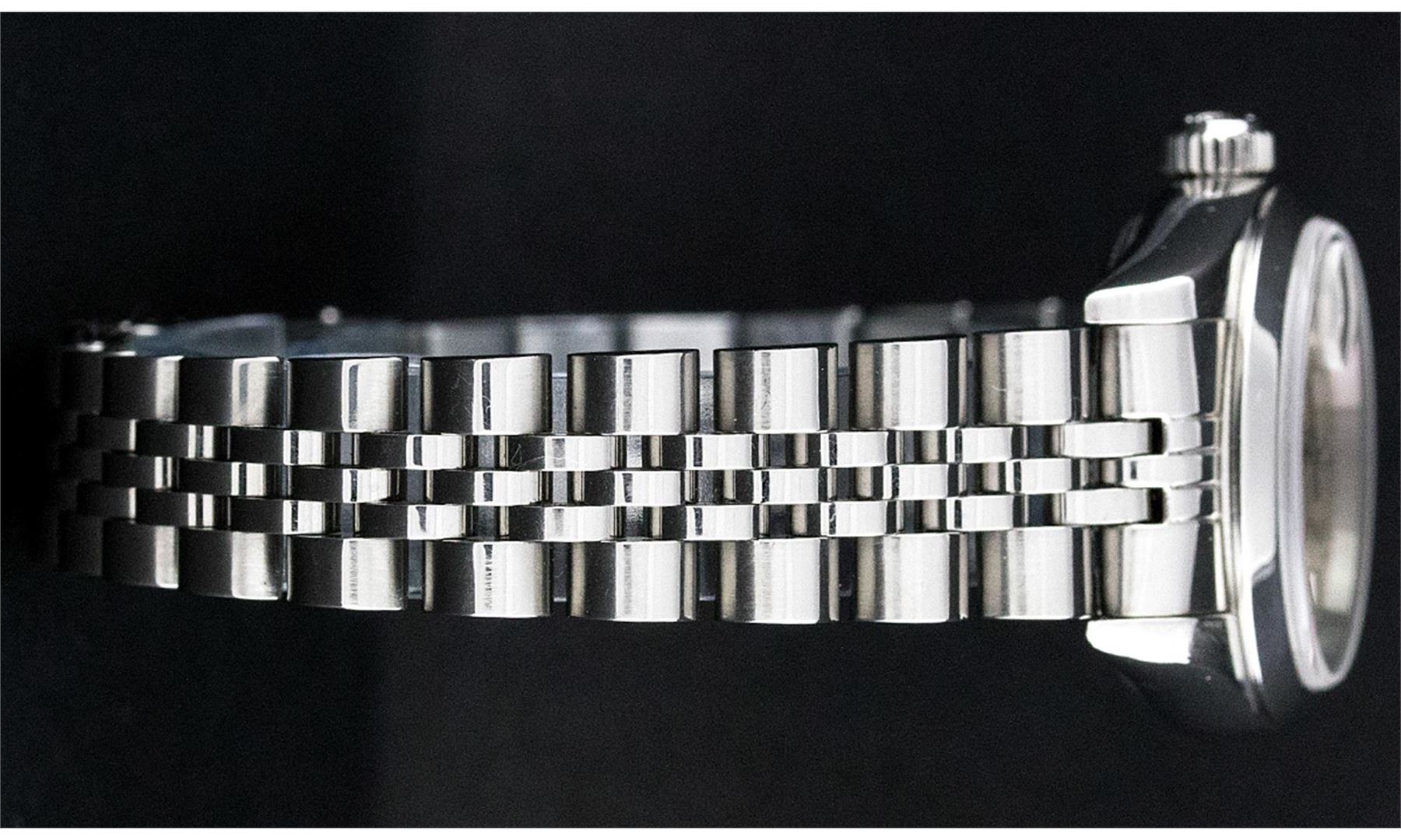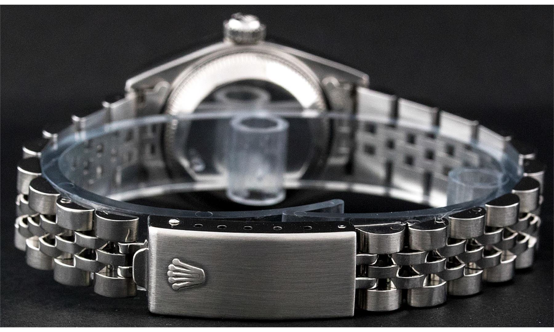 One Ladies Pre Owned Quickset Stainless Steel Rolex Datejust Polished Bright with Satin Finish, Serviced & Electronically Tested, Rolex Stainless Steel Case: 26mm, Rolex Stainless Steel Crown, Rolex Bezel: Stainless Steel Smooth Bezel. Rolex Crystal: Scratch Resistant Sapphire Cyclops Lens. Rolex Hands: Luminescent Hands. Rolex Movement: Automatic Winding Movement. Rolex Dial: Silver Index Dial With Luminescent Dots & Dash Track. Date Window: 3 O'Clock Position Date Display, Model: Quickset Datejust. Condition: G-6 Extra Fine. Rolex Bracelet: Stainless Steel Jubilee Band. Bright Polish & Satin Finish. 6.0 Inch Length, Adjustable. Standard Clasp, With Rolex Logo. This Watch Has Been Serviced Time Tested And Is In Excellent Condition It Is Free Of All Scratches And Dents.