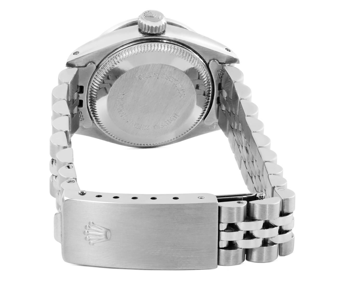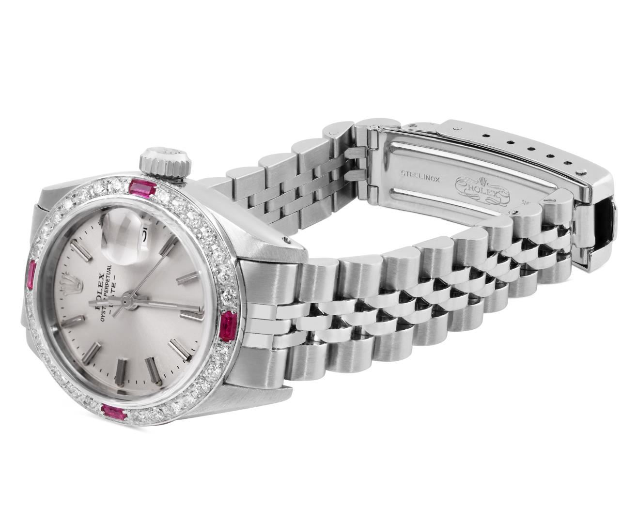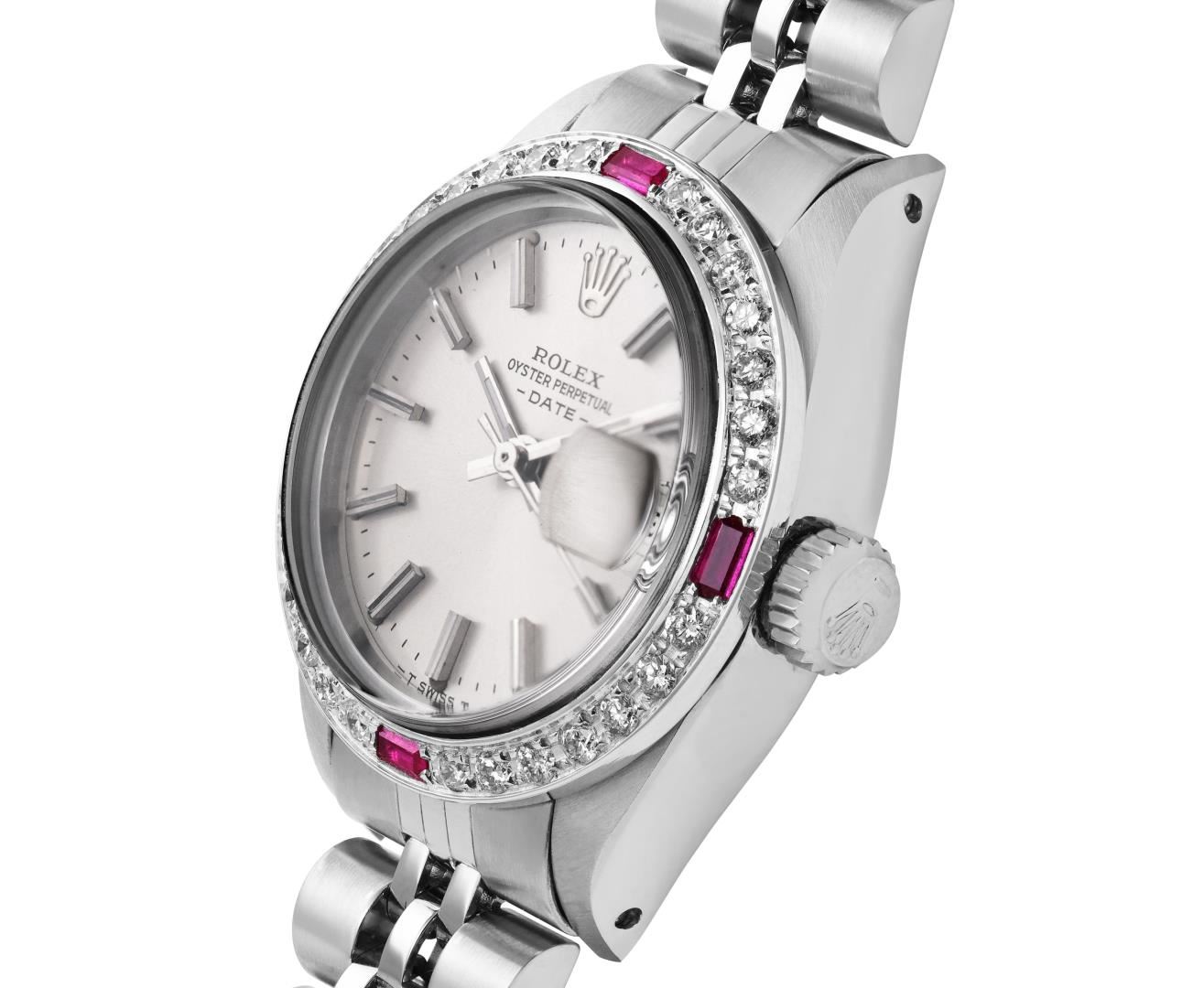 One Rolex Ladies Pre Owned Stainless Steel Date Wristwatch Polished Bright with Satin Finish, Serviced & Electronically Tested, Stainless Steel Case: 26mm, Stainless Steel Crown, Custom Bezel: New 18K White Gold Ruby Beadset Diamond Bezel, Diamond + Gem Count: 36 Diamonds + 4 Rubies, Clarity: SI-VS, Color: G to H. Custom Crystal: New Sapphire With Magnified Date Window. Custom Hands: New Luminescent Hands. Rolex Movement: Automatic Winding Movement 2030. Rolex Dial: Factory Silver Dial With Index Hour Markers and Lumi Markers, Dash Track, and Lumi Dots. Date Window: 3 O'Clock Position Date Display, Model: Date. Condition: G-6 Extra Fine. Rolex Bracelet: Stainless Steel Jubilee Band. Bright Polish & Satin Finish. 6.0 Inch Length, Adjustable. Standard Clasp, With Rolex Logo. This Watch Has Been Serviced Time Tested And Is In Excellent Condition. It Is Free Of All Scratches And Dents.