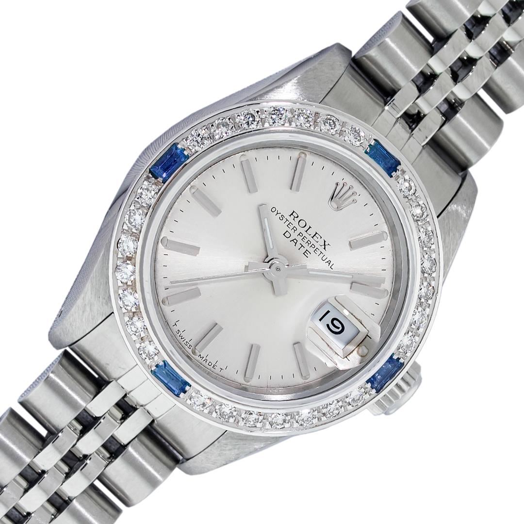 One Ladies Pre Owned Quickset Stainless Steel Rolex Date Polished Bright with Satin Finish Serviced & Electronically Tested, Rolex Stainless Steel Case: 26mm, Rolex Stainless Steel Crown, Custom Bezel: New White Gold Beadset + Sapphire Diamond Bezel, Diamond Count: 28 Diamonds + 4 Sapphires. Custom Crystal: New Sapphire With Date Window. Custom Hands: New Luminescent Hands. Rolex Movement: Automatic Winding Movement. Rolex Dial: Silver Index Dial With Dash Track And Lumi Dot. Date Window: 3 O'Clock Position Date Display, Model: Datejust. Condition: G-6 Extra Fine. Rolex Bracelet: Stainless Steel Jubilee Band With Rolex Crown On Buckle. Bright Polish & Satin Finish. Band Length: 6.0 Inch Length, Adjustable. Standard Clasp, With Rolex Logo. This Watch Has Been Serviced Time Tested And Is In Excellent Condition It Is Free Of All Scratches And Dents.