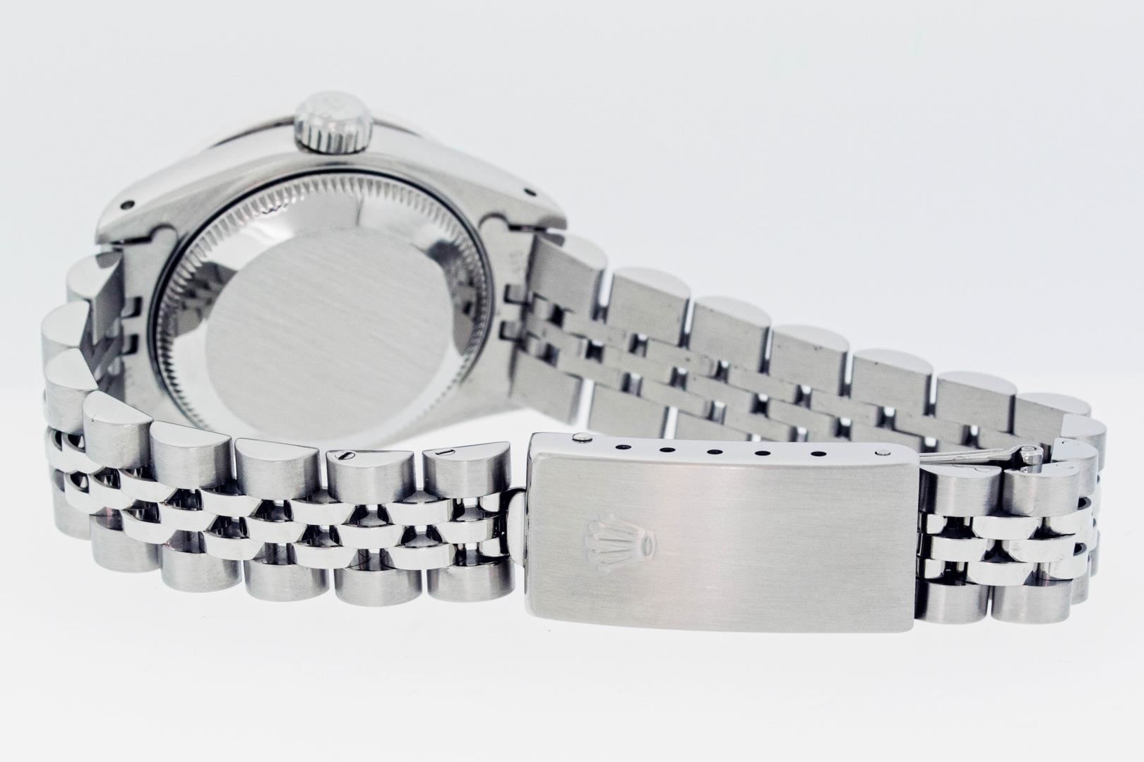 One Ladies Pre Owned Quickset Stainless Steel Rolex Date Polished Bright with Satin Finish Serviced & Electronically Tested, Rolex Stainless Steel Case: 26mm, Rolex Stainless Steel Crown, Custom Bezel: New White Gold Beadset + Sapphire Diamond Bezel, Diamond Count: 28 Diamonds + 4 Sapphires. Custom Crystal: New Sapphire With Date Window. Custom Hands: New Luminescent Hands. Rolex Movement: Automatic Winding Movement. Rolex Dial: Silver Index Dial With Dash Track And Lumi Dot. Date Window: 3 O'Clock Position Date Display, Model: Datejust. Condition: G-6 Extra Fine. Rolex Bracelet: Stainless Steel Jubilee Band With Rolex Crown On Buckle. Bright Polish & Satin Finish. Band Length: 6.0 Inch Length, Adjustable. Standard Clasp, With Rolex Logo. This Watch Has Been Serviced Time Tested And Is In Excellent Condition It Is Free Of All Scratches And Dents.