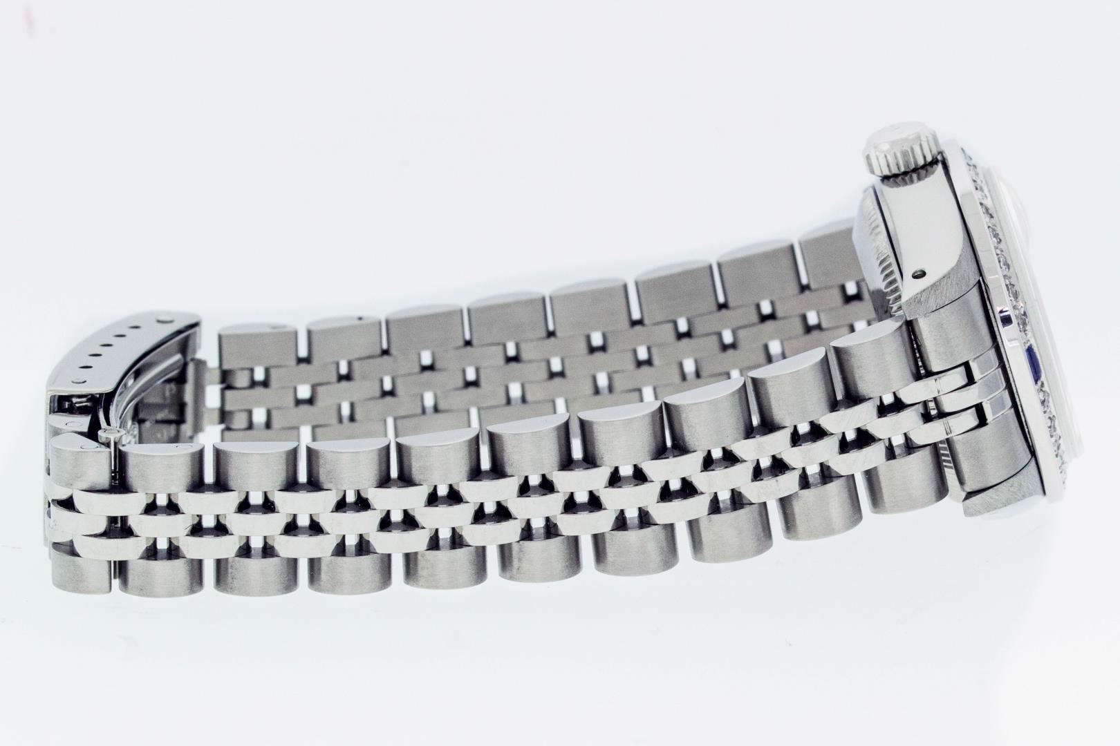 One Ladies Pre Owned Quickset Stainless Steel Rolex Date Polished Bright with Satin Finish Serviced & Electronically Tested, Rolex Stainless Steel Case: 26mm, Rolex Stainless Steel Crown, Custom Bezel: New White Gold Beadset + Sapphire Diamond Bezel, Diamond Count: 28 Diamonds + 4 Sapphires. Custom Crystal: New Sapphire With Date Window. Custom Hands: New Luminescent Hands. Rolex Movement: Automatic Winding Movement. Rolex Dial: Silver Index Dial With Dash Track And Lumi Dot. Date Window: 3 O'Clock Position Date Display, Model: Datejust. Condition: G-6 Extra Fine. Rolex Bracelet: Stainless Steel Jubilee Band With Rolex Crown On Buckle. Bright Polish & Satin Finish. Band Length: 6.0 Inch Length, Adjustable. Standard Clasp, With Rolex Logo. This Watch Has Been Serviced Time Tested And Is In Excellent Condition It Is Free Of All Scratches And Dents.