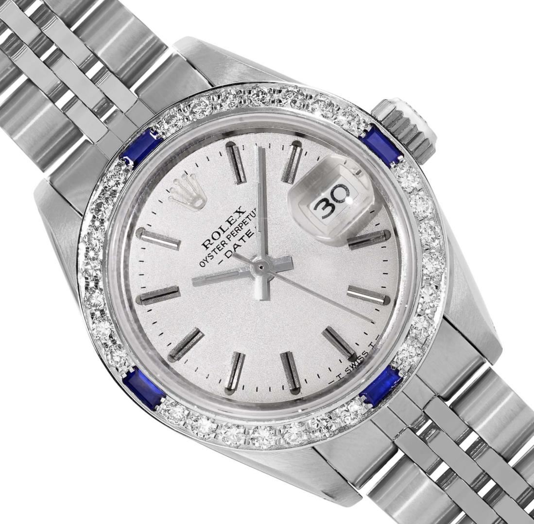 One Rolex Ladies Pre Owned Stainless Steel Date Wristwatch Polished Bright with Satin Finish, Serviced & Electronically Tested, Stainless Steel Case: 26mm, Stainless Steel Crown, Custom Bezel: New 18K White Gold Sapphire Beadset Diamond Bezel, Diamond + Gem Count: 36 Diamonds + 4 Sapphires, Clarity: SI-VS, Color: G to H. Custom Crystal: New Sapphire With Magnified Date Window. Custom Hands: New Luminescent Hands. Rolex Movement: Automatic Winding Movement 2030. Rolex Dial: Factory Silver Dial With Index Hour Markers and Lumi Markers, Dash Track, and Lumi Dots. Date Window: 3 O'Clock Position Date Display, Model: Date. Condition: G-6 Extra Fine. Rolex Bracelet: Stainless Steel Jubilee Band. Bright Polish & Satin Finish. 6.0 Inch Length, Adjustable. Standard Clasp, With Rolex Logo. This Watch Has Been Serviced Time Tested And Is In Excellent Condition. It Is Free Of All Scratches And Dents.