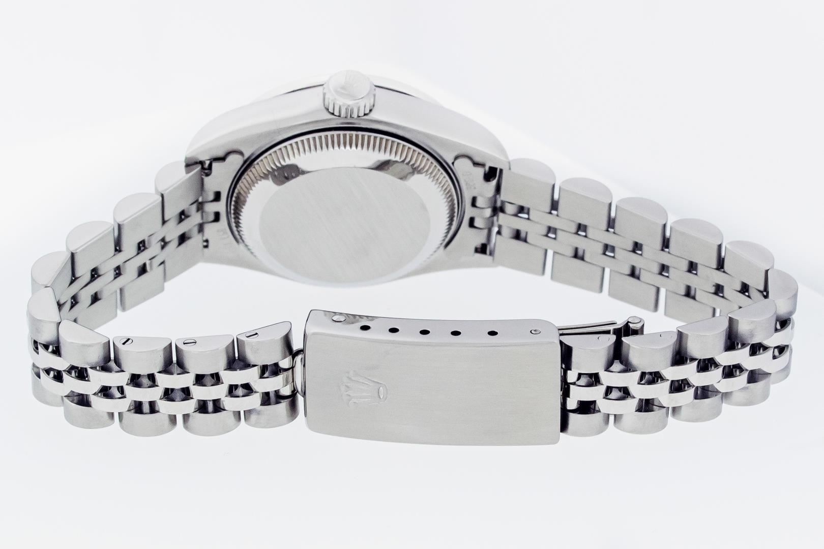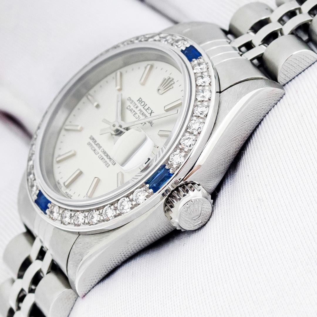 One Ladies Pre Owned Quickset Stainless Steel Rolex Datejust Polished Bright with Satin Finish, Serviced & Electronically Tested, Stainless Steel Case: 26mm, Rolex Stainless Steel Crown, Custom Bezel: New 18K White Gold Sapphire Bead Set Diamond Bezel, Diamond + Gem Count: 28 Diamonds + 4 Sapphires, Clarity: SI-VS, Color: G to H. Custom Crystal: New Sapphire With Magnified Date Window. Custom Hands: New Luminescent Hands. Rolex Movement: Automatic Winding Movement 2235. Rolex Dial: Silver With Index Hour Markers With Dash Track & Lumi Dot. Date Window: 3 O'Clock Position Date Display, Model: Quickset Datejust. Condition: G-6 Extra Fine. Rolex Bracelet: Stainless Steel Jubilee Band. Bright Polish & Satin Finish. 6.0 Inch Length, Adjustable. Standard Clasp, With Rolex Logo. This Watch Has Been Serviced Time Tested And Is In Excellent Condition It Is Free Of All Scratches And Dents.