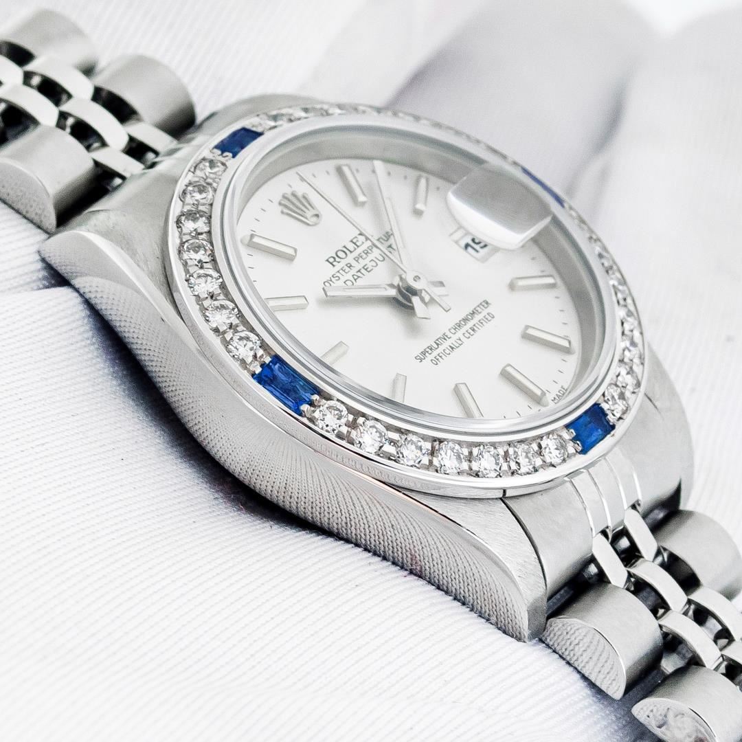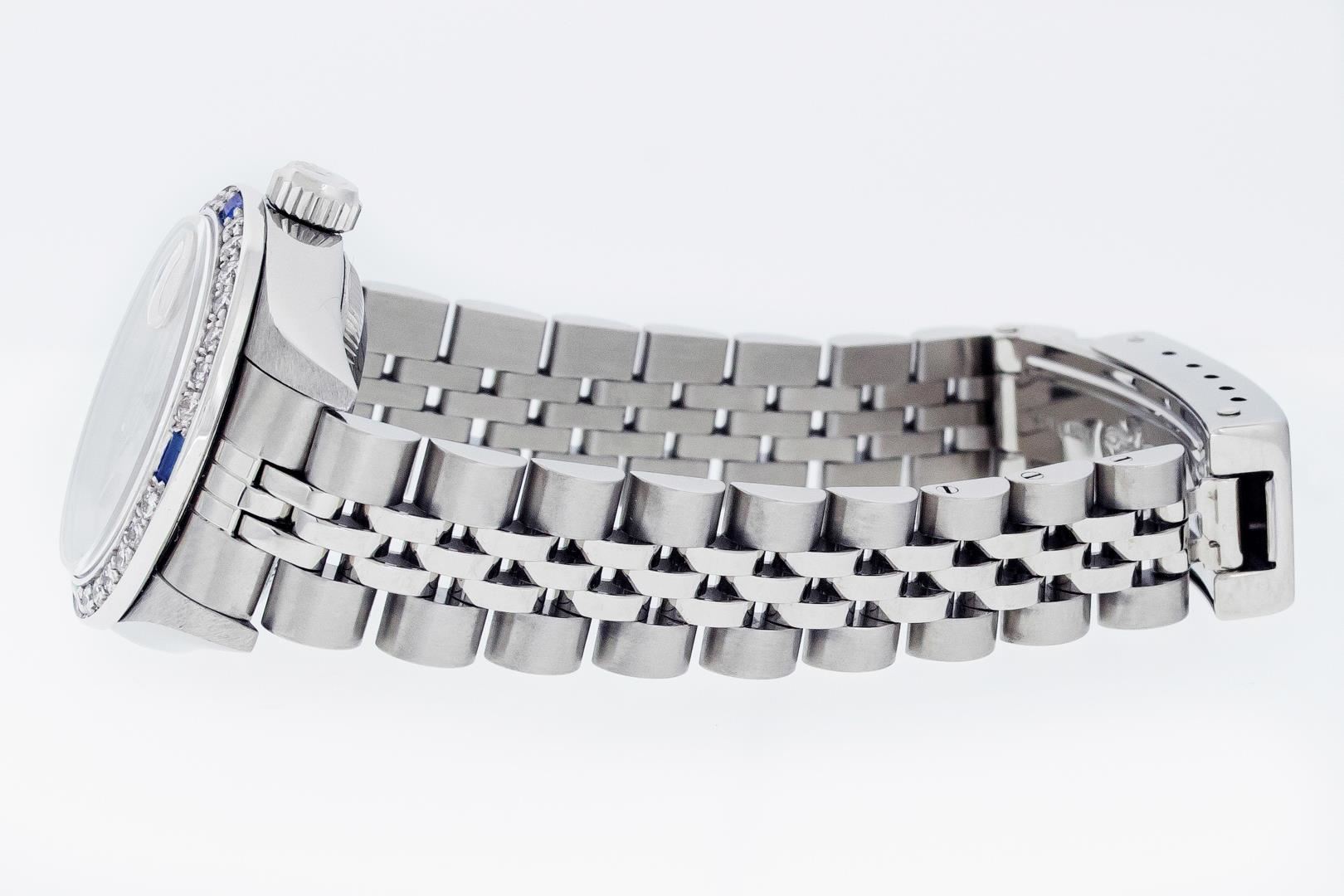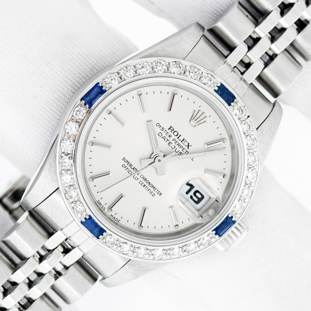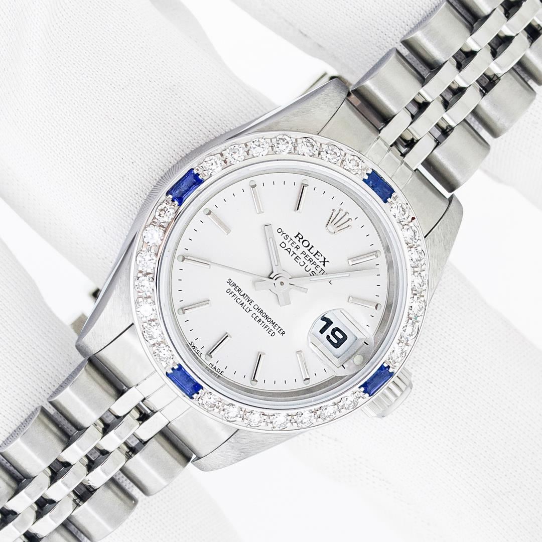 One Ladies Pre Owned Quickset Stainless Steel Rolex Datejust Polished Bright with Satin Finish, Serviced & Electronically Tested, Stainless Steel Case: 26mm, Rolex Stainless Steel Crown, Custom Bezel: New 18K White Gold Sapphire Bead Set Diamond Bezel, Diamond + Gem Count: 28 Diamonds + 4 Sapphires, Clarity: SI-VS, Color: G to H. Custom Crystal: New Sapphire With Magnified Date Window. Custom Hands: New Luminescent Hands. Rolex Movement: Automatic Winding Movement 2235. Rolex Dial: Silver With Index Hour Markers With Dash Track & Lumi Dot. Date Window: 3 O'Clock Position Date Display, Model: Quickset Datejust. Condition: G-6 Extra Fine. Rolex Bracelet: Stainless Steel Jubilee Band. Bright Polish & Satin Finish. 6.0 Inch Length, Adjustable. Standard Clasp, With Rolex Logo. This Watch Has Been Serviced Time Tested And Is In Excellent Condition It Is Free Of All Scratches And Dents.