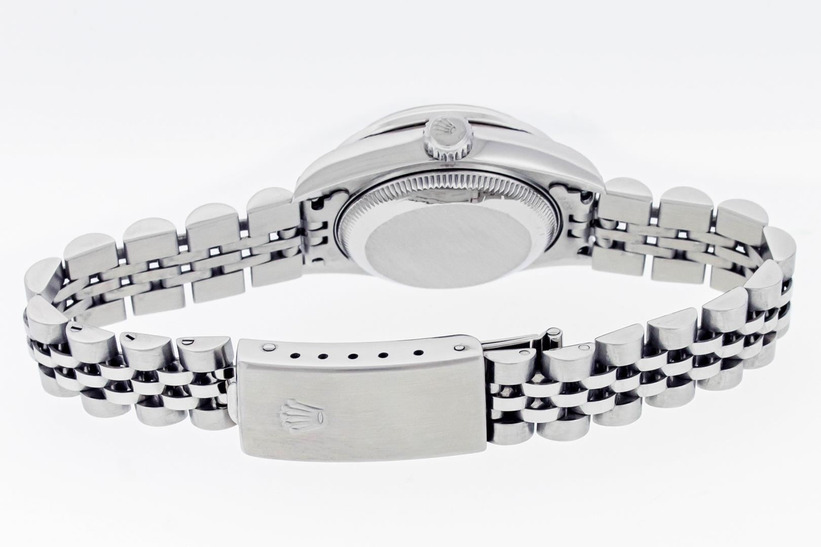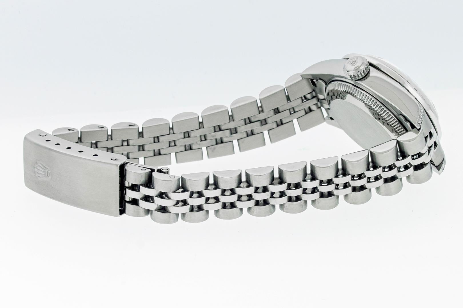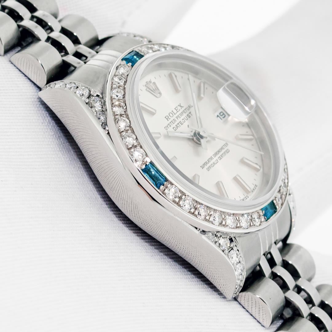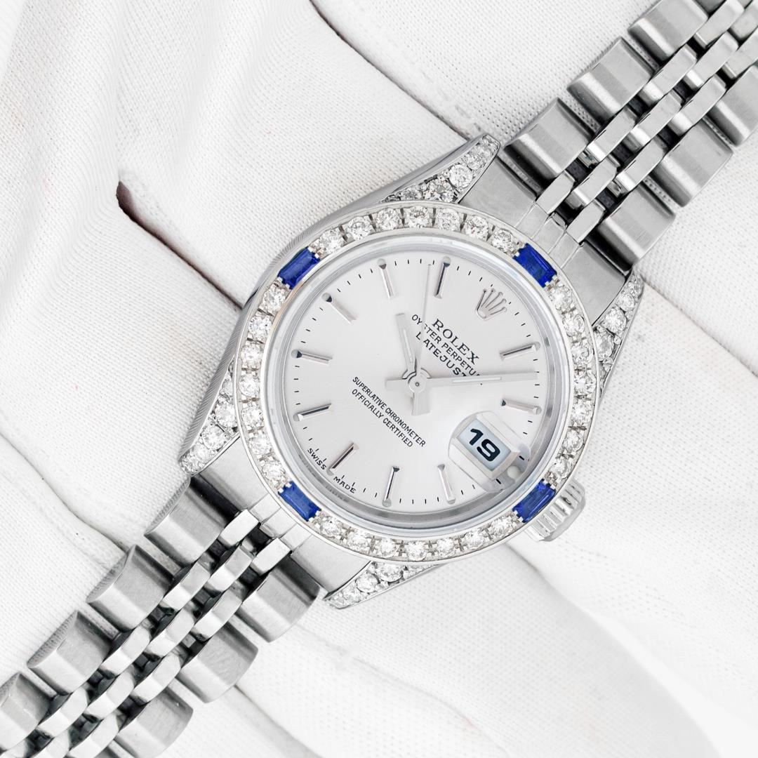 One Ladies Pre Owned Quickset Stainless Steel Rolex Datejust Polished Bright with Satin Finish, Serviced & Electronically Tested, Stainless Steel Case: 26mm, Custom Diamond Lugs: Added Diamonds On Lugs, Diamond Count: 24 Diamonds, Color: G To H, Clartity: SI-VS. Rolex Stainless Steel Crown, Custom Bezel: New 18K White Gold Sapphire Bead Set Diamond Bezel, Diamond + Gem Count: 28 Diamonds + 4 Sapphires, Clarity: SI-VS, Color: G to H. Custom Crystal: New Sapphire With Magnified Date Window. Custom Hands: New Luminescent Hands. Rolex Movement: Automatic Winding Movement 2235. Rolex Dial: Silver With Index Hour Markers With Dash Track & Lumi Dot. Date Window: 3 O'Clock Position Date Display, Model: Quickset Datejust. Condition: G-6 Extra Fine. Rolex Bracelet: Stainless Steel Jubilee Band. Bright Polish & Satin Finish. 6.0 Inch Length, Adjustable. Standard Clasp, With Rolex Logo. This Watch Has Been Serviced Time Tested And Is In Excellent Condition It Is Free Of All Scratches And Dents.