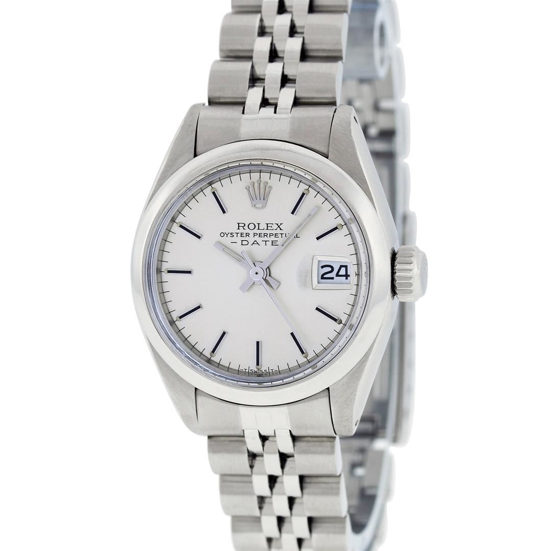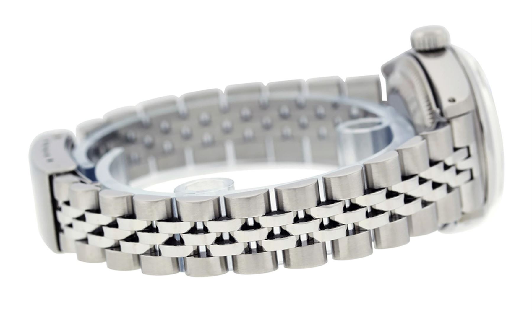 One Ladies Rolex Datejust Polished Bright with Satin Finish, Serviced & Electronically Tested, Stainless Steel Case:26mm, Stainless Steel Crown, Bezel: Stainless Steel Smooth Bezel. Custom Crystal: Acrylic Cyclops Lens. Movement: Automatic Winding Movement Caliber 2030. Dial: Silver Index Dial With Lumi Dot and Dash Track. Date Window: 3 O'Clock Position Date Display, Model: Datejust. Condition: G-6 Extra Fine. Bracelet: Stainless Steel Jubilee Band. Bright Polish & Satin Finish. 6.0 Inch Length, Adjustable. Standard Clasp, With Rolex Logo. This watch has been serviced and polished and its free of all dents and scratches and has been time tested.