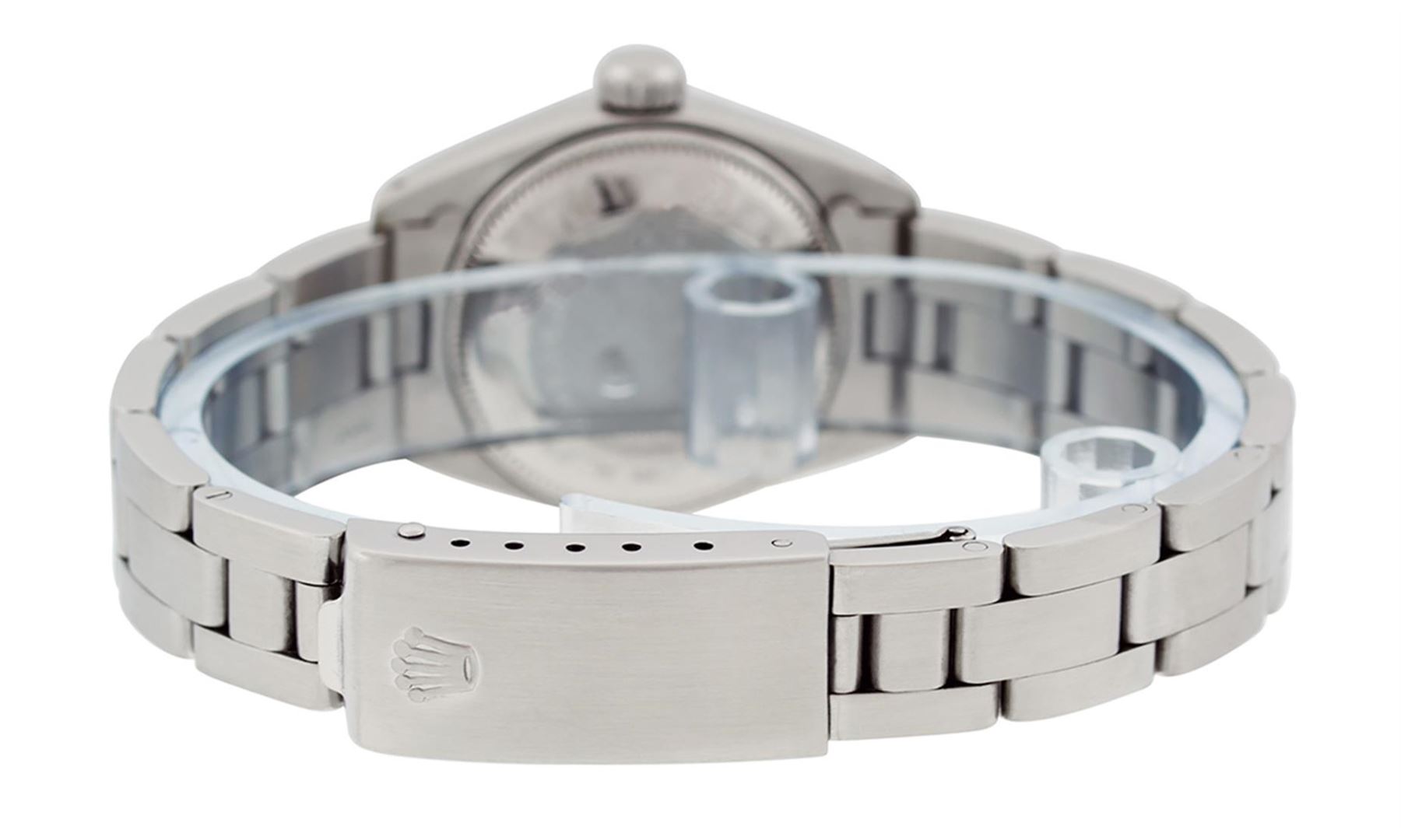 One Ladies Rolex Datejust Polished Bright with Satin Finish, Serviced & Electronically Tested, Stainless Steel Case:26mm, Stainless Steel Crown, Bezel: Stainless Steel Bezel. Custom Crystal: Acrylic Cyclops Lens. Movement: Automatic Winding Movement Caliber 2030. Dial: Silver Index Dial. Date Window: 3 O'Clock Position Date Display, Model: Datejust. Condition: G-6 Extra Fine. Bracelet: Stainless Steel Oyster Band. Bright Polish & Satin Finish. 6.0 Inch Length, Adjustable. Standard Clasp, With Rolex Logo. This watch has been serviced and polished and its free of all dents and scratches.