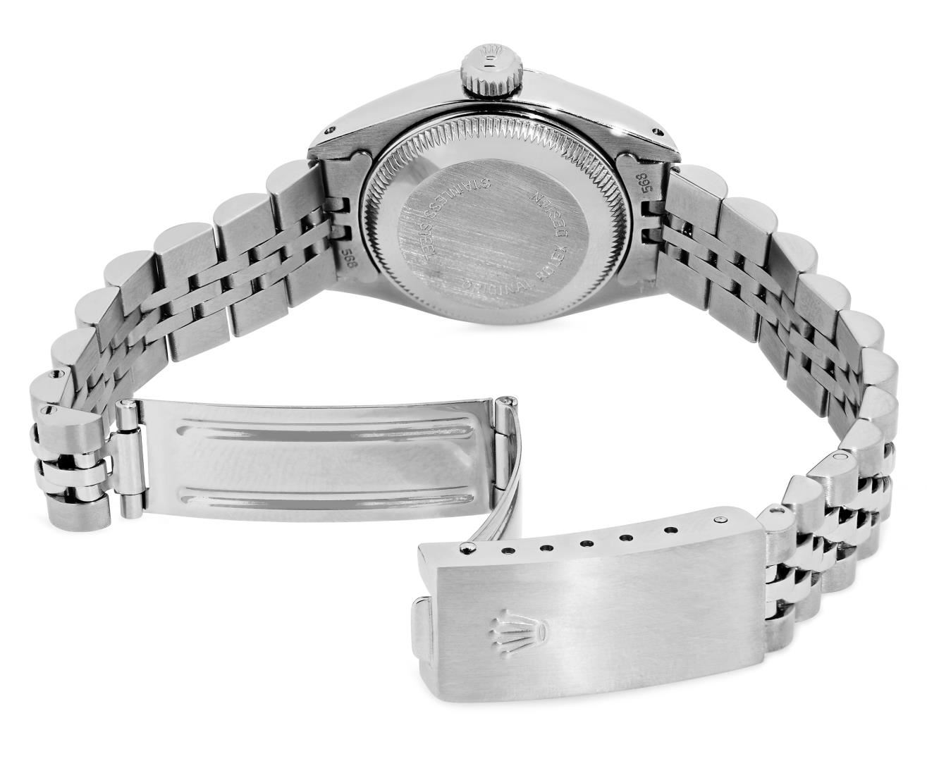 One Rolex Ladies Pre Owned Stainless Steel Date Wristwatch Polished Bright with Satin Finish, Serviced & Electronically Tested, Stainless Steel Case: 26mm, Stainless Steel Crown, 14K White Gold Fluted Bezel, Custom Crystal: New Acrylic With Magnifying Date Window. Custom Hands: New Luminescent Hands. Rolex Movement: Automatic Winding Movement 2035. Rolex Dial: Factory Silver Linen Dial With Black Lumi Index Hour Markers, Lumi Dots, and a Dash Track. Date Window: 3 O'clock Position Date Display, Model: Date. Condition: G-6 Extra Fine. Rolex Bracelet: Stainless Steel Jubilee Band. Bright Polish & Satin Finish. 6.0 Inch Length, Adjustable. Standard Clasp, With Rolex Logo. This Watch Has Been Serviced Time Tested And Is In Excellent Condition. It Is Free Of All Scratches And Dents. This Watch Comes With A Rolex Box.