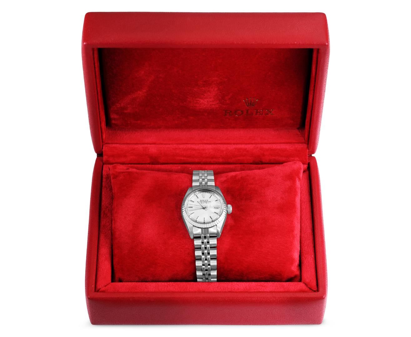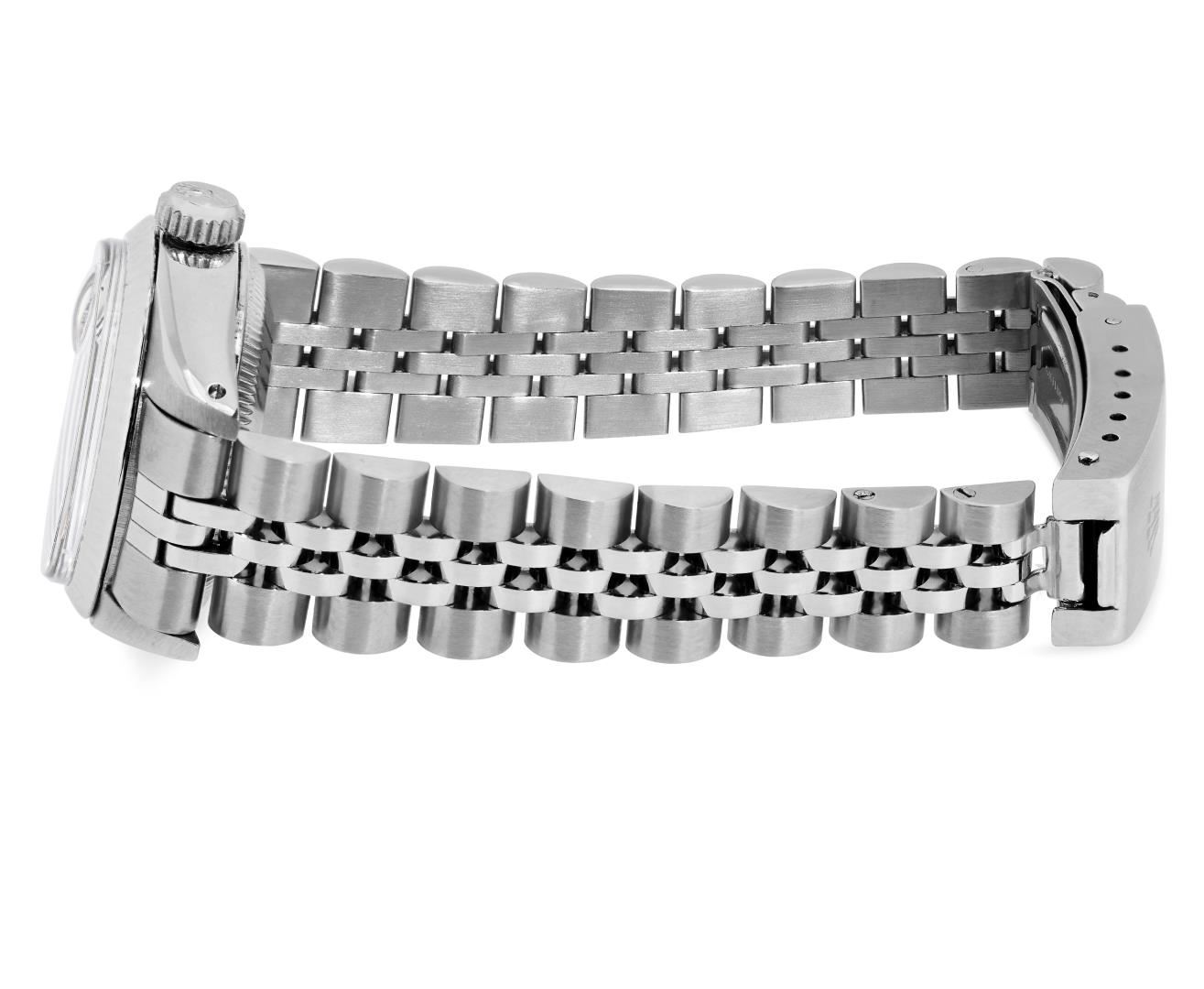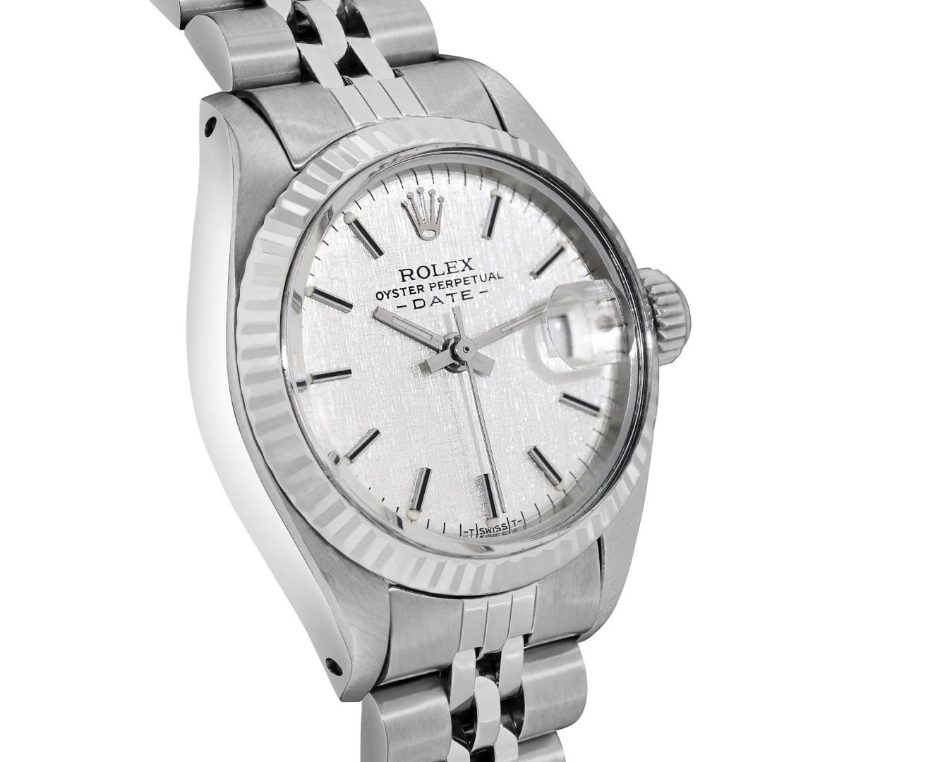One Rolex Ladies Pre Owned Stainless Steel Date Wristwatch Polished Bright with Satin Finish, Serviced & Electronically Tested, Stainless Steel Case: 26mm, Stainless Steel Crown, 14K White Gold Fluted Bezel, Custom Crystal: New Acrylic With Magnifying Date Window. Custom Hands: New Luminescent Hands. Rolex Movement: Automatic Winding Movement 2035. Rolex Dial: Factory Silver Linen Dial With Black Lumi Index Hour Markers, Lumi Dots, and a Dash Track. Date Window: 3 O'clock Position Date Display, Model: Date. Condition: G-6 Extra Fine. Rolex Bracelet: Stainless Steel Jubilee Band. Bright Polish & Satin Finish. 6.0 Inch Length, Adjustable. Standard Clasp, With Rolex Logo. This Watch Has Been Serviced Time Tested And Is In Excellent Condition. It Is Free Of All Scratches And Dents. This Watch Comes With A Rolex Box.
