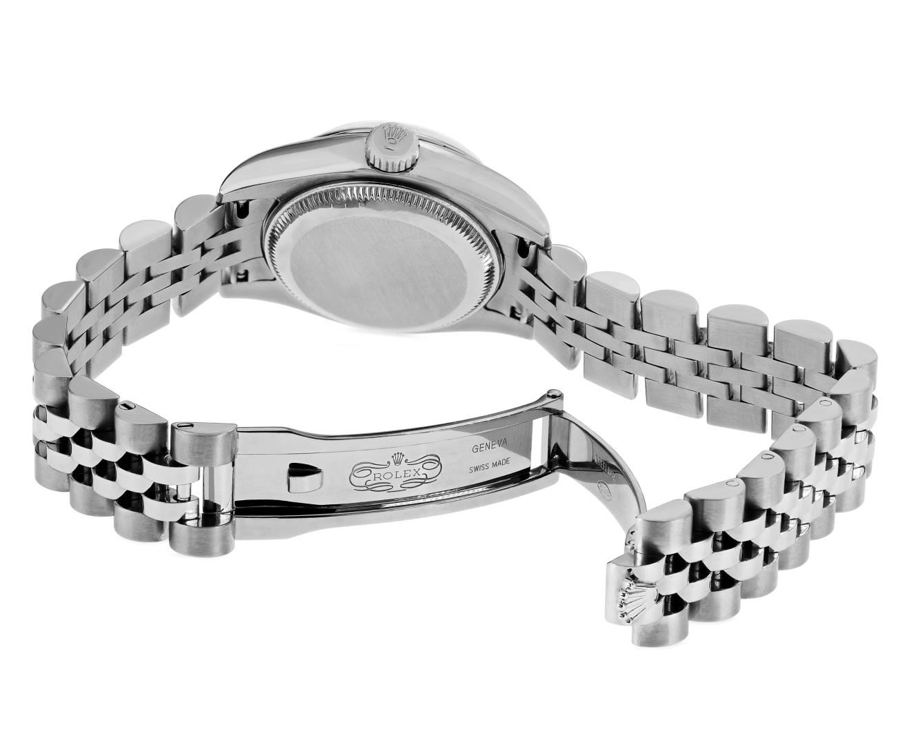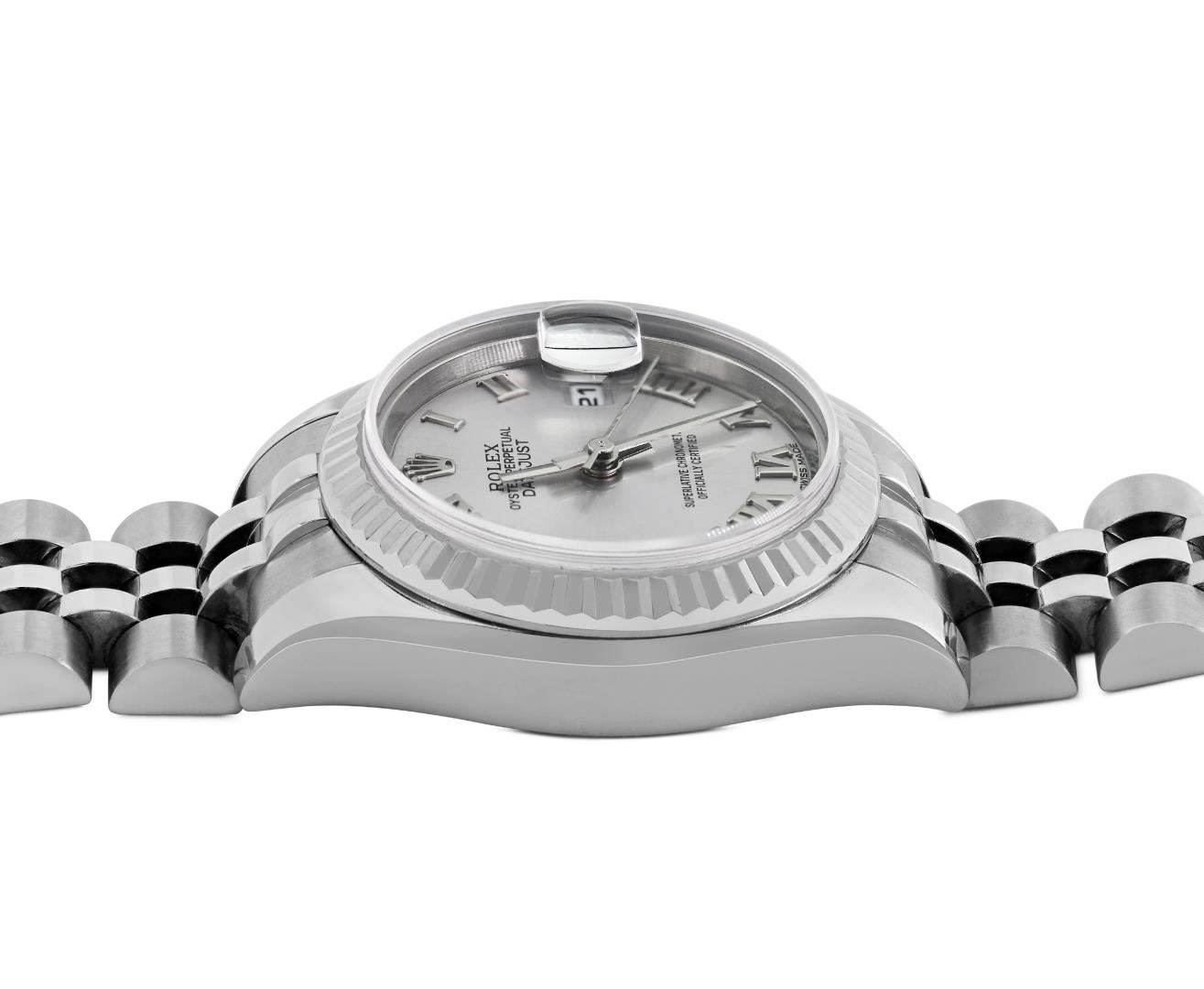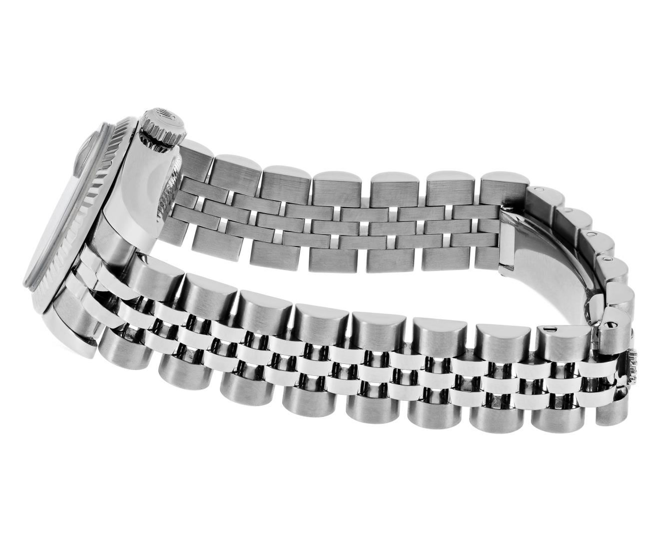 One Ladies Pre Owned Rolex Stainless Steel Datejust Wristwatch Polished Bright with Satin Finish, Serviced & Electronically Tested, Stainless Steel Case: 26mm, Stainless Steel Crown, Rolex Bezel: Rolex 18K White Gold Fluted bezel. Crystal: Sapphire With Magnified Date Window. Hands: Luminescent Hands. Rolex Movement: 2235 Automatic Winding Movement. Rolex Dial: Factory Silver With Roman Hour Markers And Dash Tracks. Date Window: 3 O'clock Position Date Display, Model: Quickset Datejust. Condition: G-6 Extra Fine. Rolex Bracelet: Stainless Steel Jubilee Band. Bright Polish & Satin Finish. 6.0 Inch Length, Adjustable. Hidden Clasp, With Rolex Logo. This Watch Has Been Serviced And Time Tested. It Is In Excellent Condition, Free Of All Scratches And Dents. This Watch Comes With A Rolex Box.