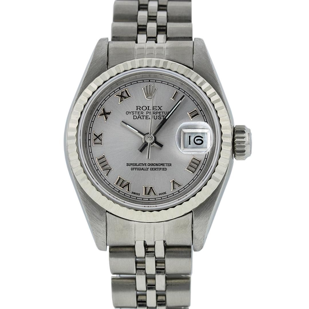 One Pre Owned Ladies Stainless Steel Rolex Polished Bright with Satin Finish, Serviced & Electronically Tested, Rolex Stainless Steel Case: 26mm, Rolex Stainless Steel Crown, Rolex Bezel: 14K White Gold Bezel. Custom Crystal: Acrylic With Magnified Date Window. Custom Hands: New Luminescent Hands. Rolex Movement: Automatic Winding Movement. Custom Dial: Refinished To Silver Roman Dial. Date Window: 3 O'Clock Position Date Display, Model: Datejust. Condition: G-6 Extra Fine. Rolex Bracelet: Stainless Steel Jubilee Band. Bright Polish & Satin Finish. 6.0 Inch Length, Adjustable. Standard Clasp, With Rolex Logo. This Watch Has Been Serviced Time Tested And Is In Excellent Condition It Is Free Of All Scratches And Dents.