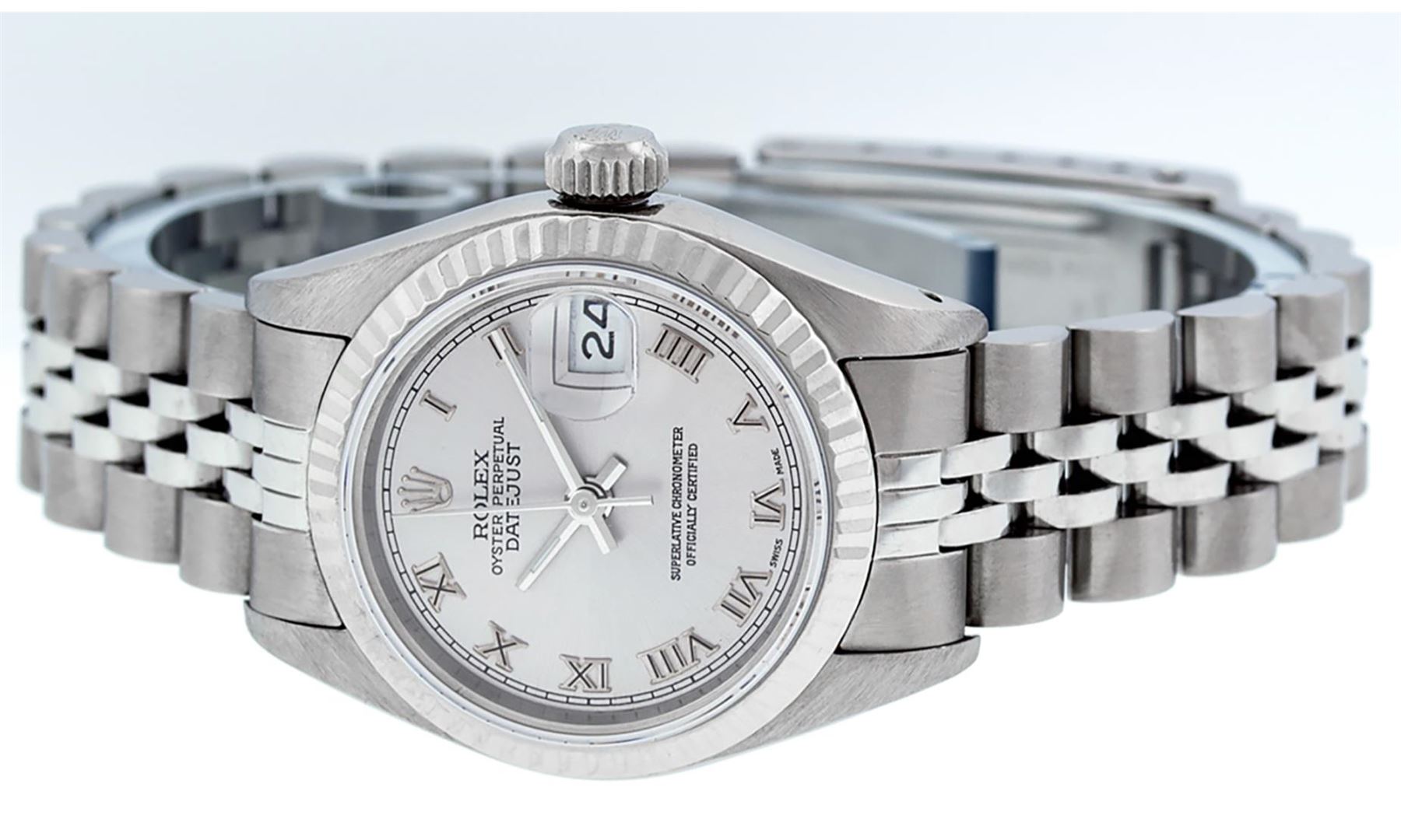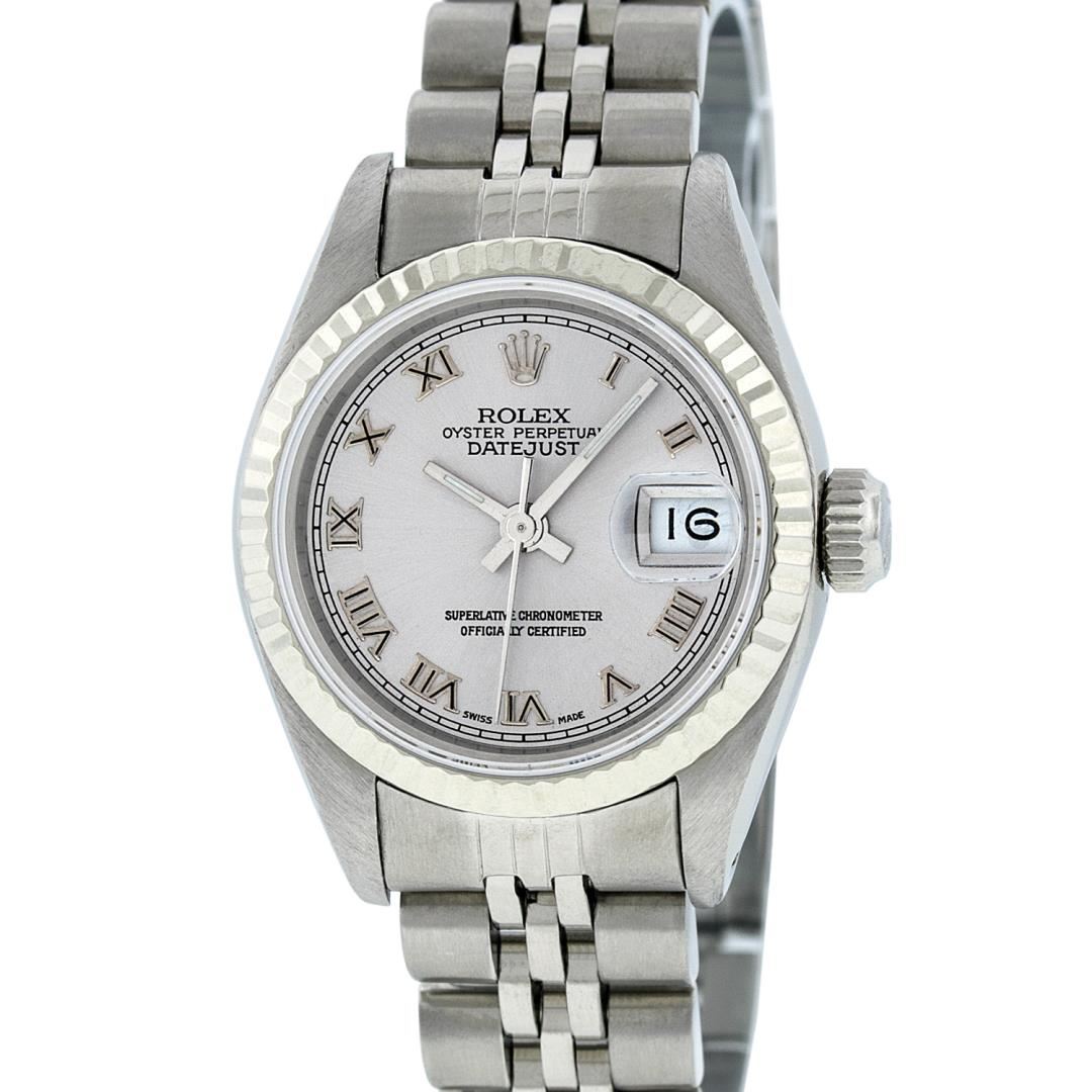 One Pre Owned Ladies Stainless Steel Rolex Polished Bright with Satin Finish, Serviced & Electronically Tested, Rolex Stainless Steel Case: 26mm, Rolex Stainless Steel Crown, Rolex Bezel: 14K White Gold Bezel. Custom Crystal: Acrylic With Magnified Date Window. Custom Hands: New Luminescent Hands. Rolex Movement: Automatic Winding Movement. Custom Dial: Refinished To Silver Roman Dial. Date Window: 3 O'Clock Position Date Display, Model: Datejust. Condition: G-6 Extra Fine. Rolex Bracelet: Stainless Steel Jubilee Band. Bright Polish & Satin Finish. 6.0 Inch Length, Adjustable. Standard Clasp, With Rolex Logo. This Watch Has Been Serviced Time Tested And Is In Excellent Condition It Is Free Of All Scratches And Dents.