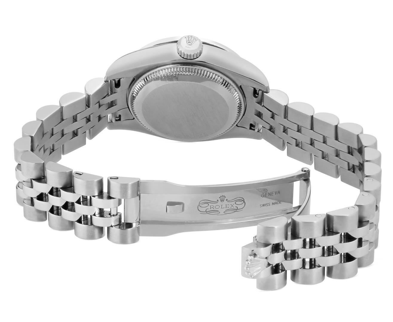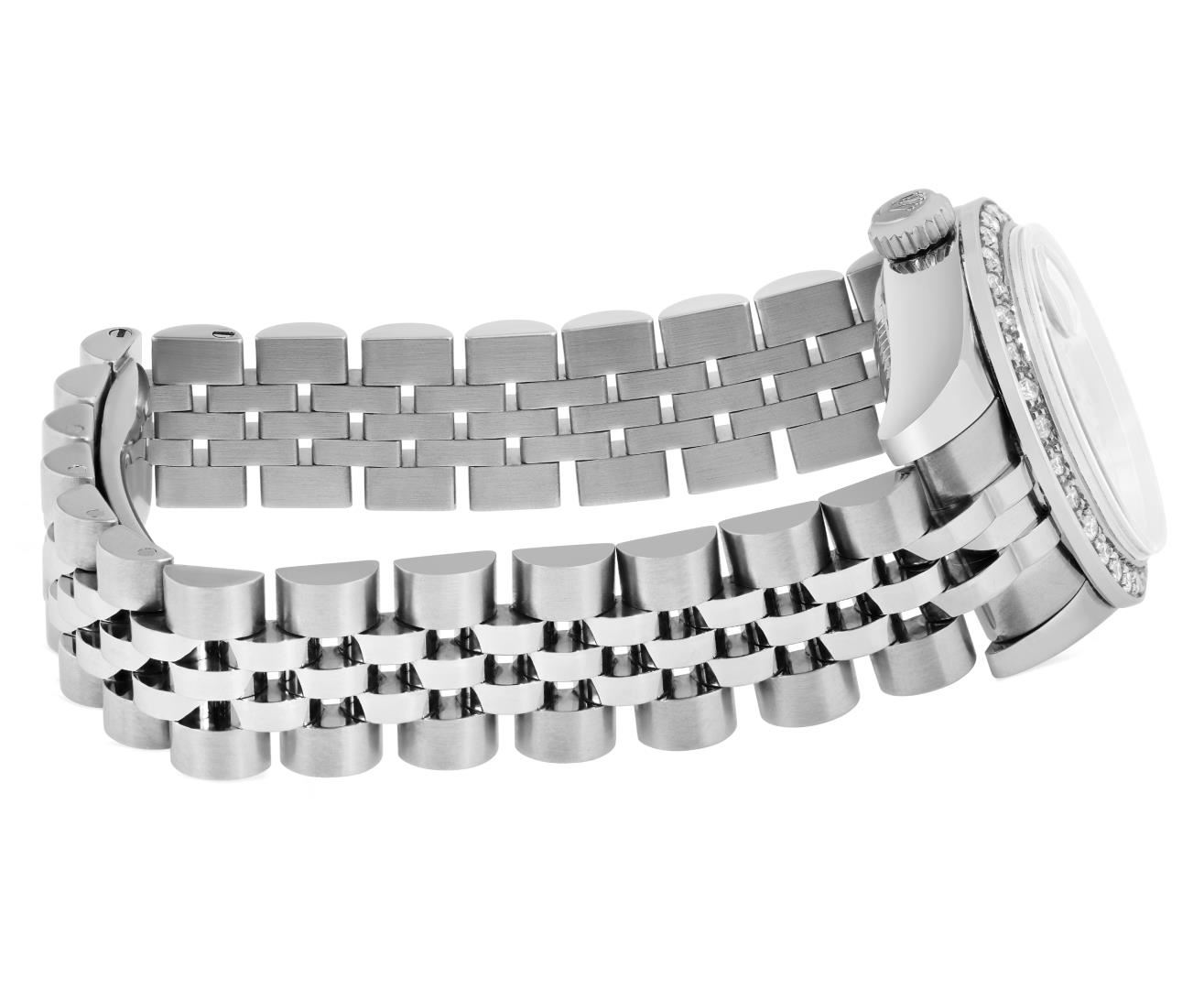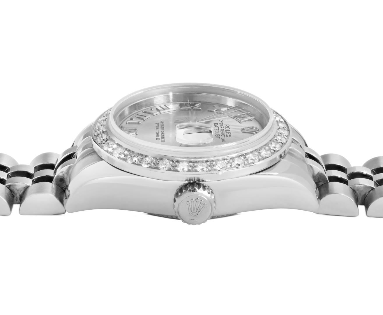 One Rolex Ladies Rolex Quickset Pre Owned Stainless Steel Date Wristwatch Polished Bright with Satin Finish, Serviced & Electronically Tested, Stainless Steel Case: 26mm, Stainless Steel Crown, Custom Bezel: New 18K White Gold Beadset Diamond Bezel, Diamond Count: 32 Diamonds. Crystal: Sapphire With Magnified Date Window. Hands: Non Luminescent Hands. Rolex Movement: 2235 Automatic Winding Movement. Rolex Dial: Factory Silver Roman Hour Markers. Date Window: 3 O'clock Position Date Display, Model: Quickset Date. Condition: G-6 Extra Fine. Rolex Bracelet: Stainless Steel Jubilee Band. Bright Polish & Satin Finish. 6.0 Inch Length, Adjustable. Hidden Clasp, With Rolex Logo. This Watch Has Been Serviced And Time Tested. It Is In Excellent Condition, Free Of All Scratches And Dents. This Watch Comes With A Rolex Box.