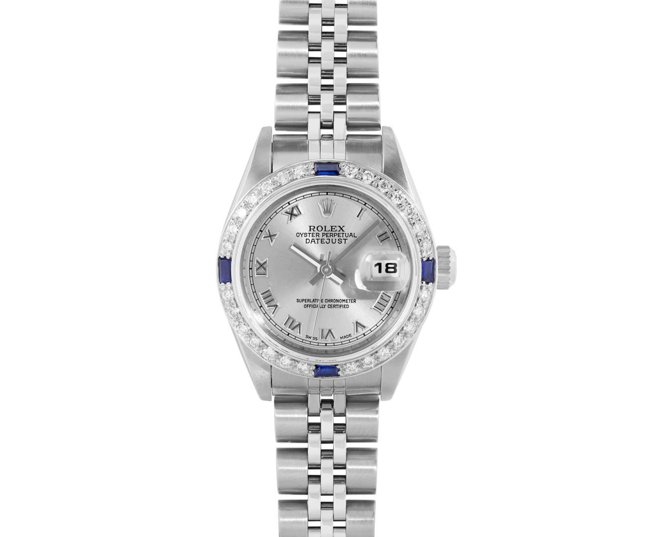 One Rolex Ladies Pre Owned Quickset Stainless Steel Datejust Wristwatch Polished Bright with Satin Finish, Serviced And Electronically Tested, Stainless Steel Case: 26mm, Stainless Steel Crown, Custom Bezel: New 18K White Gold Sapphire Beadset Diamond Bezel, Diamond + Gem Count: 36 Diamonds + 4 Sapphires. Custom Crystal: New Sapphire With Magnified Date Window. Custom Hands: New Solid Hands. Rolex Movement: 2235 Automatic Winding Movement. Rolex Dial: Factory Silver Dial With Roman Hour Markers, and Square Track. Date Window: 3 O'Clock Position Date Display, Model: Quickset Datejust. Condition: G-6 Extra Fine. Rolex Bracelet: Stainless Steel Jubilee Band. Bright Polish And Satin Finish. 6.0 Inch Length, Adjustable. Standard Clasp, With Rolex Logo. This Watch Has Been Serviced Time Tested And Is In Excellent Condition. It Is Free Of All Scratches And Dents. This Watch Comes With A Rolex Box.