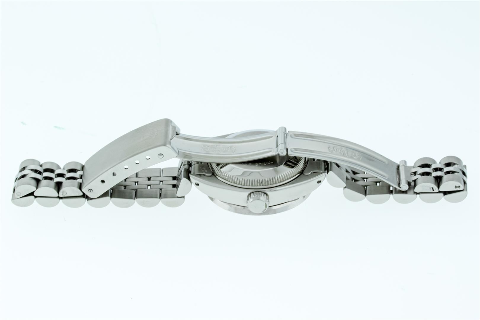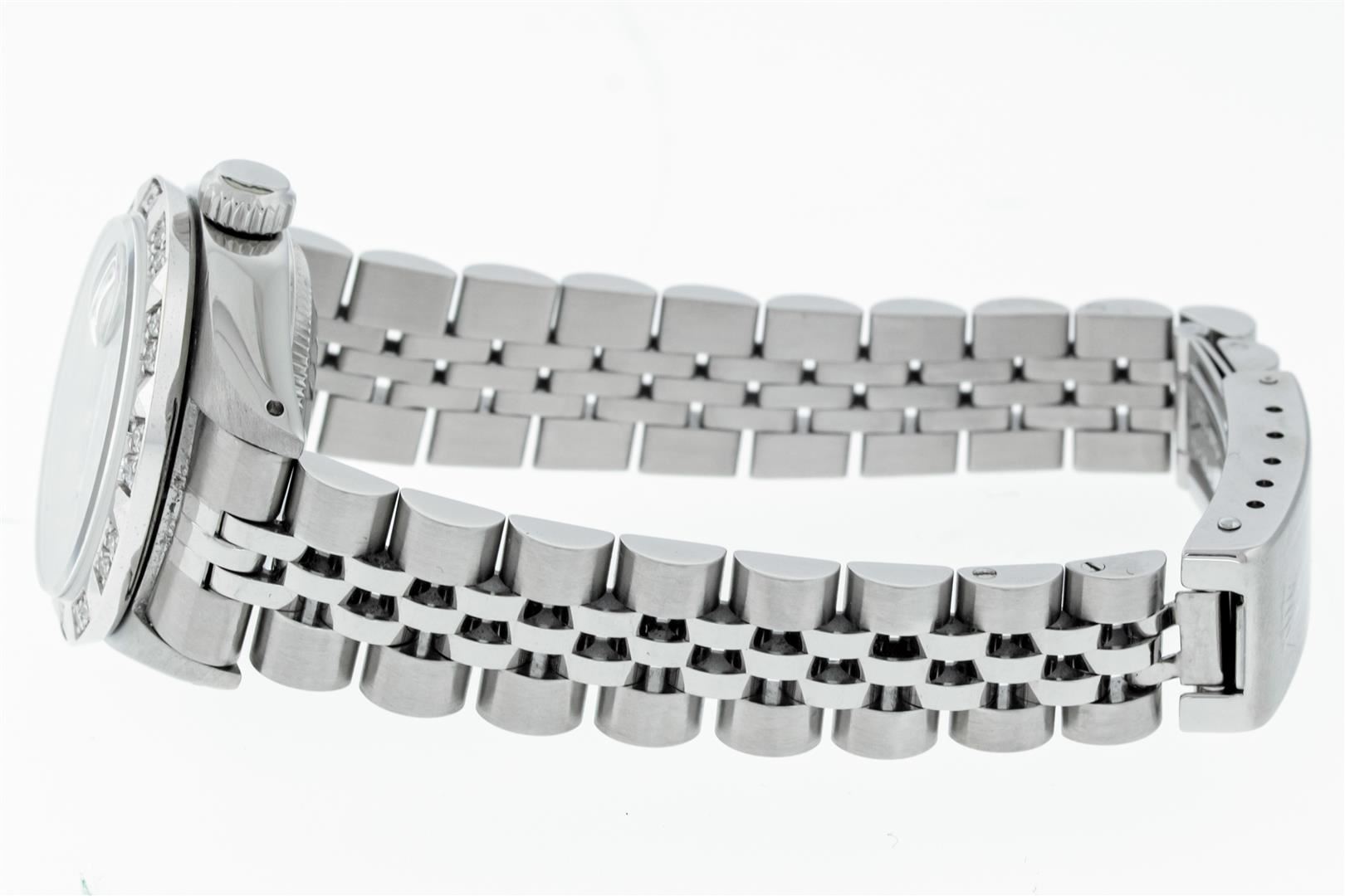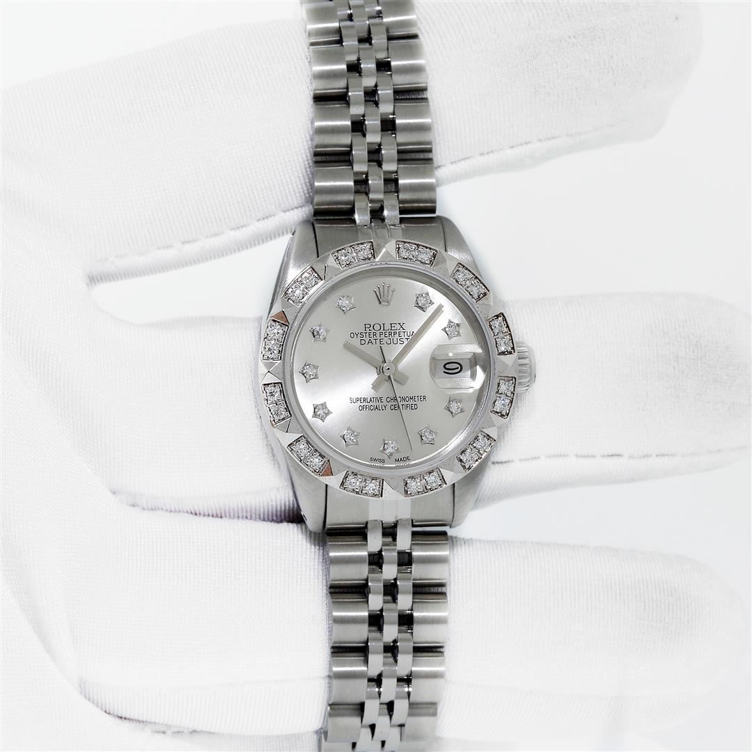 One Ladies Stainless Steel Rolex Datejust Polished Bright with Satin Finish, Serviced & Electronically Tested, Rolex Stainless Steel Case: 26mm, Rolex Stainless Steel Crown, Custom Bezel: New 18K White Gold Pyramid Diamond Bezel, Diamond Count: 24 Diamonds In Dial. Total Weight .50 Carat, Clarity: SI-VS, Color: G to H. Custom Crystal: New Sapphire With Magnified Date Window. Custom Hands: New Luminescent Hands. Rolex Movement: Automatic Winding Movement. Custom Dial: Refinished To Silver With Added Custom Star Diamonds. Diamond Count: 10 Diamonds In Dial. Clarity: SI-VS, Color: G to H. Date Window: 3 O'clock Position Date Display, Model: Datejust. Condition: G-6 Extra Fine. Rolex Bracelet: Stainless Steel Jubilee Band With Rolex Crown On Buckle. Bright Polish & Satin Finish. Band Length: 6.0 Inch Length, Adjustable. Standard Clasp, With Rolex Logo. This Pre Owned Watch Has Been Serviced Time Tested And Is In Excellent Condition It Is Free Of All Scratches And Dents.