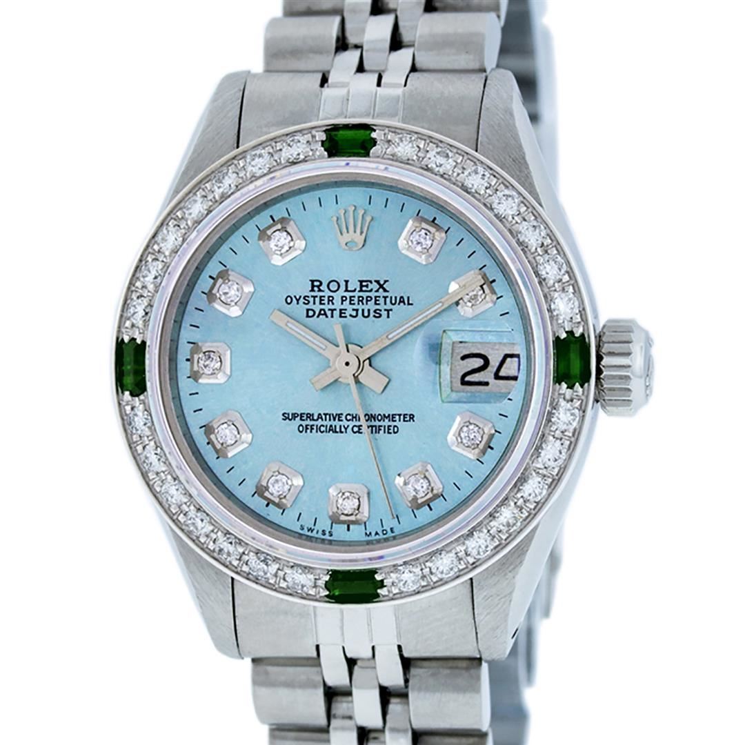 One Ladies Stainless Steel Rolex Datejust Polished Bright with Satin Finish, Serviced & Electronically Tested, Stainless Steel Case: 26mm, Stainless Steel Crown, Custom Bezel: New 18K White Gold Emerald Beadset Diamond Bezel, Diamond + Gem Count: 28 Diamonds + 4 Emeralds. Total Weight .70 Carat, Clarity: SI-VS, Color: G to H. Custom Crystal: New Scratch Resistant Synthetic Sapphire Cyclops Lens. Custom Hands: New Luminescent Hands. Movement: Automatic Winding Movement Caliber 2030. Custom Dial: Refinished Sky Blue With Diamond Hour Markers & Dash Tracks, 10 Diamonds in Dial, G To H In Color, Clarity: SI-VS. Date Window: 3 O'Clock Position Date Display, Model: Datejust. Condition: G-6 Extra Fine. Bracelet: Stainless Steel Jubilee Band. Bright Polish & Satin Finish. 6.0 Inch Length, Adjustable. Standard Clasp, With Rolex Logo. This Watch Has Been Serviced Time Tested And Is In Excellent Condition It Is Free Of All Scratches And Dents.