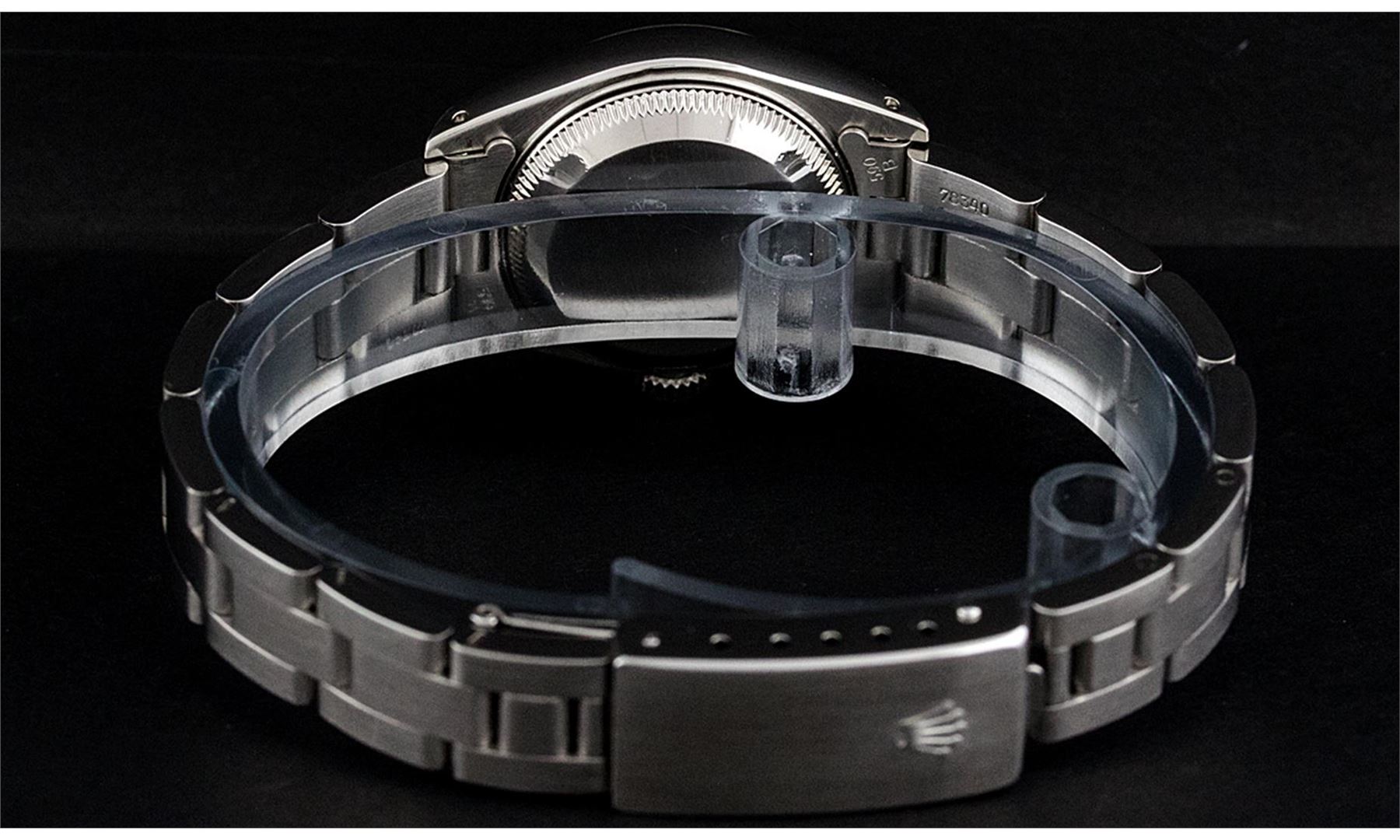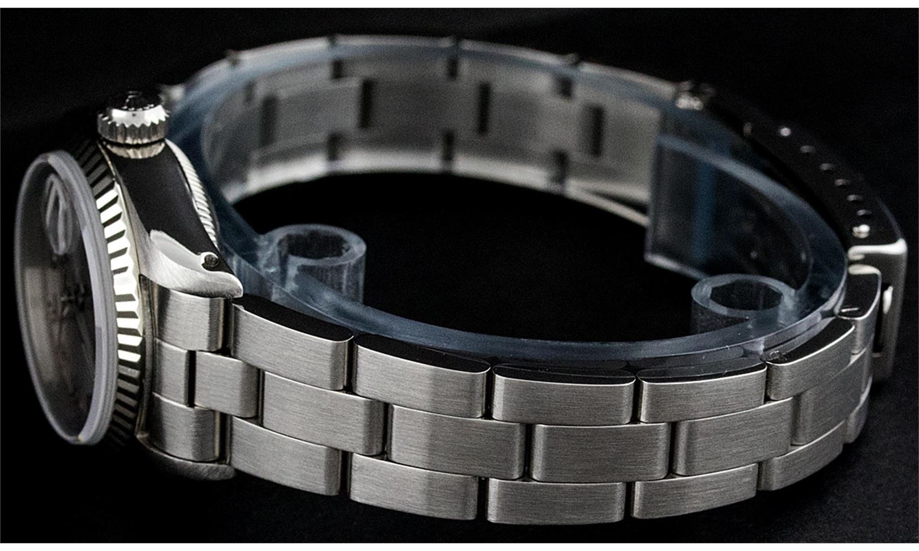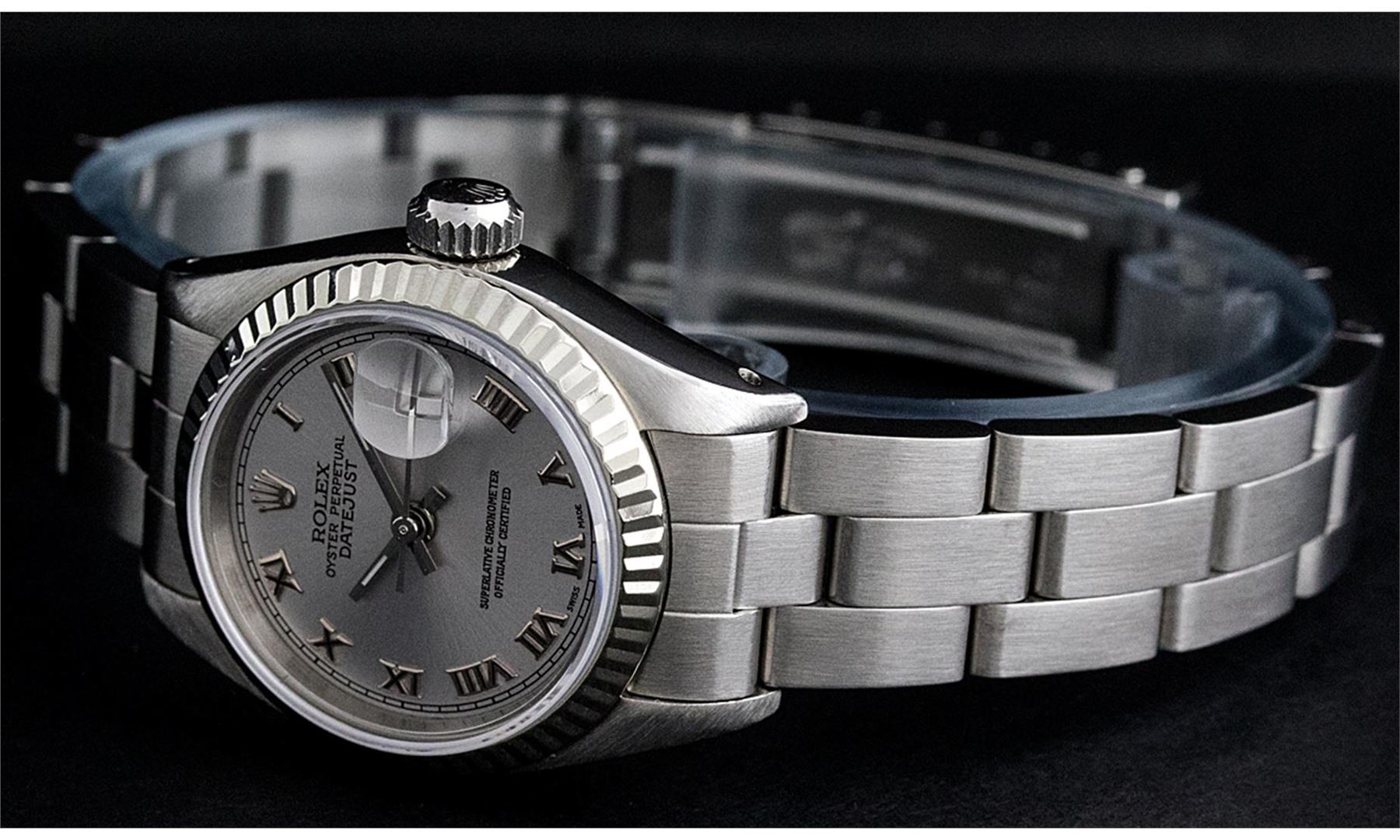 One Ladies Stainless Steel Rolex Datejust Polished Bright with Satin Finish, Serviced & Electronically Tested, Stainless Steel Case: 26mm, Stainless Steel Crown, Bezel: 14K White Gold Bezel. Custom Crystal: New Acrylic Cyclops Lens. Custom Hands: New Luminescent Hands. Movement: Automatic Winding Movement Caliber 2030. Custom Dial: Slate Grey Roman Dial With Square Track. Date Window: 3 O'Clock Position Date Display, Model: Datejust. Condition: G-6 Extra Fine. Bracelet: Stainless Steel Oyster Band. Bright Polish & Satin Finish. 6.0 Inch Length, Adjustable. Standard Clasp, With Rolex Logo. This Watch Has Been Serviced Time Tested And Is In Excellent Condition It Is Free Of All Scratches And Dents.