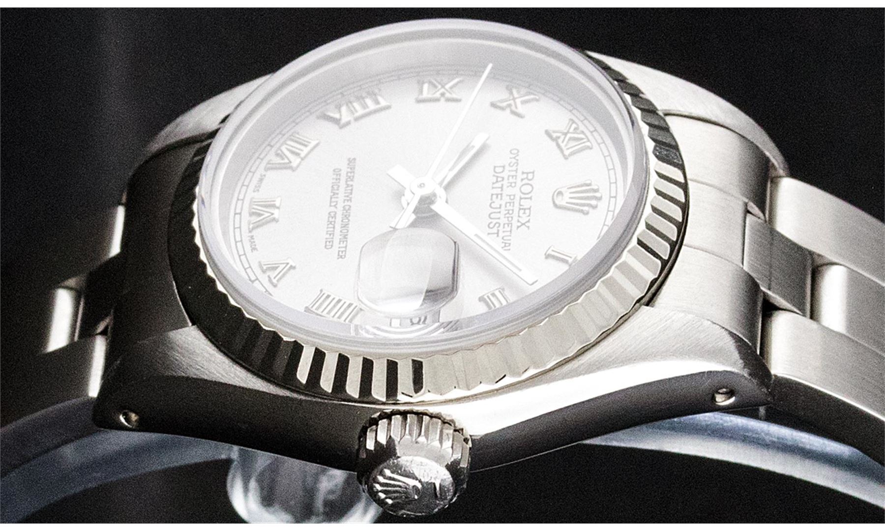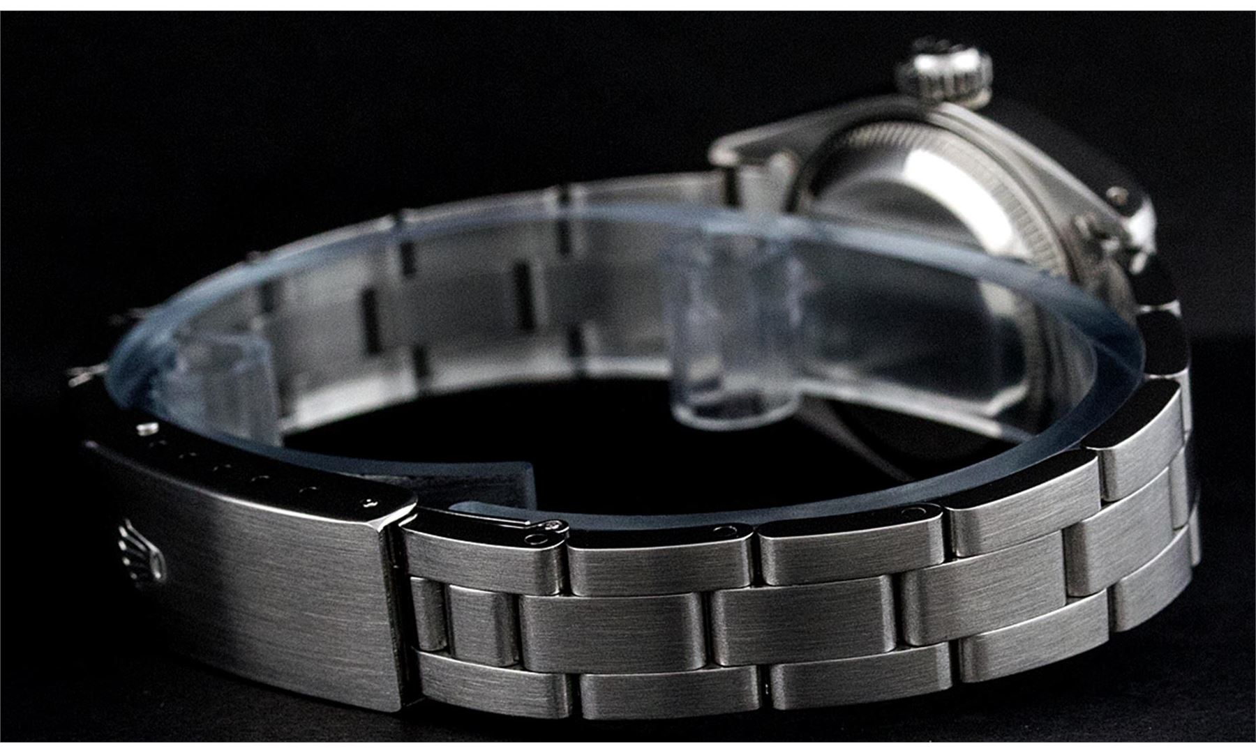One Ladies Stainless Steel Rolex Datejust Polished Bright with Satin Finish, Serviced & Electronically Tested, Stainless Steel Case: 26mm, Stainless Steel Crown, Bezel: 14K White Gold Bezel. Custom Crystal: New Acrylic Cyclops Lens. Custom Hands: New Luminescent Hands. Movement: Automatic Winding Movement Caliber 2030. Custom Dial: Slate Grey Roman Dial With Square Track. Date Window: 3 O'Clock Position Date Display, Model: Datejust. Condition: G-6 Extra Fine. Bracelet: Stainless Steel Oyster Band. Bright Polish & Satin Finish. 6.0 Inch Length, Adjustable. Standard Clasp, With Rolex Logo. This Watch Has Been Serviced Time Tested And Is In Excellent Condition It Is Free Of All Scratches And Dents.