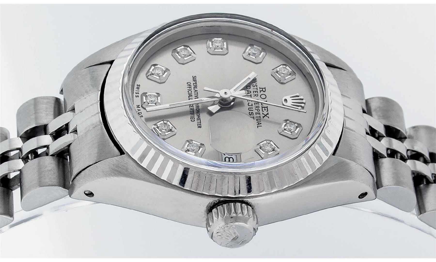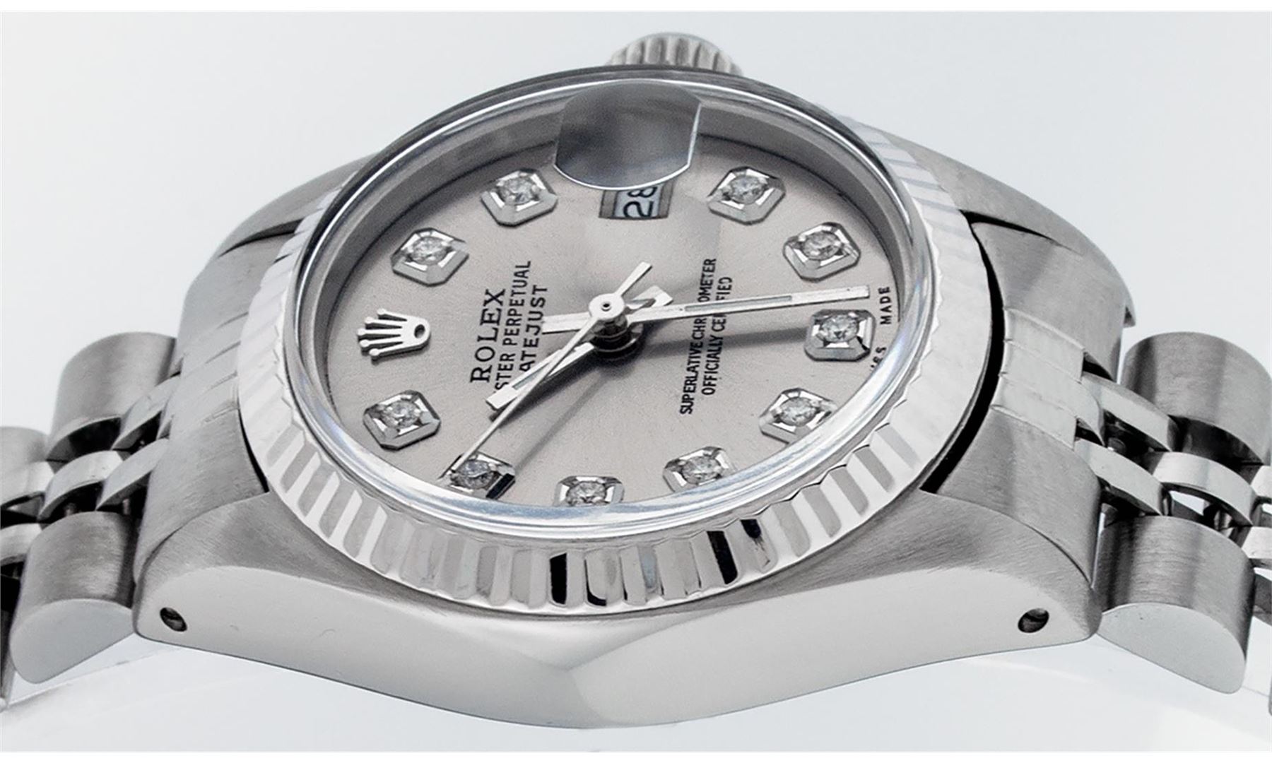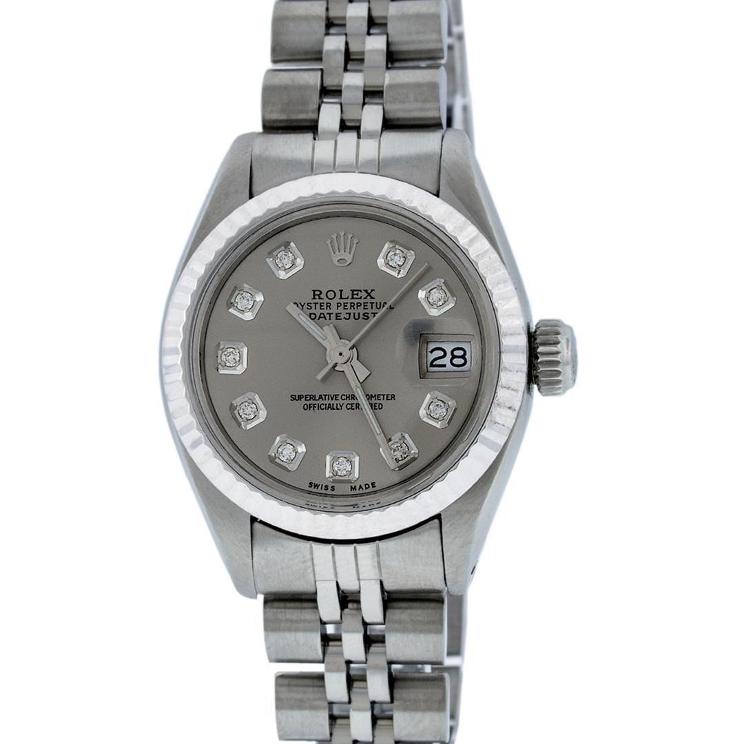 One Ladies Stainless Steel Rolex Datejust Polished Bright with Satin Finish, Serviced & Electronically Tested, Stainless Steel Case: 26mm, Stainless Steel Crown, Bezel: 14K White Gold Bezel. Custom Crystal: New Acrylic Cyclops Lens. Custom Hands: New Luminescent Hands. Movement: Automatic Winding Movement Caliber 2030. Dial: Slate Grey Diamond Dial, Diamond Count: 10 Diamonds In Dial, Color: G to H, Clarity: SI-VS. Date Window: 3 O'Clock Position Date Display, Model: Datejust. Condition: G-6 Extra Fine. Bracelet: Stainless Steel Jubilee Band. Bright Polish & Satin Finish. 6.0 Inch Length, Adjustable. Standard Clasp, With Rolex Logo. This Watch Has Been Serviced Time Tested And Is In Excellent Condition It Is Free Of All Scratches And Dents.