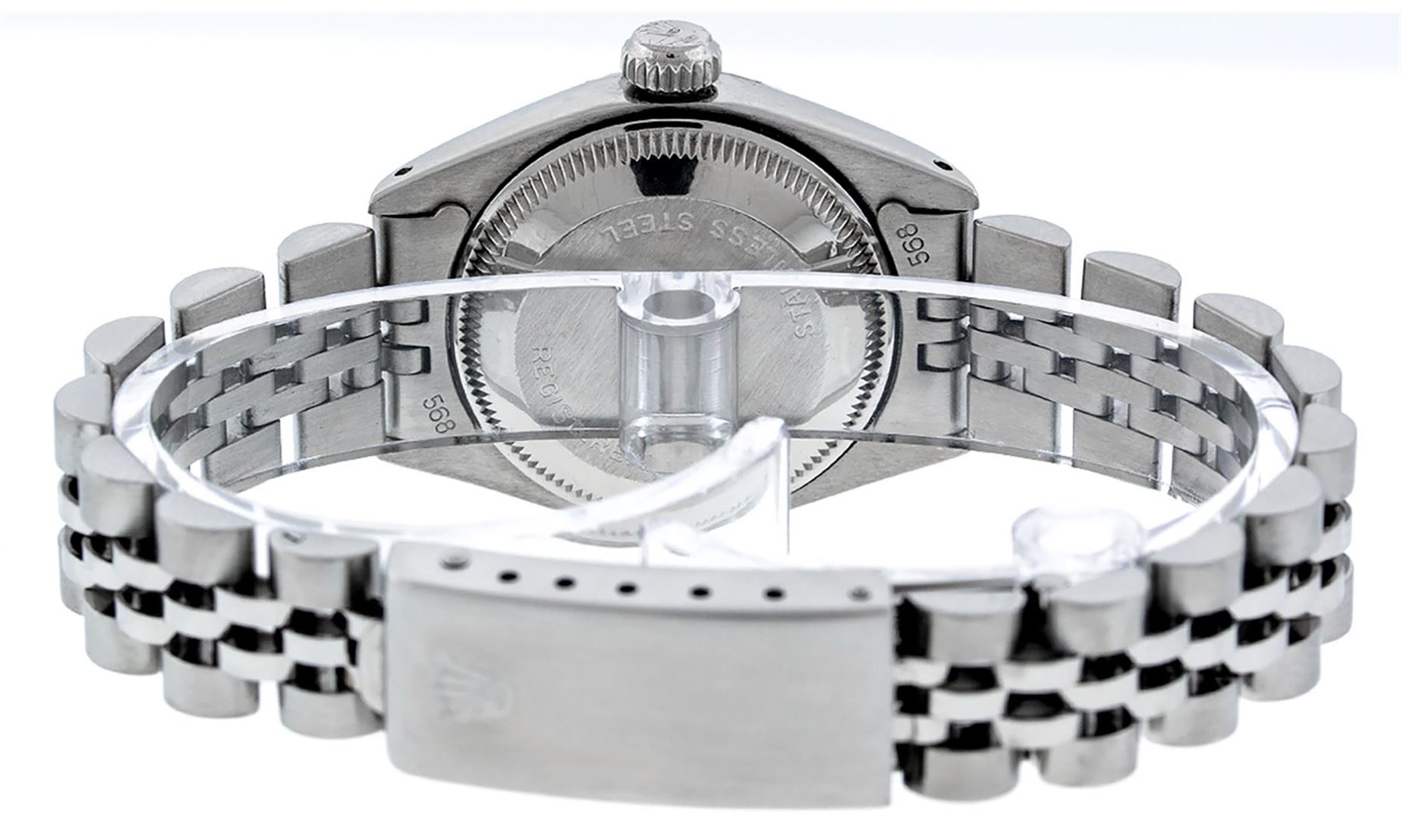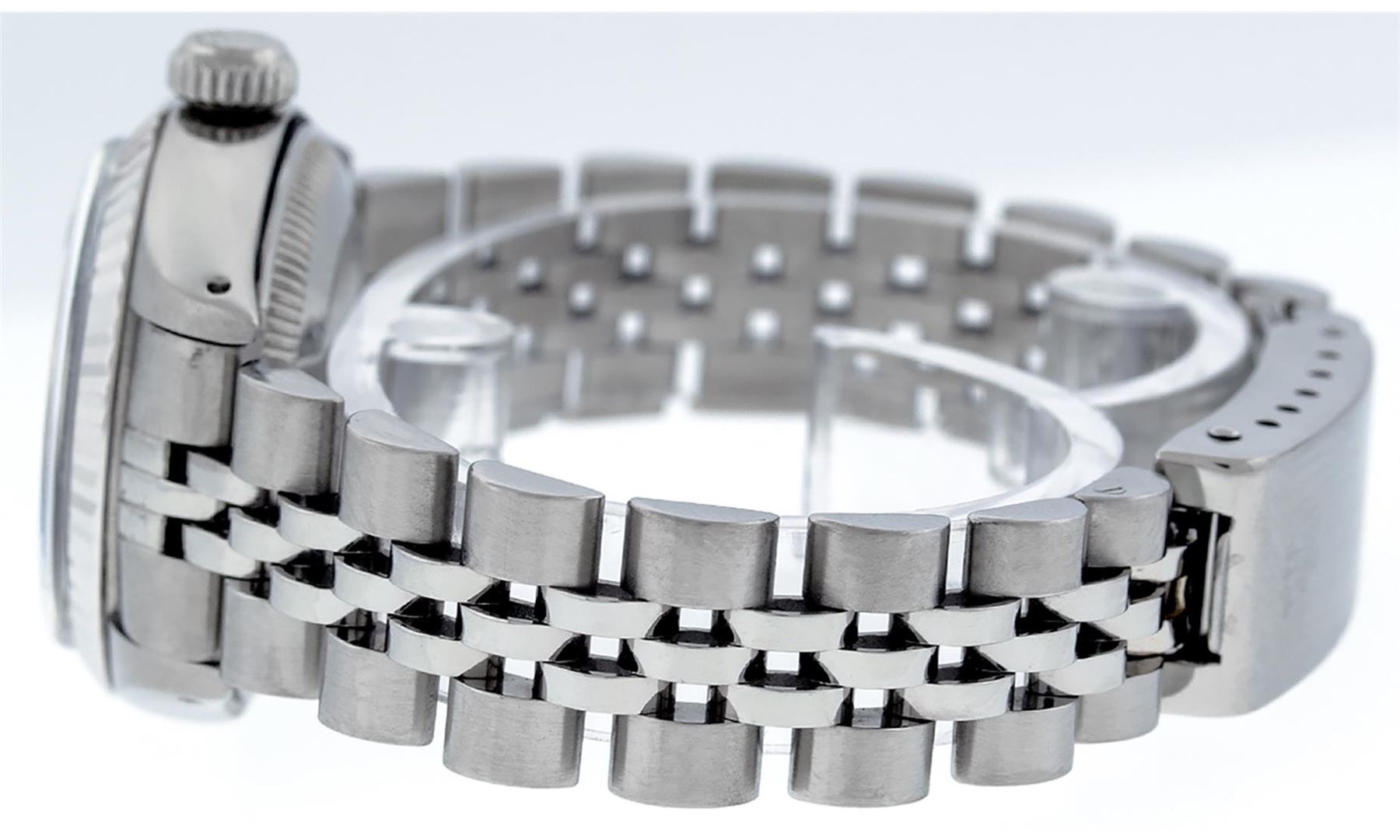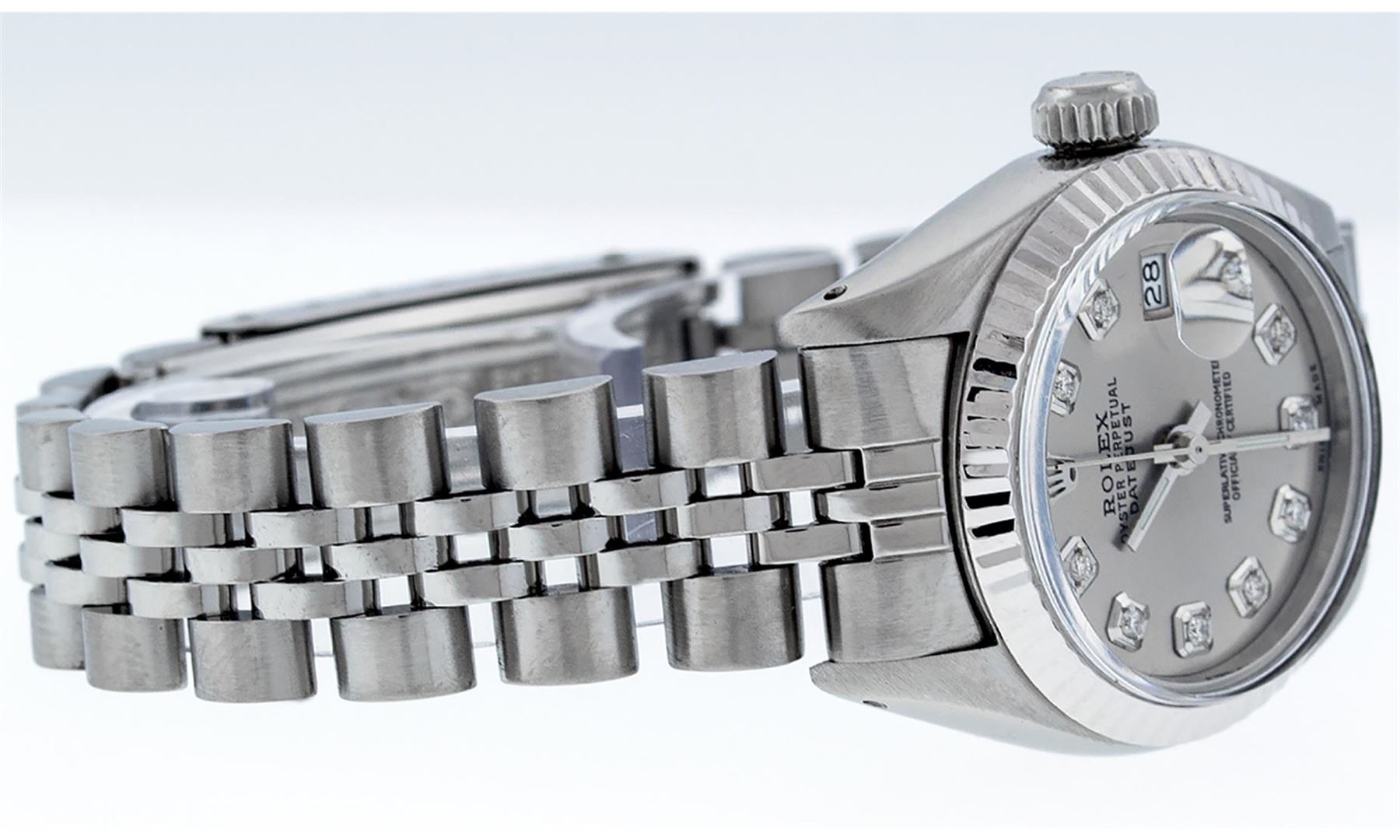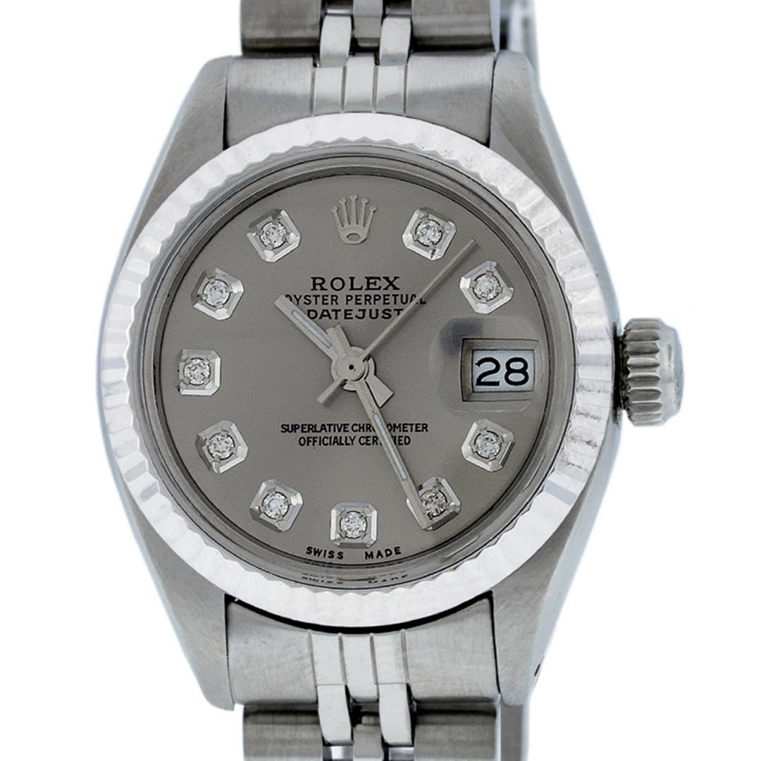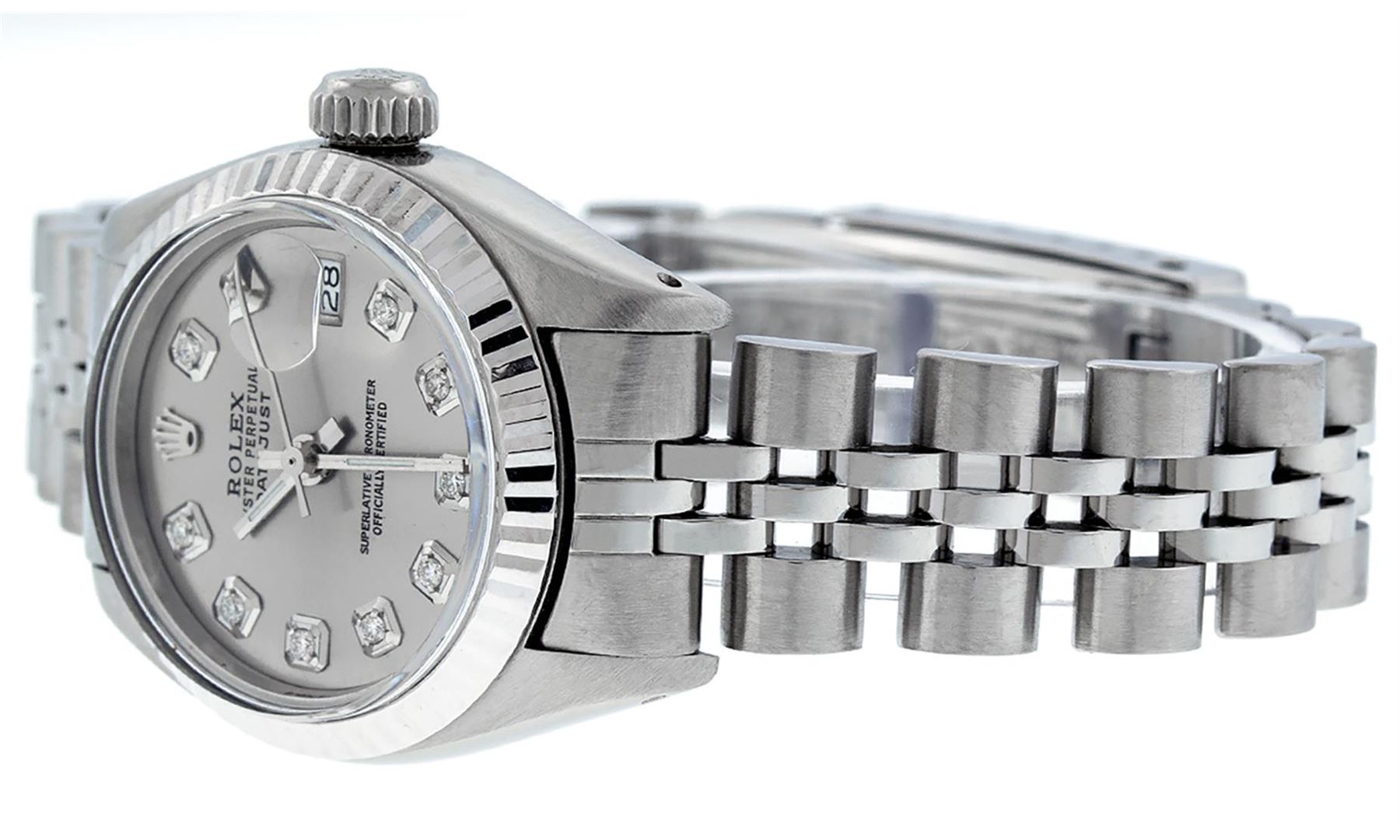 One Ladies Stainless Steel Rolex Datejust Polished Bright with Satin Finish, Serviced & Electronically Tested, Stainless Steel Case: 26mm, Stainless Steel Crown, Bezel: 14K White Gold Bezel. Custom Crystal: New Acrylic Cyclops Lens. Custom Hands: New Luminescent Hands. Movement: Automatic Winding Movement Caliber 2030. Dial: Slate Grey Diamond Dial, Diamond Count: 10 Diamonds In Dial, Color: G to H, Clarity: SI-VS. Date Window: 3 O'Clock Position Date Display, Model: Datejust. Condition: G-6 Extra Fine. Bracelet: Stainless Steel Jubilee Band. Bright Polish & Satin Finish. 6.0 Inch Length, Adjustable. Standard Clasp, With Rolex Logo. This Watch Has Been Serviced Time Tested And Is In Excellent Condition It Is Free Of All Scratches And Dents.