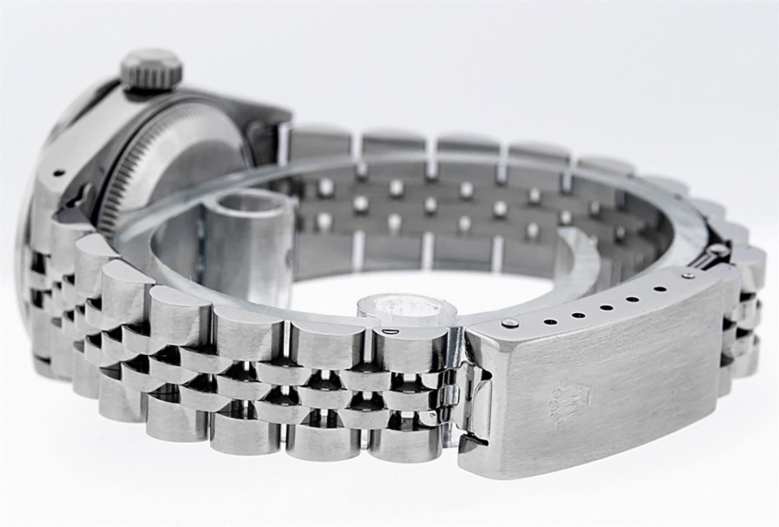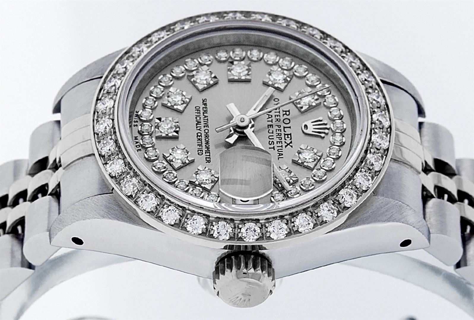 One Ladies Stainless Steel Rolex Datejust Polished Bright with Satin Finish, Serviced & Electronically Tested, Stainless Steel Case: 26mm, Stainless Steel Crown. Custom Bezel: New 18K White Gold Beadset Diamond Bezel, Diamond Count: 32 Diamonds. Total Weight .70 Carat, Clarity: SI-VS, Color: G to H. Custom Crystal: New Scratch Resistant Synthetic Sapphire Cyclops Lens. Custom Hands: New Luminescent Hands. Movement: Automatic Winding Movement Caliber 2030. Custom Dial: Refinished Slate Grey String Diamond Dial, Stone Count: 43 Diamonds In Dial, G To H In Color, Clarity: SI-VS. Date Window: 3 O'Clock Position Date Display, Model: Datejust. Condition: G-6 Extra Fine. Bracelet: Stainless Steel Jubilee Band. Bright Polish & Satin Finish. 6.0 Inch Length, Adjustable. Standard Clasp, With Rolex Logo. This Watch Has Been Serviced Time Tested And Is In Excellent Condition It Is Free Of All Scratches And Dents.