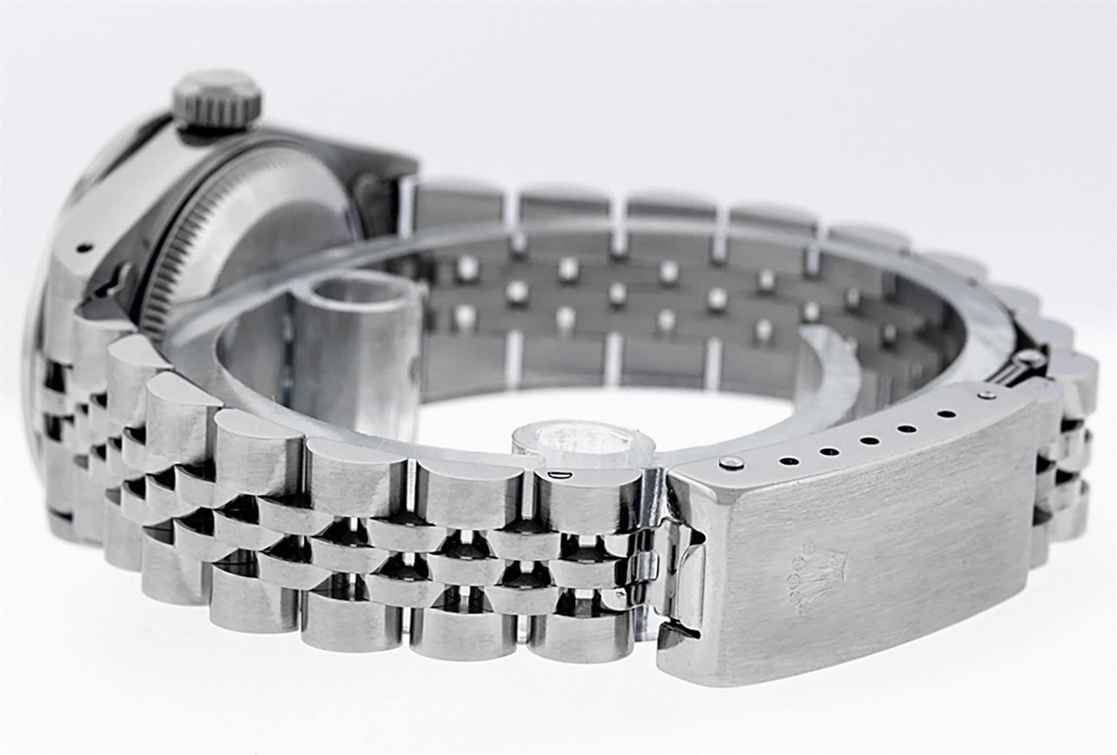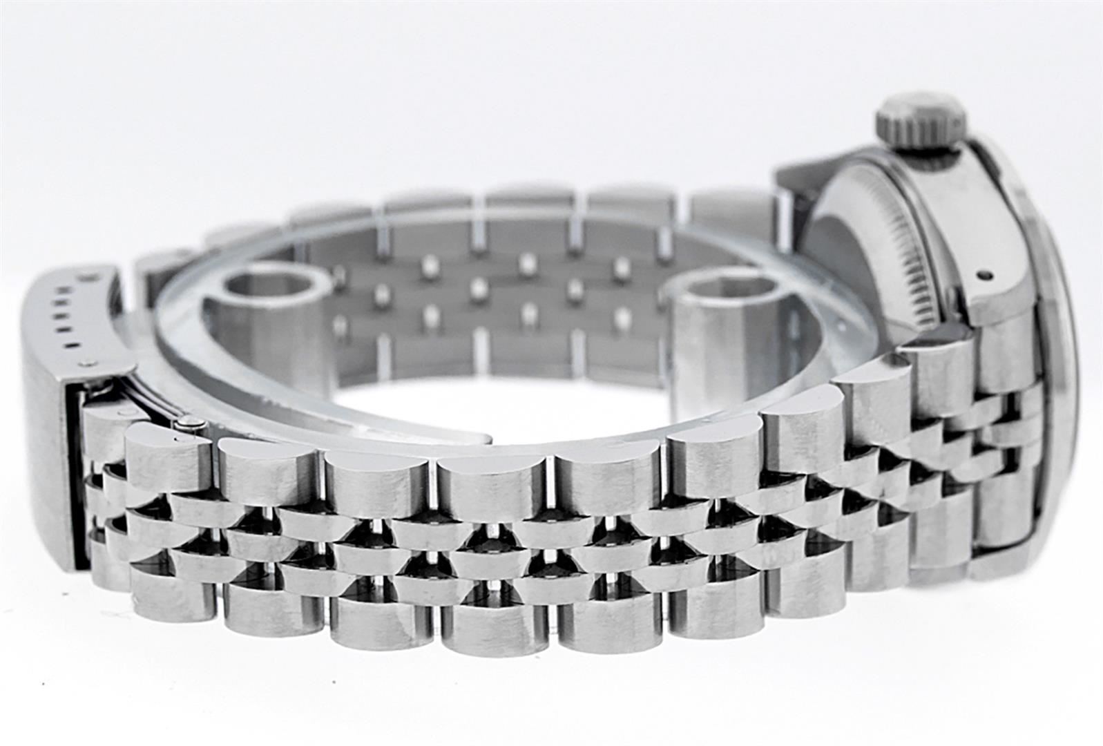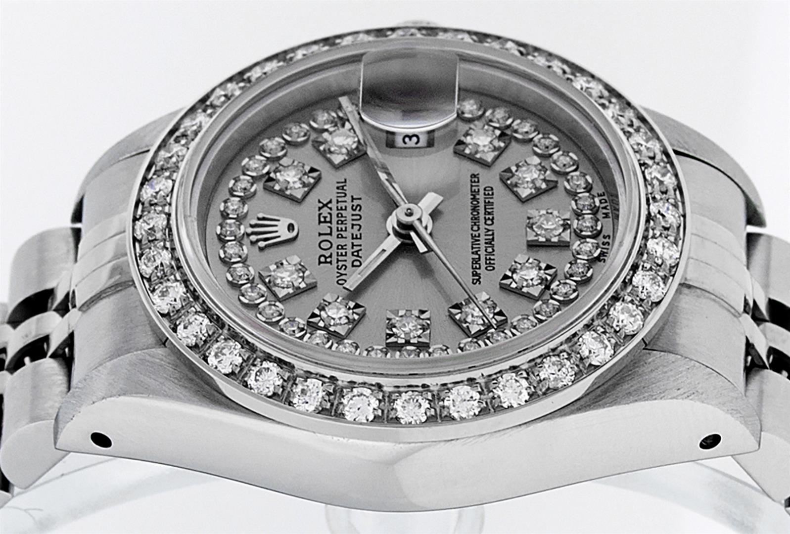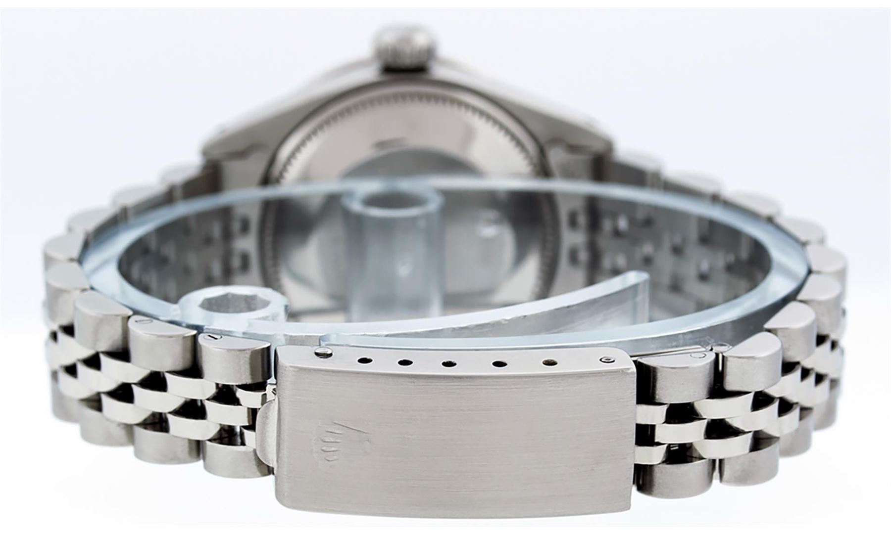 One Ladies Stainless Steel Rolex Oyster Perpetual Datejust Polished Bright with Satin Finish, Serviced & Electronically Tested, Stainless Steel Case: 26mm, Stainless Steel Crown. Custom Bezel: New 18K White Gold Beadset Diamond Bezel, Diamond Count: 32 Diamonds. Total Weight .70 Carat, Clarity: SI-VS, Color: G to H. Custom Crystal: New Scratch Resistant Synthetic Sapphire Cyclops Lens. Custom Hands: New Luminescent Hands. Movement: Automatic Winding Movement. Custom Dial: Refinished Slate Grey String Diamond Dial, Stone Count: 43 Diamonds In Dial, G To H In Color, Clarity: SI-VS. Date Window: 3 O'clock Position Date Display, Model: Datejust. Condition: G-6 Extra Fine. Bracelet: Stainless Steel Jubilee Band. Bright Polish & Satin Finish. 6.0 Inch Length, Adjustable. Standard Clasp, With Rolex Logo. This Watch Has Been Serviced Time Tested And Is In Excellent Condition It Is Free Of All Scratches And Dents.