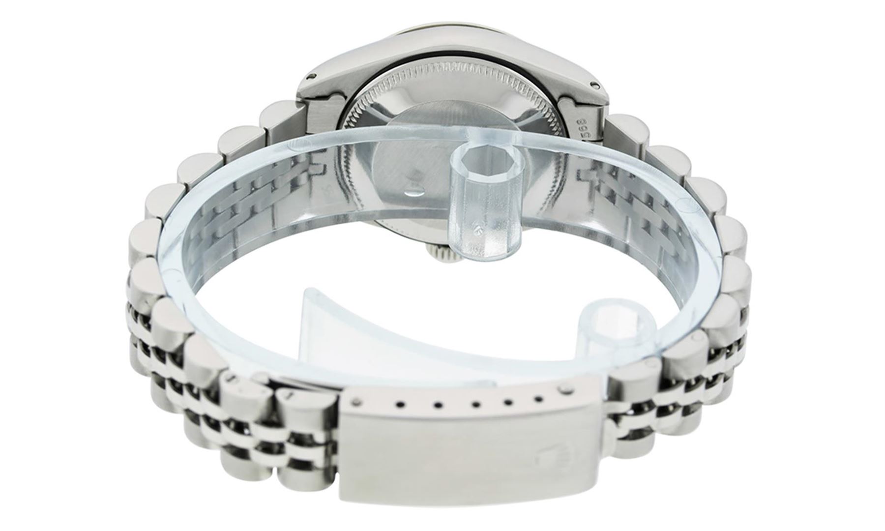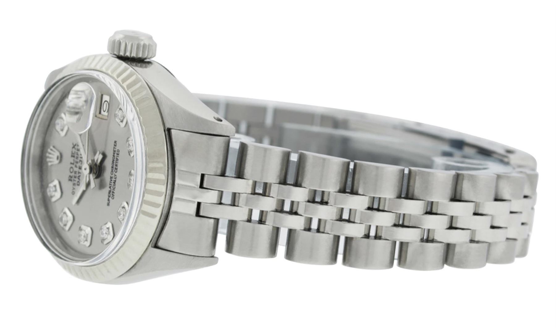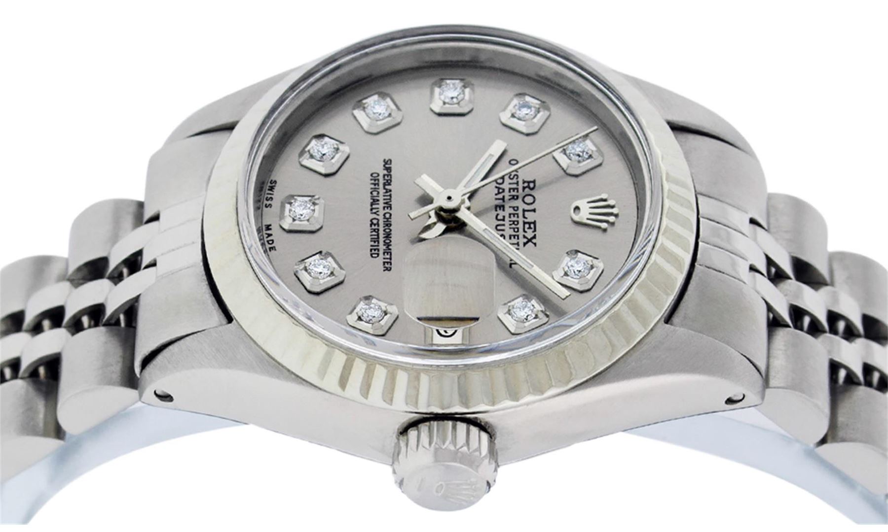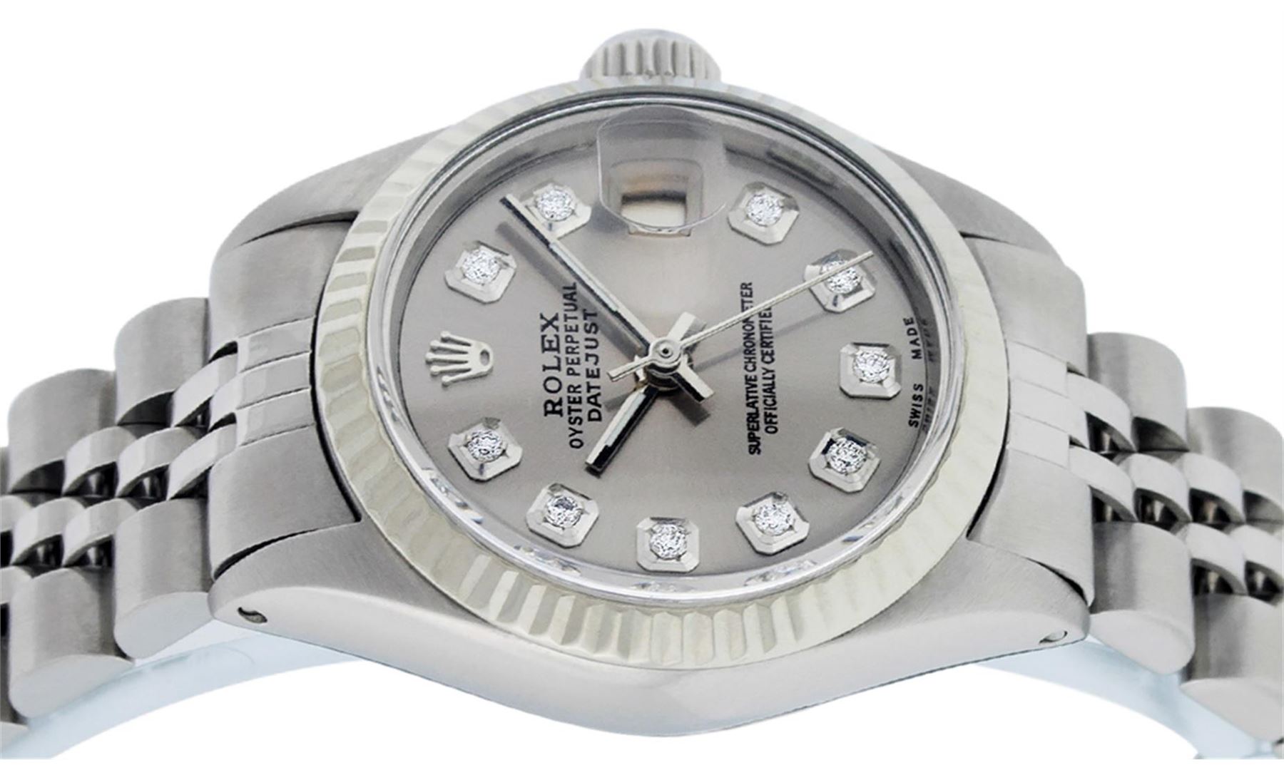 One Ladies Stainless Steel Pre Owned Rolex Datejust Polished Bright with Satin Finish, Serviced & Electronically Tested, Rolex Stainless Steel Case: 26mm, Rolex Stainless Steel Crown, Rolex Bezel: White Gold Bezel. Custom Crystal: New Acrylic Cyclops Lens. Custom Hands: New Luminescent Hands. Rolex Movement: Automatic Winding Movement. Custom Dial: Refinished To Slate Grey Diamond Dial, Diamond Count: 10 Diamonds In Dial, Color: G to H, Clarity: SI-VS. Date Window: 3 O'Clock Position Date Display, Model: Datejust. Condition: G-6 Extra Fine. Rolex Bracelet: Stainless Steel Jubilee Band. Bright Polish & Satin Finish. 6.0 Inch Length, Adjustable. Standard Clasp, With Rolex Logo. This Watch Has Been Serviced Time Tested And Is In Excellent Condition It Is Free Of All Scratches And Dents.