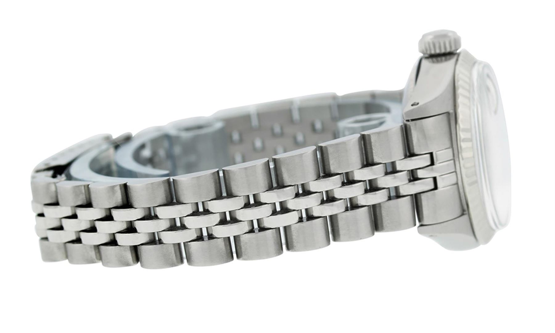 One Ladies Stainless Steel Pre Owned Rolex Datejust Polished Bright with Satin Finish, Serviced & Electronically Tested, Rolex Stainless Steel Case: 26mm, Rolex Stainless Steel Crown, Rolex Bezel: White Gold Bezel. Custom Crystal: New Acrylic Cyclops Lens. Custom Hands: New Luminescent Hands. Rolex Movement: Automatic Winding Movement. Custom Dial: Refinished To Slate Grey Diamond Dial, Diamond Count: 10 Diamonds In Dial, Color: G to H, Clarity: SI-VS. Date Window: 3 O'Clock Position Date Display, Model: Datejust. Condition: G-6 Extra Fine. Rolex Bracelet: Stainless Steel Jubilee Band. Bright Polish & Satin Finish. 6.0 Inch Length, Adjustable. Standard Clasp, With Rolex Logo. This Watch Has Been Serviced Time Tested And Is In Excellent Condition It Is Free Of All Scratches And Dents.