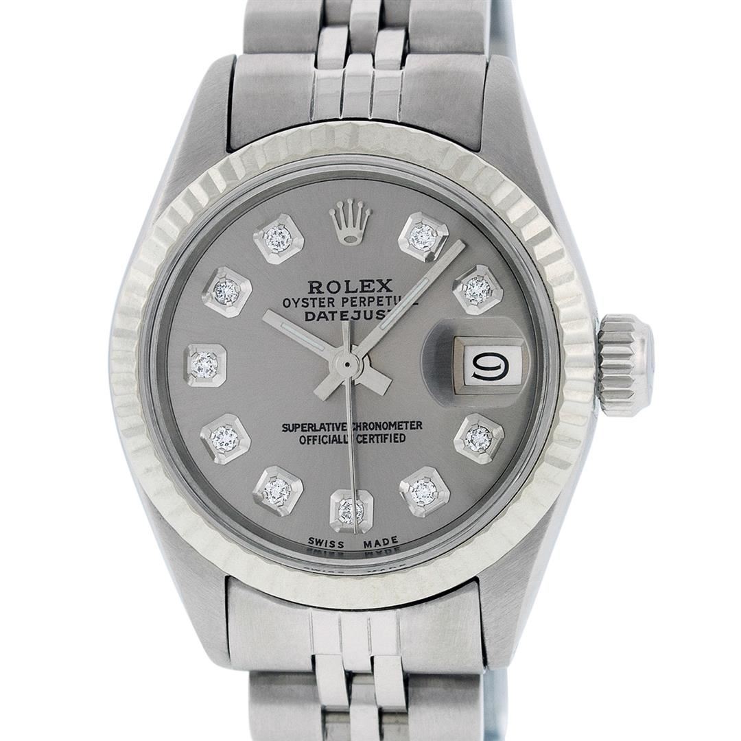 One Ladies Stainless Steel Pre Owned Rolex Datejust Polished Bright with Satin Finish, Serviced & Electronically Tested, Rolex Stainless Steel Case: 26mm, Rolex Stainless Steel Crown, Rolex Bezel: White Gold Bezel. Custom Crystal: New Acrylic Cyclops Lens. Custom Hands: New Luminescent Hands. Rolex Movement: Automatic Winding Movement. Custom Dial: Refinished To Slate Grey Diamond Dial, Diamond Count: 10 Diamonds In Dial, Color: G to H, Clarity: SI-VS. Date Window: 3 O'Clock Position Date Display, Model: Datejust. Condition: G-6 Extra Fine. Rolex Bracelet: Stainless Steel Jubilee Band. Bright Polish & Satin Finish. 6.0 Inch Length, Adjustable. Standard Clasp, With Rolex Logo. This Watch Has Been Serviced Time Tested And Is In Excellent Condition It Is Free Of All Scratches And Dents.