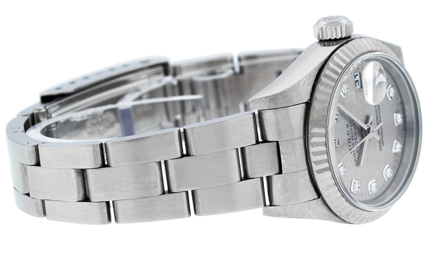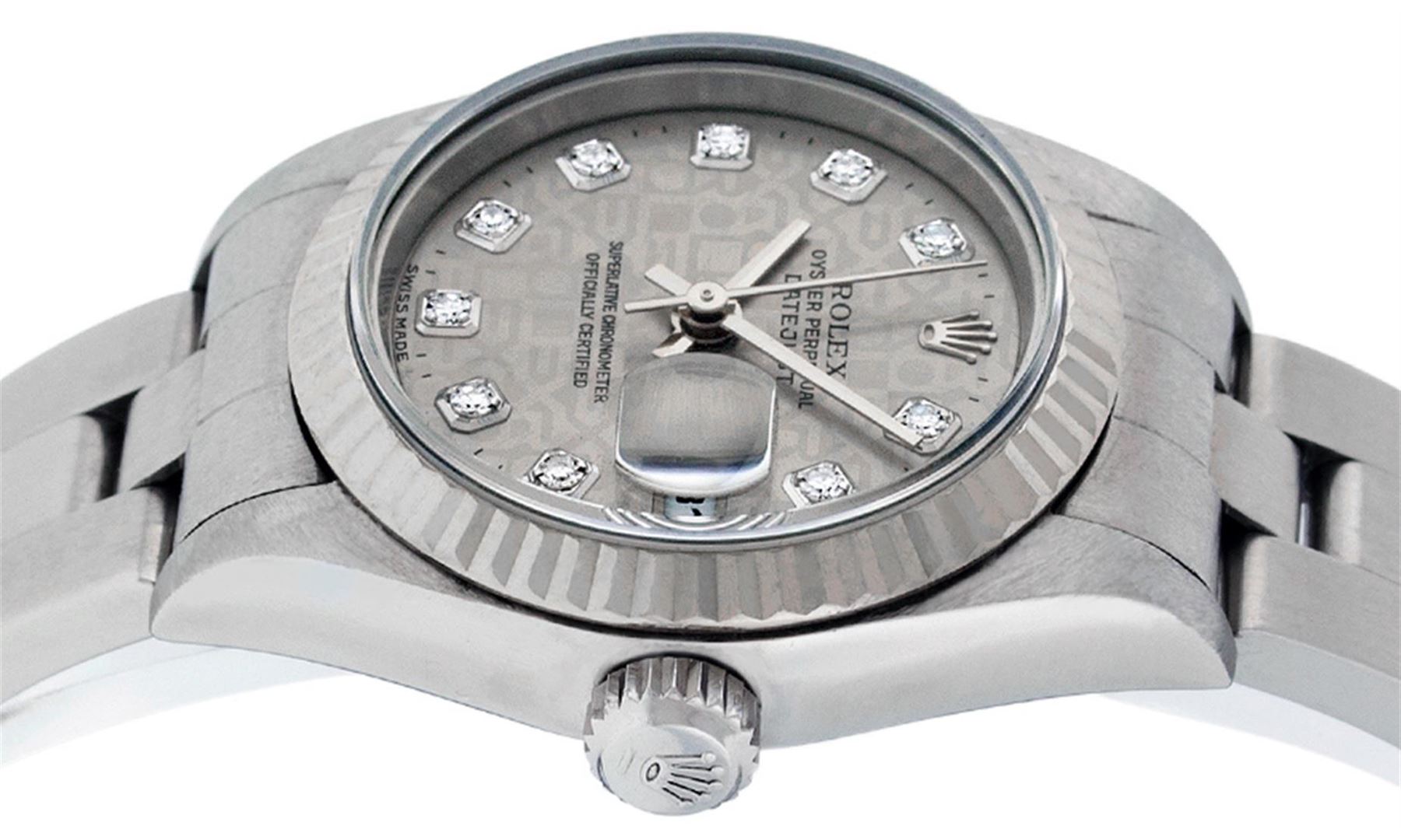 One Ladies Pre Owned Quickset Stainless Steel Rolex Oyster Perpetual Datejust Polished Bright with Satin Finish, Serviced & Electronically Tested, Rolex Stainless Steel Case: 26mm, Rolex Stainless Steel Crown, Rolex Bezel: 18K White Gold Fluted Bezel. Custom Crystal: New Scratch Resistant Sapphire Cyclops Lens. Custom Hands: New Luminescent Hands. Rolex Movement: Automatic Winding Movement. Custom Dial: Refinished To Slate Grey Jubilee With Added Diamonds, Diamond Count: 10 Single Cut Diamonds In Dial, Color: G to H, Clarity: VS2. Date Window: 3 O'Clock Position Date Display, Model: Sapphire Quickset Datejust Caliber 2230. Condition: G-6 Extra Fine. Rolex Bracelet: Stainless Steel Oyster Band. Bright Polish & Satin Finish. 6.0 Inch Length, Adjustable. Standard Clasp, With Rolex Logo. This Watch Has Been Serviced Time Tested And Is In Excellent Condition It Is Free Of All Scratches And Dents.