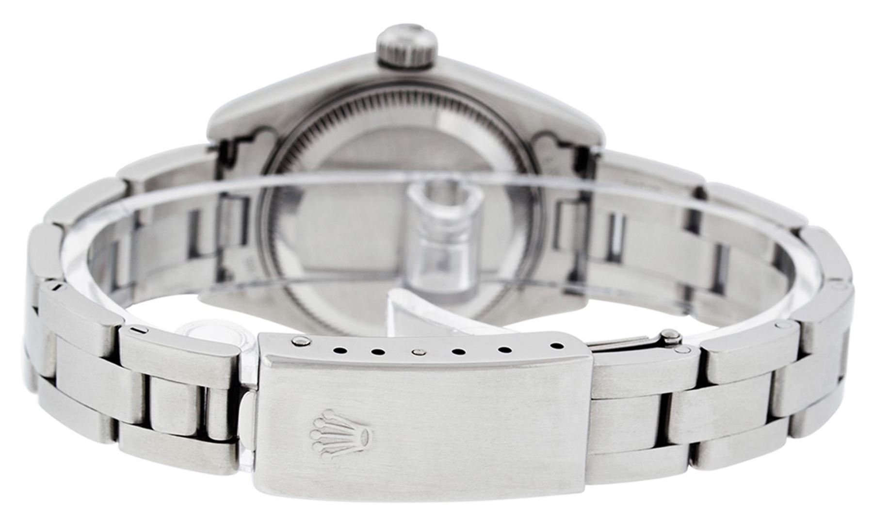 One Ladies Pre Owned Quickset Stainless Steel Rolex Oyster Perpetual Datejust Polished Bright with Satin Finish, Serviced & Electronically Tested, Rolex Stainless Steel Case: 26mm, Rolex Stainless Steel Crown, Rolex Bezel: 18K White Gold Fluted Bezel. Custom Crystal: New Scratch Resistant Sapphire Cyclops Lens. Custom Hands: New Luminescent Hands. Rolex Movement: Automatic Winding Movement. Custom Dial: Refinished To Slate Grey Jubilee With Added Diamonds, Diamond Count: 10 Single Cut Diamonds In Dial, Color: G to H, Clarity: VS2. Date Window: 3 O'Clock Position Date Display, Model: Sapphire Quickset Datejust Caliber 2230. Condition: G-6 Extra Fine. Rolex Bracelet: Stainless Steel Oyster Band. Bright Polish & Satin Finish. 6.0 Inch Length, Adjustable. Standard Clasp, With Rolex Logo. This Watch Has Been Serviced Time Tested And Is In Excellent Condition It Is Free Of All Scratches And Dents.