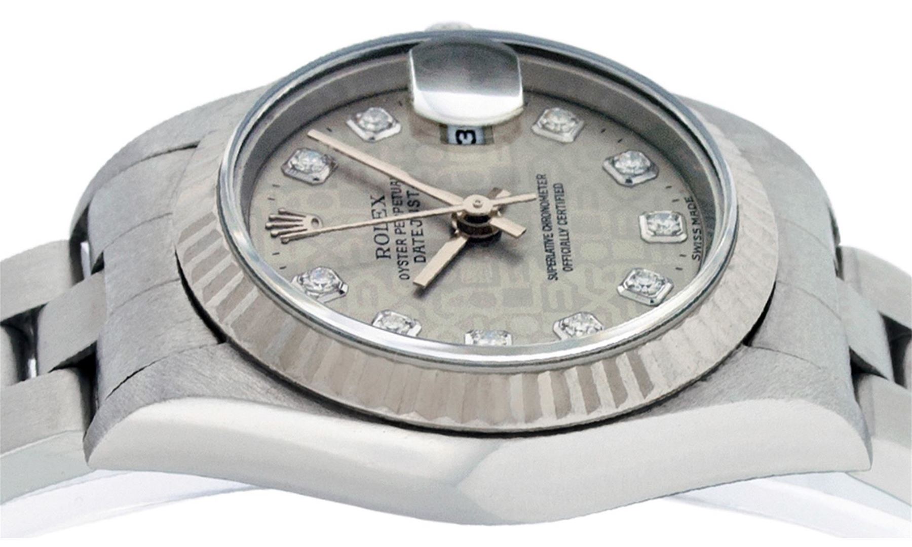 One Ladies Pre Owned Quickset Stainless Steel Rolex Oyster Perpetual Datejust Polished Bright with Satin Finish, Serviced & Electronically Tested, Rolex Stainless Steel Case: 26mm, Rolex Stainless Steel Crown, Rolex Bezel: 18K White Gold Fluted Bezel. Custom Crystal: New Scratch Resistant Sapphire Cyclops Lens. Custom Hands: New Luminescent Hands. Rolex Movement: Automatic Winding Movement. Custom Dial: Refinished To Slate Grey Jubilee With Added Diamonds, Diamond Count: 10 Single Cut Diamonds In Dial, Color: G to H, Clarity: VS2. Date Window: 3 O'Clock Position Date Display, Model: Sapphire Quickset Datejust Caliber 2230. Condition: G-6 Extra Fine. Rolex Bracelet: Stainless Steel Oyster Band. Bright Polish & Satin Finish. 6.0 Inch Length, Adjustable. Standard Clasp, With Rolex Logo. This Watch Has Been Serviced Time Tested And Is In Excellent Condition It Is Free Of All Scratches And Dents.