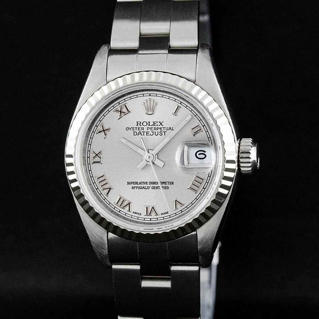 One Ladies Pre Owned Stainless Steel Rolex Datejust Polished Bright with Satin Finish, Serviced & Electronically Tested, Rolex Stainless Steel Case: 26mm, Rolex Stainless Steel Crown, Rolex Bezel: White Gold Bezel. Custom Crystal: New Acrylic Cyclops Lens. Custom Hands: New Luminescent Hands. Rolex Movement: Automatic Winding Movement. Custom Dial: Refinished To Slate Grey Roman Dial. Date Window: 3 O'Clock Position Date Display, Model: Datejust. Condition: G-6 Extra Fine. Rolex Bracelet: Stainless Steel Oyster Band. Bright Polish & Satin Finish. 6.0 Inch Length, Adjustable. Standard Clasp, With Rolex Logo. This Watch Has Been Serviced Time Tested And Is In Excellent Condition It Is Free Of All Scratches And Dents.
