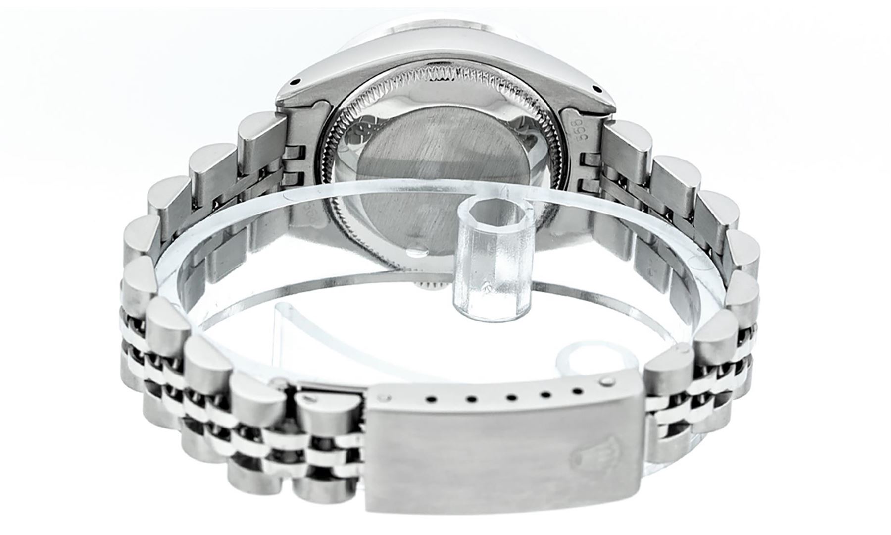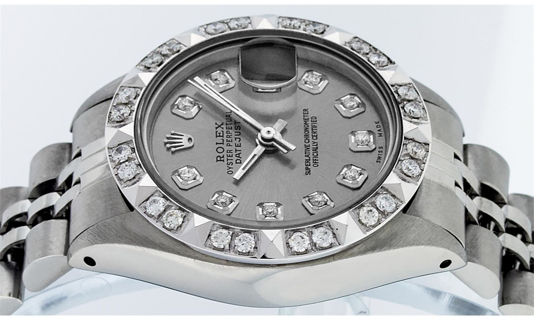 One Ladies Stainless Steel Rolex Datejust Polished Bright with Satin Finish, Serviced & Electronically Tested, Stainless Steel Case: 26mm, Stainless Steel Crown, Custom Bezel: New 18K White Gold Pyramid Diamond Bezel, Diamond Count: 24 Diamonds In Dial. Total Weight .50 Carat, Clarity: SI-VS, Color: G to H. Custom Crystal: New Scratch Resistant Synthetic Sapphire Cyclops Lens. Custom Hands: New Luminescent Hands. Movement: Automatic Winding Movement Caliber 2030. Custom Dial: Slate Grey Diamond Dial. Diamond Count: 10 Diamonds In Dial. Clarity: SI-VS, Color: G to H. Date Window: 3 O'Clock Position Date Display, Model: Datejust. Condition: G-6 Extra Fine. Bracelet: Stainless Steel Jubilee Band With Rolex Crown On Buckle. Bright Polish & Satin Finish. Band Length: 6.0 Inch Length, Adjustable. Standard Clasp, With Rolex Logo. This Watch Has Been Serviced Time Tested And Is In Excellent Condition It Is Free Of All Scratches And Dents.