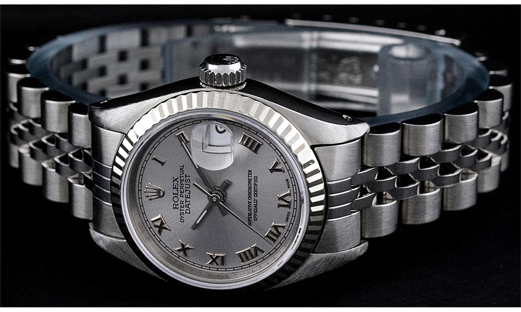 One Ladies Pre Owned Stainless Steel Rolex Polished Bright with Satin Finish, Serviced & Electronically Tested, Rolex Stainless Steel Case: 26mm, Rolex Stainless Steel Crown, Rolex Bezel: 14K White Gold Bezel. Custom Crystal: New Sapphire With Date Window. Custom Hands: New Luminescent Hands. Rolex Movement: Automatic Winding Movement. Custom Dial: Slate Grey Roman With Square Track. Date Window: 3 O'Clock Position Date Display, Model: Datejust. Condition: G-6 Extra Fine. Rolex Bracelet: Stainless Steel Jubilee Band. Bright Polish & Satin Finish. 6.0 Inch Length, Adjustable. Standard Clasp, With Rolex Logo. This Pre Owned Watch Has Been Serviced Time Tested And Is In Excellent Condition It Is Free Of All Scratches And Dents.