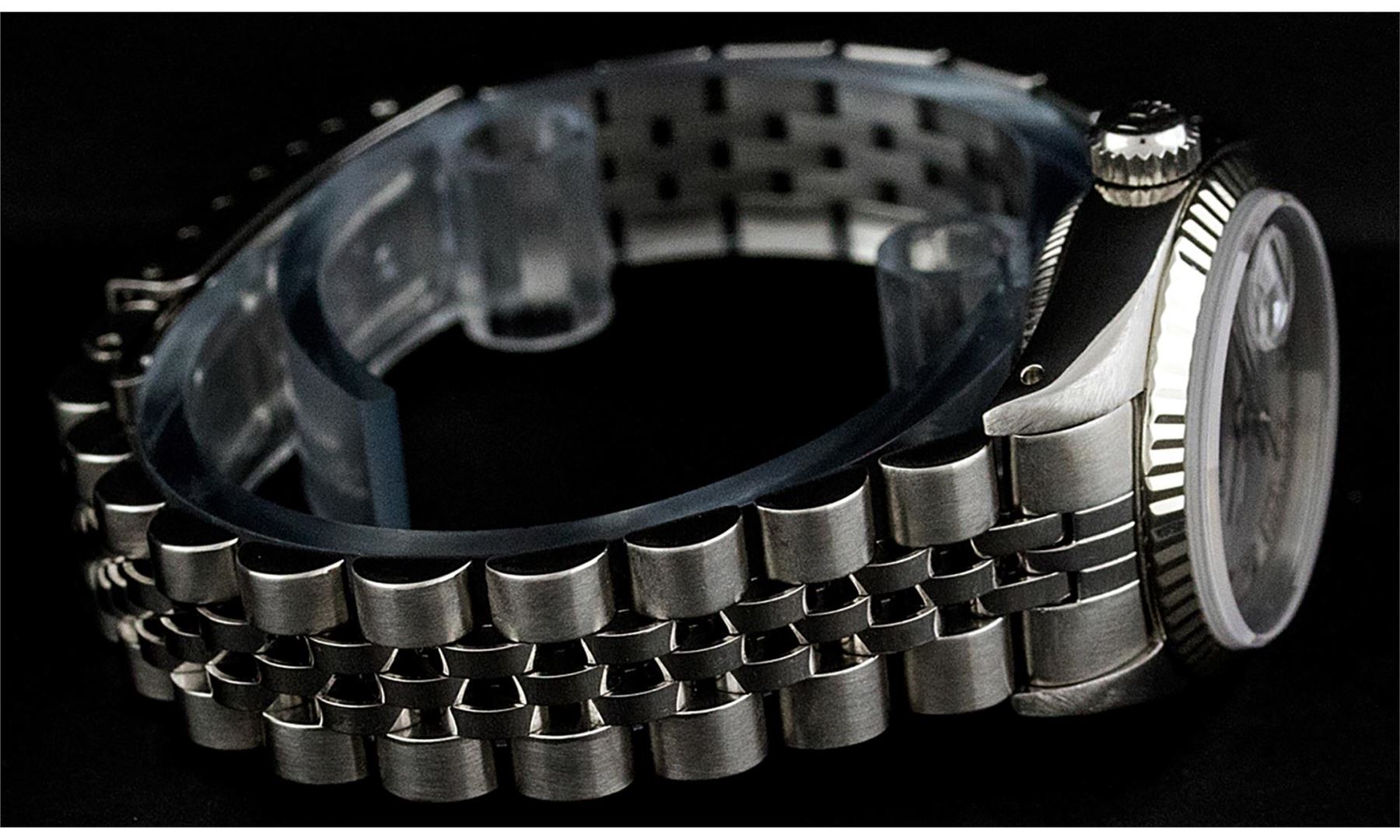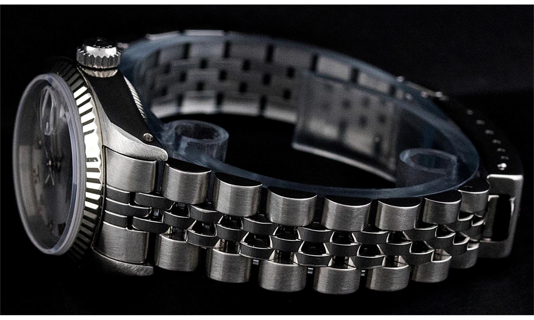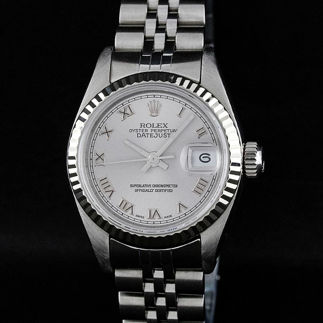 One Ladies Pre Owned Stainless Steel Rolex Polished Bright with Satin Finish, Serviced & Electronically Tested, Rolex Stainless Steel Case: 26mm, Rolex Stainless Steel Crown, Rolex Bezel: 14K White Gold Bezel. Custom Crystal: New Sapphire With Date Window. Custom Hands: New Luminescent Hands. Rolex Movement: Automatic Winding Movement. Custom Dial: Slate Grey Roman With Square Track. Date Window: 3 O'Clock Position Date Display, Model: Datejust. Condition: G-6 Extra Fine. Rolex Bracelet: Stainless Steel Jubilee Band. Bright Polish & Satin Finish. 6.0 Inch Length, Adjustable. Standard Clasp, With Rolex Logo. This Pre Owned Watch Has Been Serviced Time Tested And Is In Excellent Condition It Is Free Of All Scratches And Dents.