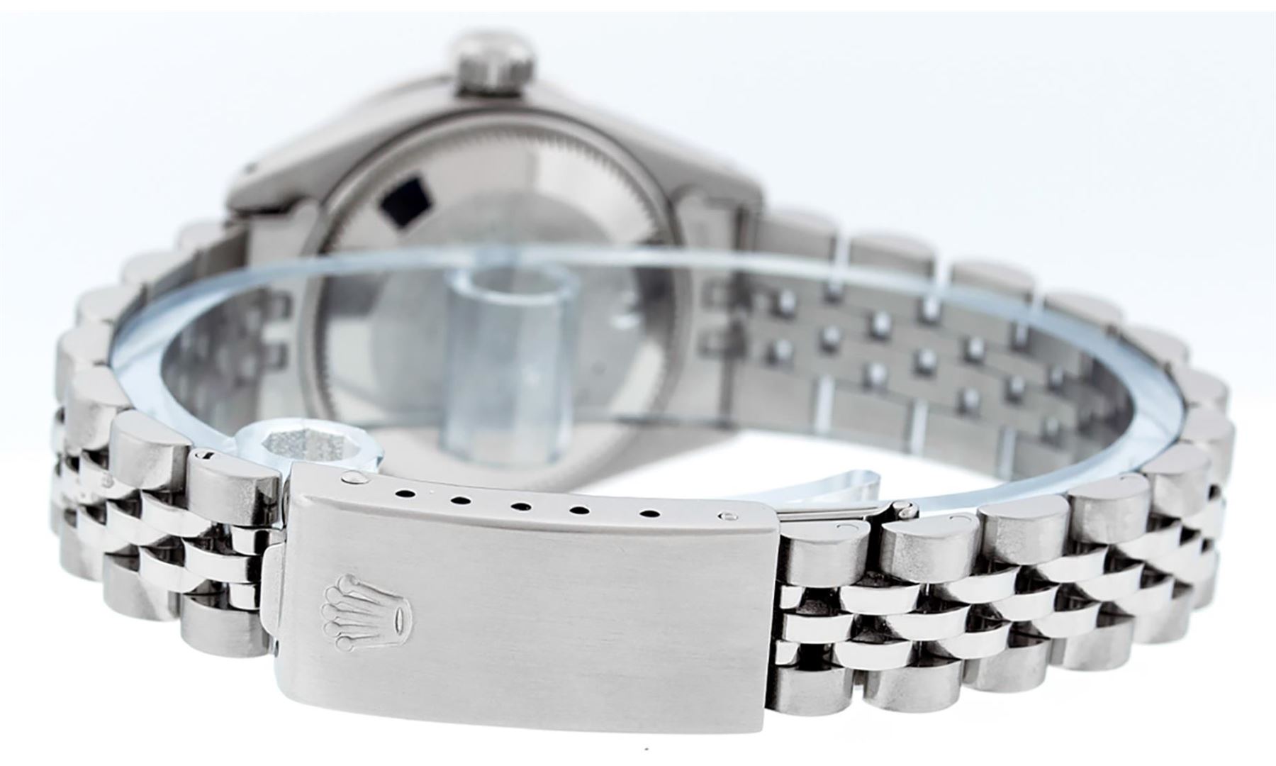 One Ladies Pre Owned Stainless Steel Rolex Polished Bright with Satin Finish, Serviced & Electronically Tested, Rolex Stainless Steel Case: 26mm, Rolex Stainless Steel Crown, Rolex Bezel: 14K White Gold Bezel. Custom Crystal: New Sapphire With Date Window. Custom Hands: New Luminescent Hands. Rolex Movement: Automatic Winding Movement. Custom Dial: Slate Grey Roman With Square Track. Date Window: 3 O'Clock Position Date Display, Model: Datejust. Condition: G-6 Extra Fine. Rolex Bracelet: Stainless Steel Jubilee Band. Bright Polish & Satin Finish. 6.0 Inch Length, Adjustable. Standard Clasp, With Rolex Logo. This Pre Owned Watch Has Been Serviced Time Tested And Is In Excellent Condition It Is Free Of All Scratches And Dents.
