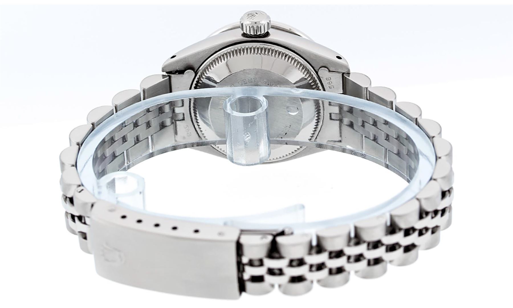 One Ladies Pre Owned Stainless Steel Rolex Polished Bright with Satin Finish, Serviced & Electronically Tested, Rolex Stainless Steel Case: 26mm, Rolex Stainless Steel Crown, Rolex Bezel: 14K White Gold Bezel. Custom Crystal: New Sapphire With Date Window. Custom Hands: New Luminescent Hands. Rolex Movement: Automatic Winding Movement. Custom Dial: Slate Grey Roman With Square Track. Date Window: 3 O'Clock Position Date Display, Model: Datejust. Condition: G-6 Extra Fine. Rolex Bracelet: Stainless Steel Jubilee Band. Bright Polish & Satin Finish. 6.0 Inch Length, Adjustable. Standard Clasp, With Rolex Logo. This Pre Owned Watch Has Been Serviced Time Tested And Is In Excellent Condition It Is Free Of All Scratches And Dents.