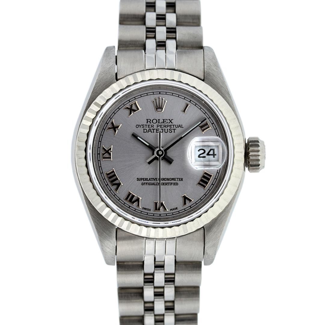 One Ladies Pre Owned Stainless Steel Rolex Polished Bright with Satin Finish, Serviced & Electronically Tested, Rolex Stainless Steel Case: 26mm, Rolex Stainless Steel Crown, Rolex Bezel: 14K White Gold Bezel. Custom Crystal: New Sapphire With Date Window. Custom Hands: New Luminescent Hands. Rolex Movement: Automatic Winding Movement. Custom Dial: Slate Grey Roman With Square Track. Date Window: 3 O'Clock Position Date Display, Model: Datejust. Condition: G-6 Extra Fine. Rolex Bracelet: Stainless Steel Jubilee Band. Bright Polish & Satin Finish. 6.0 Inch Length, Adjustable. Standard Clasp, With Rolex Logo. This Pre Owned Watch Has Been Serviced Time Tested And Is In Excellent Condition It Is Free Of All Scratches And Dents.