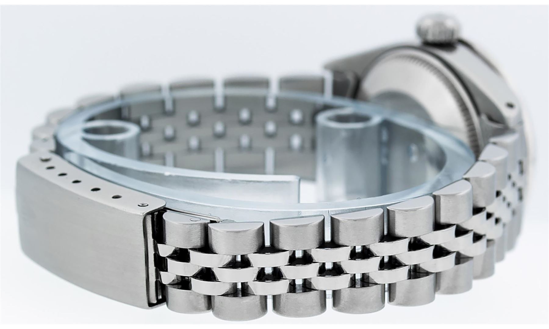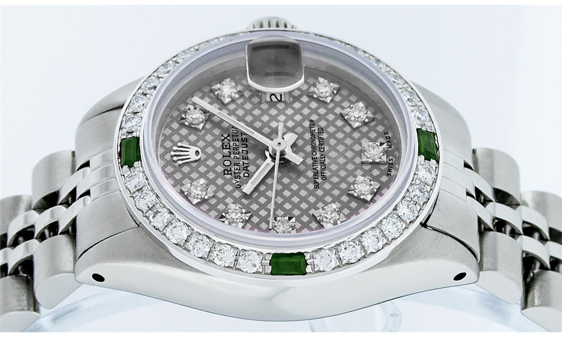 One Ladies Stainless Steel Rolex Datejust Polished Bright with Satin Finish, Serviced & Electronically Tested, Stainless Steel Case: 26mm, Stainless Steel Crown, Custom Bezel: New 18K White Emerald Beadset Diamond Bezel, Diamond + Gem Count:� 28 Diamonds + 4 Emeralds. Total Weight .70 Carat, Clarity: SI-VS, Color: G to H. Custom Crystal: New Scratch Resistant Synthetic Sapphire Cyclops Lens. Custom Hands: New Luminescent Hands. Movement: Automatic Winding Movement Caliber 2030. Custom Dial: Slate Grey Stamp With Single Cut Diamond Hour Markers, 10 Diamonds in Dial, G To H In Color, Clarity: SI-VS. Date Window: 3 O'Clock Position Date Display, Model: Datejust. Condition: G-6 Extra Fine. Bracelet: Stainless Steel Jubilee Band. Bright Polish & Satin Finish. 6.0 Inch Length, Adjustable. Standard Clasp, With Rolex Logo. This Watch Has Been Serviced Time Tested And Is In Excellent Condition It Is Free Of All Scratches And Dents.