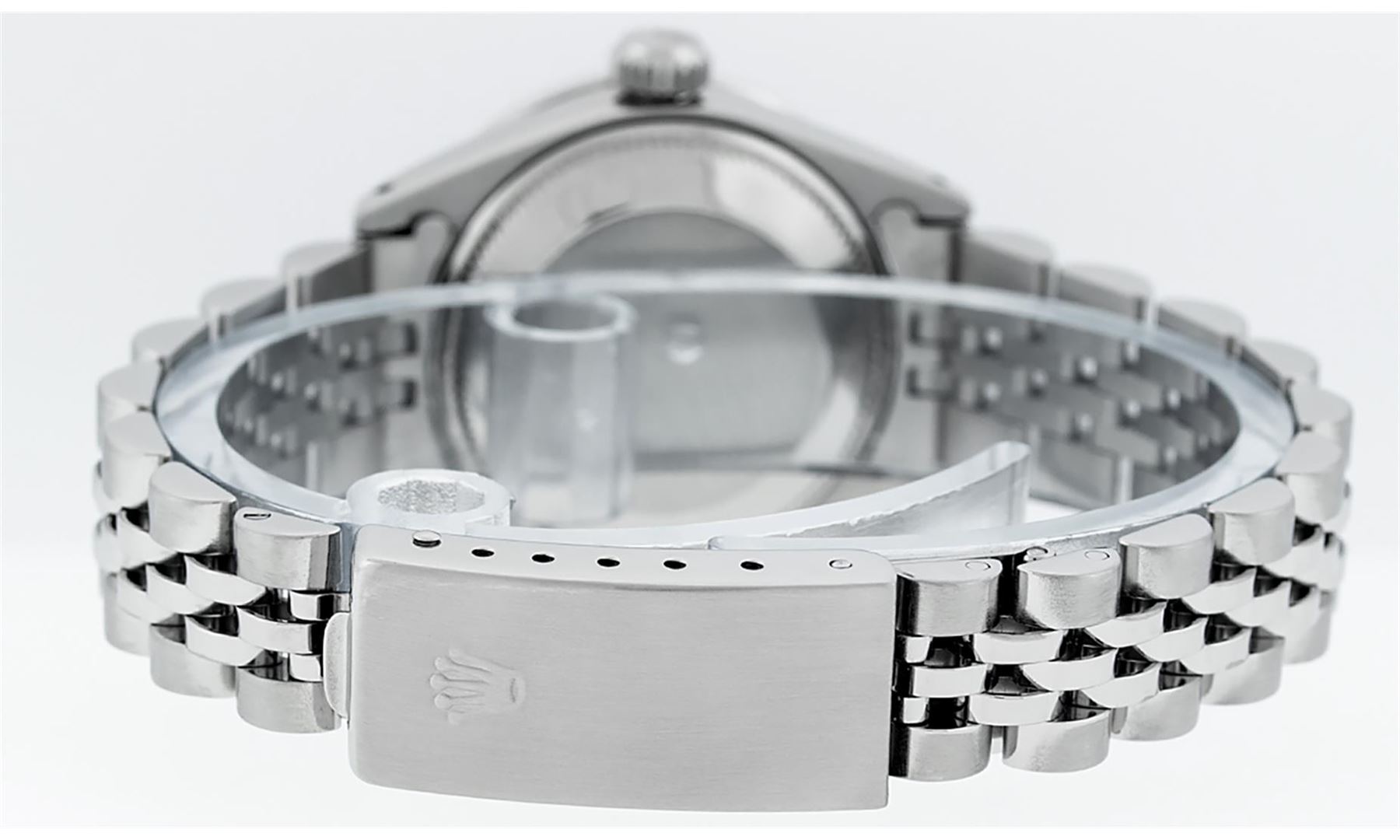 One Ladies Stainless Steel Rolex Datejust Polished Bright with Satin Finish, Serviced & Electronically Tested, Stainless Steel Case: 26mm, Stainless Steel Crown, Custom Bezel: New 18K White Gold Sapphire Beadset Diamond Bezel, Diamond + Gem Count: 28 Diamonds + 4 Sapphires. Total Weight .70 Carat, Clarity: SI-VS, Color: G to H. Custom Crystal: New Scratch Resistant Synthetic Sapphire Cyclops Lens. Custom Hands: New Luminescent Hands. Movement: Automatic Winding Movement Caliber 2030. Custom Dial: Slate Grey Stamp With Single Cut Diamond Hour Markers, 10 Diamonds in Dial, G To H In Color, Clarity: SI-VS. Date Window: 3 O'Clock Position Date Display, Model: Datejust. Condition: G-6 Extra Fine. Bracelet: Stainless Steel Jubilee Band. Bright Polish & Satin Finish. 6.0 Inch Length, Adjustable. Standard Clasp, With Rolex Logo. This Watch Has Been Serviced Time Tested And Is In Excellent Condition It Is Free Of All Scratches And Dents.