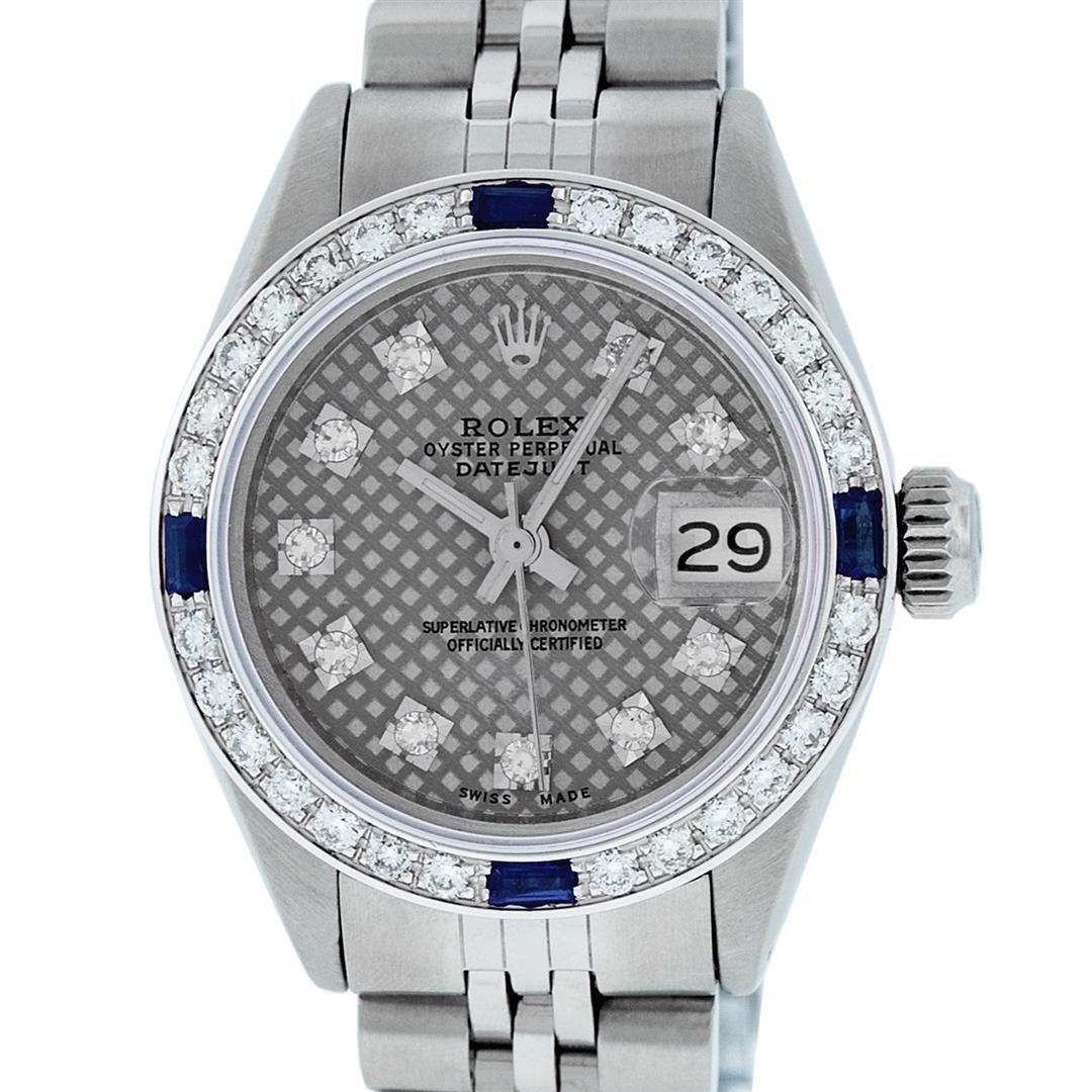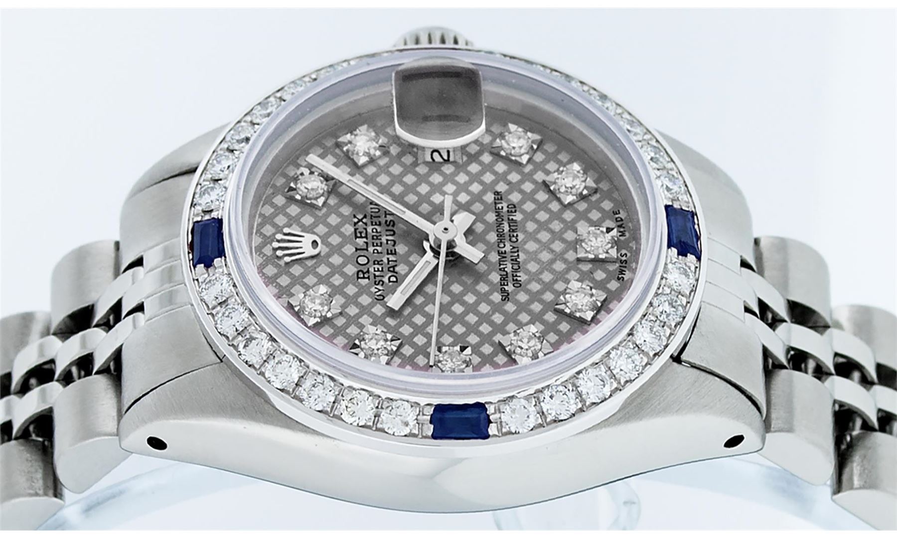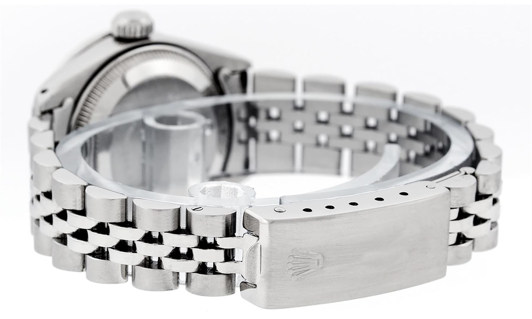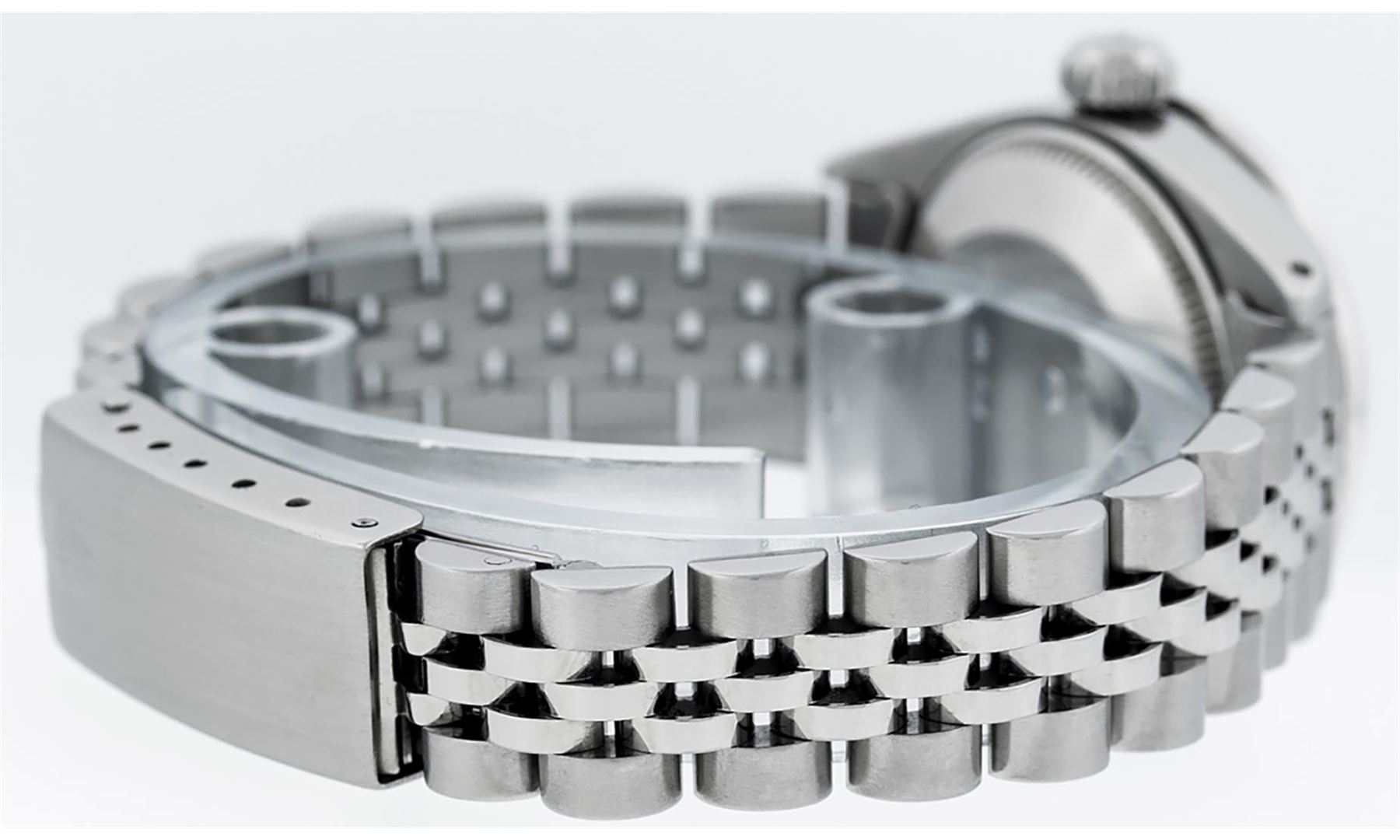 One Ladies Stainless Steel Rolex Datejust Polished Bright with Satin Finish, Serviced & Electronically Tested, Stainless Steel Case: 26mm, Stainless Steel Crown, Custom Bezel: New 18K White Gold Sapphire Beadset Diamond Bezel, Diamond + Gem Count: 28 Diamonds + 4 Sapphires. Total Weight .70 Carat, Clarity: SI-VS, Color: G to H. Custom Crystal: New Scratch Resistant Synthetic Sapphire Cyclops Lens. Custom Hands: New Luminescent Hands. Movement: Automatic Winding Movement Caliber 2030. Custom Dial: Slate Grey Stamp With Single Cut Diamond Hour Markers, 10 Diamonds in Dial, G To H In Color, Clarity: SI-VS. Date Window: 3 O'Clock Position Date Display, Model: Datejust. Condition: G-6 Extra Fine. Bracelet: Stainless Steel Jubilee Band. Bright Polish & Satin Finish. 6.0 Inch Length, Adjustable. Standard Clasp, With Rolex Logo. This Watch Has Been Serviced Time Tested And Is In Excellent Condition It Is Free Of All Scratches And Dents.