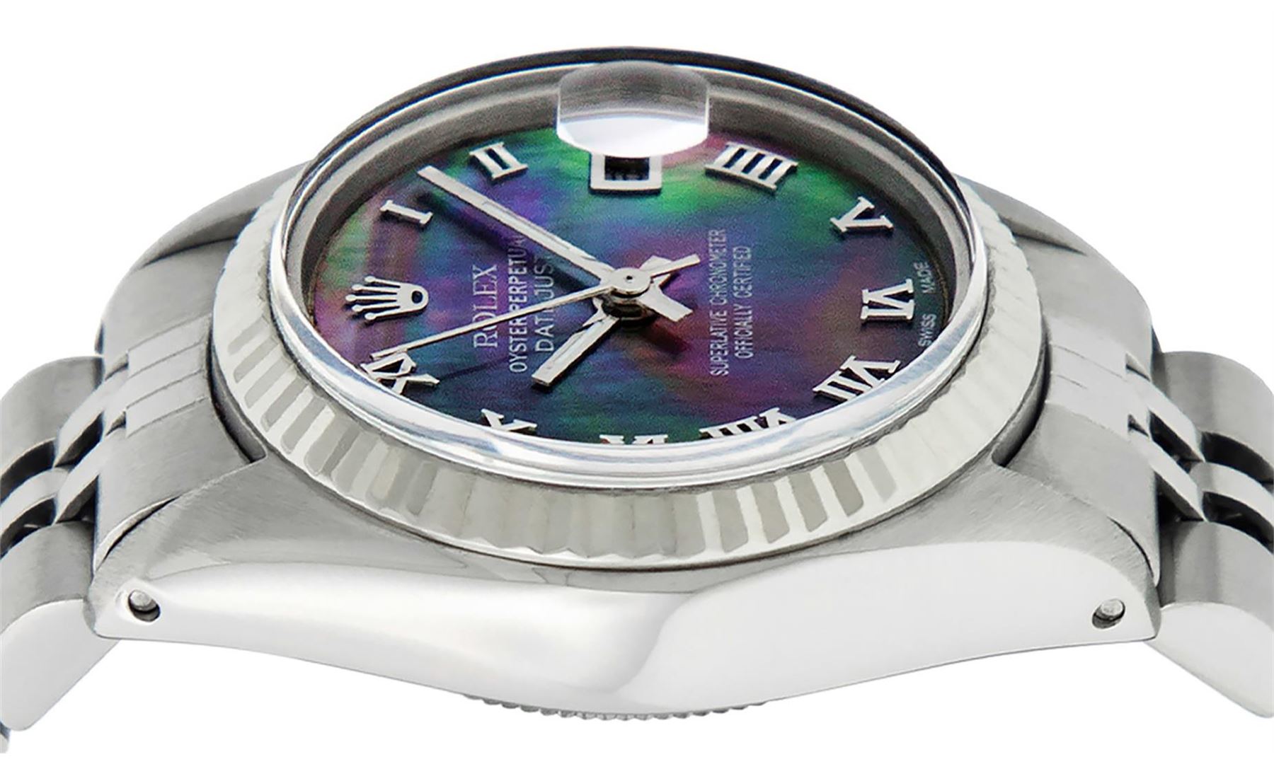 One Ladies Stainless Steel Rolex Datejust Polished Bright with Satin Finish, Serviced & Electronically Tested, Stainless Steel Case: 26mm, Stainless Steel Crown, Bezel: 14K Fluted Bezel. Custom Crystal: New Acrylic Cyclops Lens. Custom Hands: New Luminescent Hands. Movement: Automatic Winding Movement Caliber 2030. Dial: Tahitian Mother Of Pearl Roman Dial. Date Window: 3 O'clock Position Date Display, Model: Datejust. Condition: G-6 Extra Fine. Bracelet: Stainless Steel Jubilee Band. Bright Polish & Satin Finish. 6.0 Inch Length, Adjustable. Standard Clasp, With Rolex Logo. This Watch Has Been Serviced Time Tested And Is In Excellent Condition It Is Free Of All Scratches And Dents.