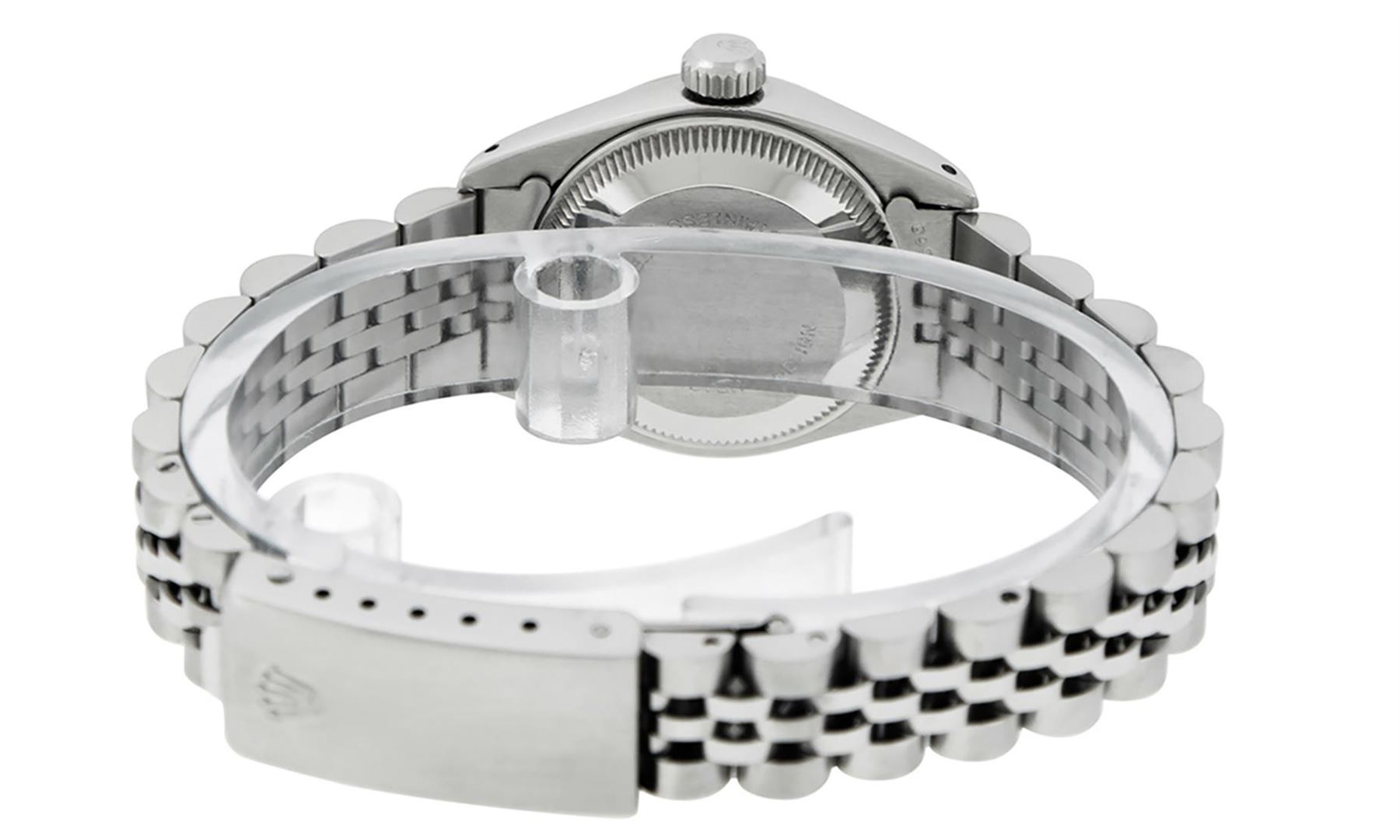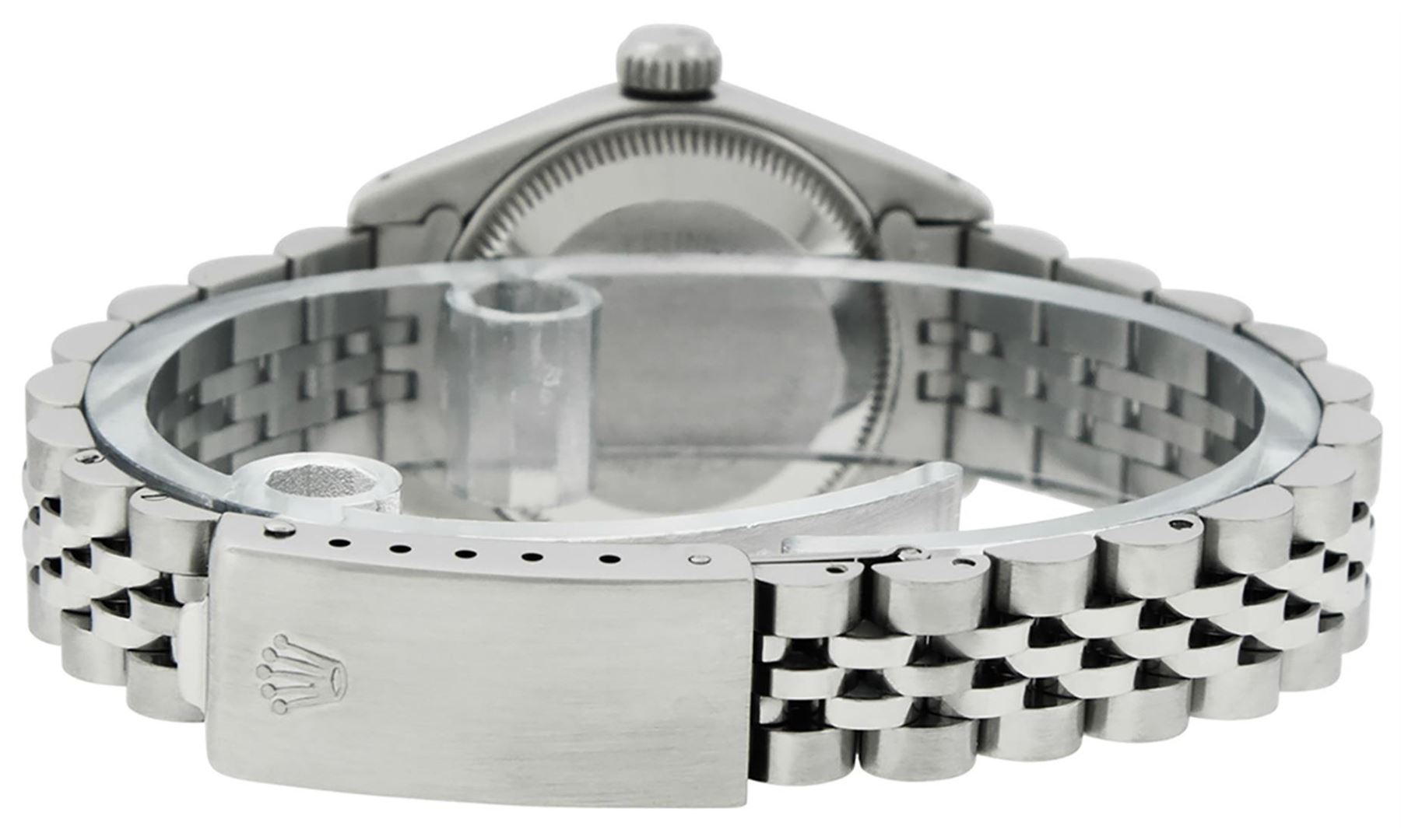 One Ladies Stainless Steel Rolex Datejust Polished Bright with Satin Finish, Serviced & Electronically Tested, Stainless Steel Case: 26mm, Stainless Steel Crown, Bezel: 14K Fluted Bezel. Custom Crystal: New Acrylic Cyclops Lens. Custom Hands: New Luminescent Hands. Movement: Automatic Winding Movement. Custom Dial: Tahitian Mother Of Pearl Roman Dial. Date Window: 3 O'Clock Position Date Display, Model: Datejust. Condition: G-6 Extra Fine. Bracelet: Stainless Steel Jubilee Band. Bright Polish & Satin Finish. 6.0 Inch Length, Adjustable. Standard Clasp, With Rolex Logo. This Watch Has Been Serviced Time Tested And Is In Excellent Condition It Is Free Of All Scratches And Dents.