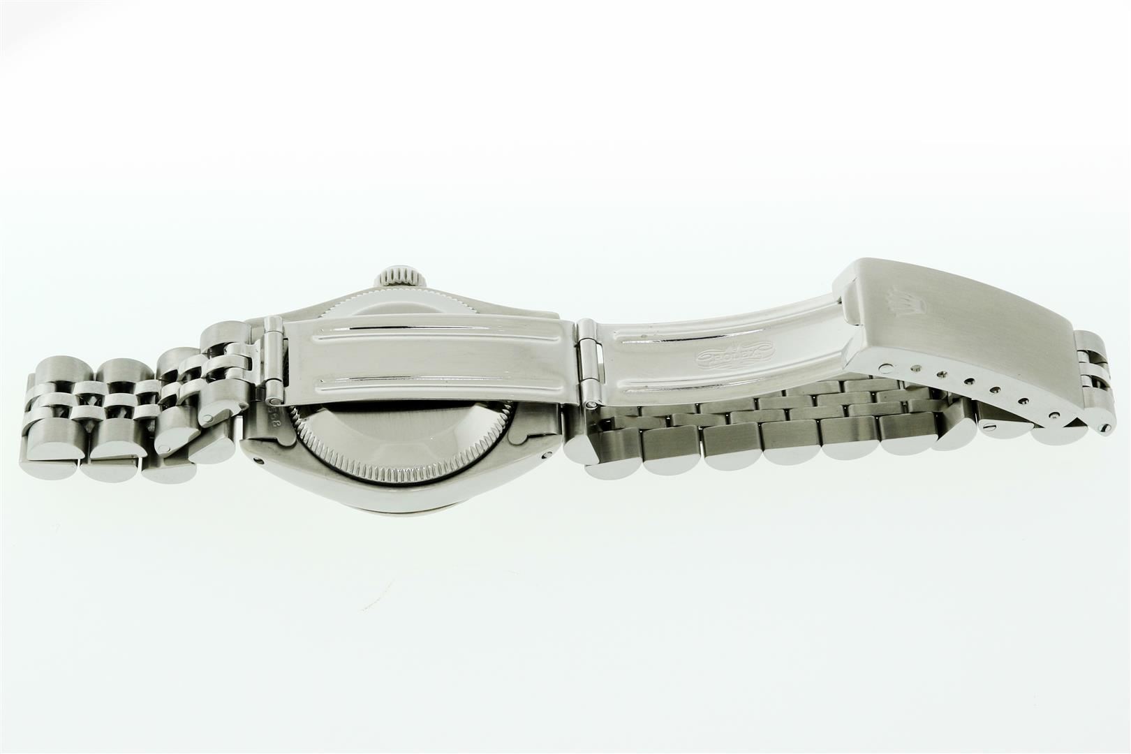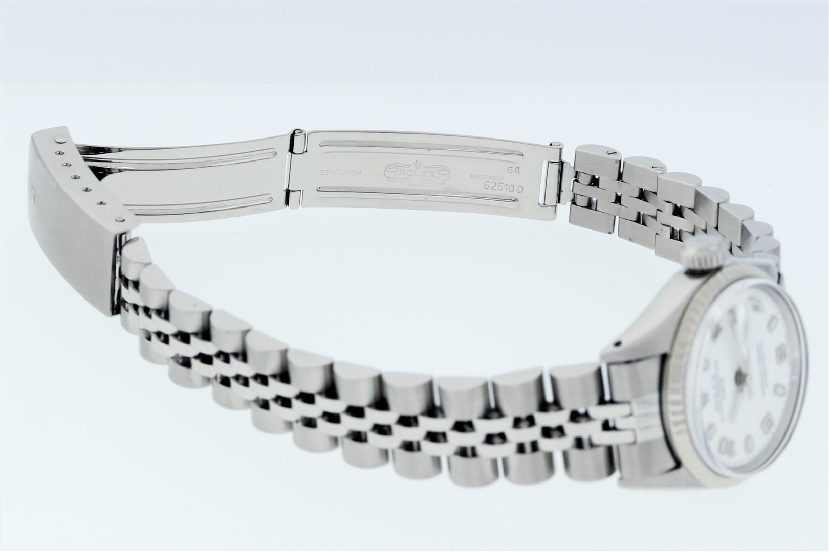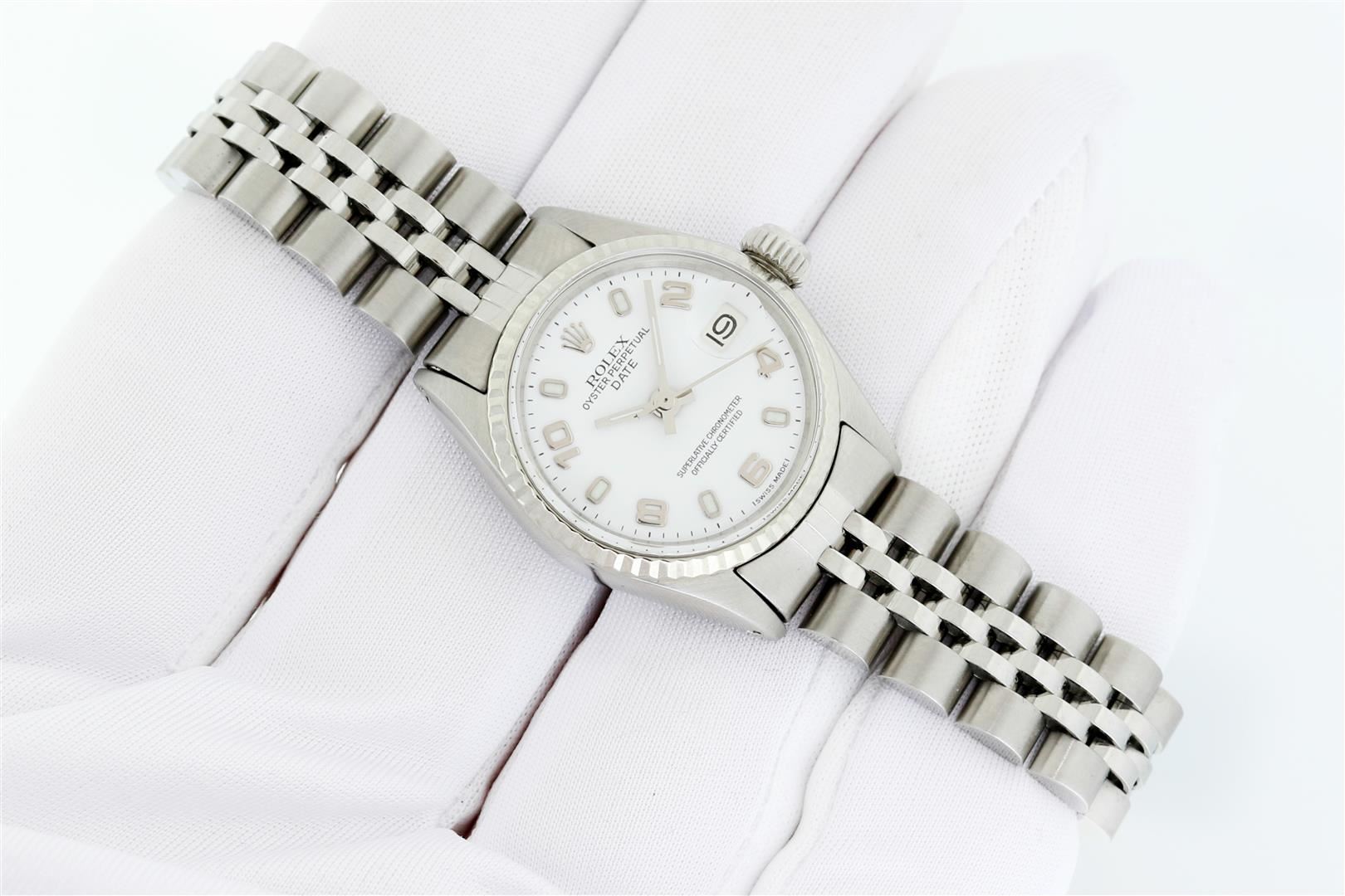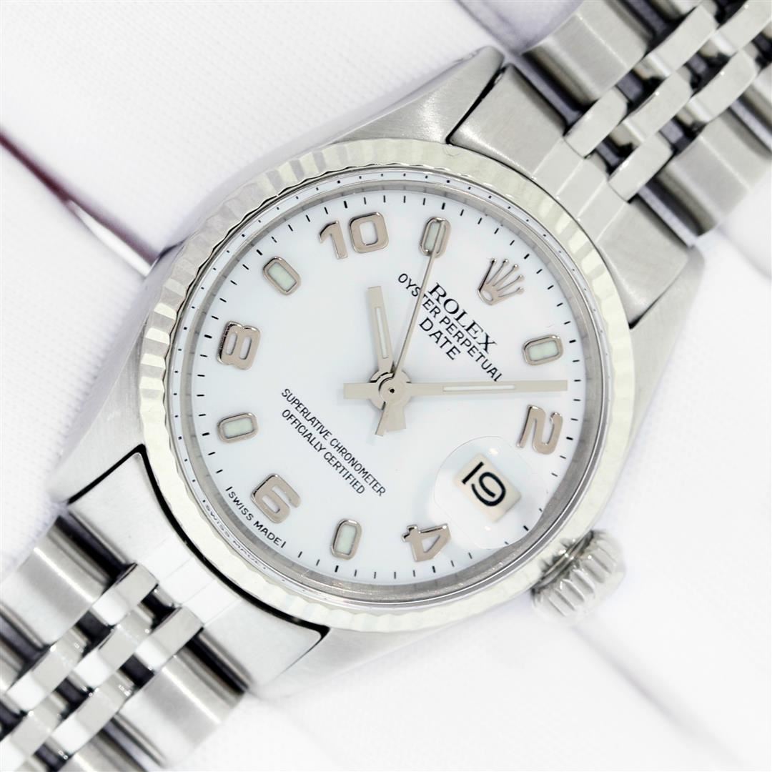 One Ladies Pre Owned Stainless Steel Rolex Date Polished Bright with Satin Finish, Serviced & Electronically Tested, Rolex Stainless Steel Case: 26mm, Rolex Stainless Steel Crown, Rolex Bezel: Rolex White Gold Fluted Bezel, Custom Crystal: New Acrylic Plastic Crystal. Custom Hands: New Luminescent Hands. Rolex Movement: Automatic Winding Movement 1161. Rolex Dial: White Arabic Dial. Date Window: 3 O'Clock Position Date Display, Model: Datejust. Condition: G-6 Extra Fine. Rolex Bracelet: Stainless Steel Jubilee Band. Bright Polish & Satin Finish. 6.00 Inches Length, Adjustable. Standard Clasp, With Rolex Logo. This Watch Has Been Serviced Time Tested And Is In Excellent Condition It Is Free Of All Scratches And Dents.