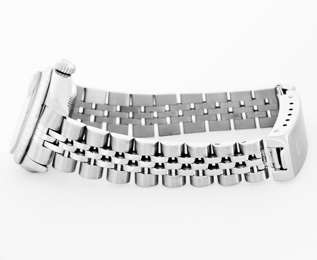 One Ladies Pre Owned Quickset Stainless Steel Rolex Date Polished Bright with Satin Finish, Serviced & Electronically Tested, Rolex Stainless Steel Case: 26mm. Rolex Stainless Steel Crown, Rolex Bezel: Stainless Steel Engine Turn Bezel. Crystal: Sapphire With Magnified Date Window. Hands: Lumi Hands. Rolex Movement: Quickset Automatic Winding Movement 2235. Rolex Dial: White Arabic With Dash Track. Date Window: 3 O'Clock Position Date Display, Model: Sapphire Quickset Datejust. Condition: G-6 Extra Fine. Rolex Bracelet: Stainless Steel Jubilee Band. Bright Polish & Satin Finish. 6.0 Inch Length, Adjustable. Standard Clasp, With Rolex Logo. This Watch Has Been Serviced Time Tested And Is In Excellent Condition It Is Free Of All Scratches And Dents.